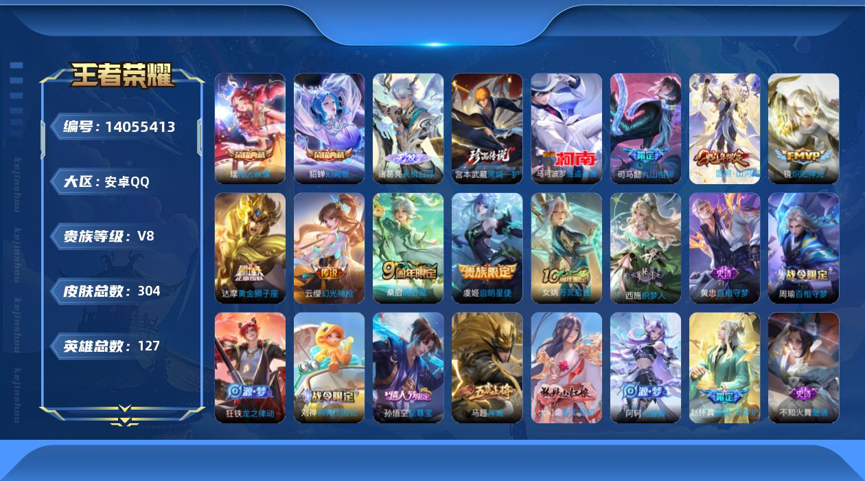 [14055413]贵族8-金标影、金标雅典娜-万战影-改名卡2-水晶0-总皮304-典藏2-传说8-无双1-珍品无双0-珍品传说2 安卓手q308区营地id1835637605最强王者【珍品传说皮肤】:黑崎一护怪盗基德【无双皮肤】:天机白泽【荣耀典藏】:拾光映像幻阙歌【优质限定皮肤】:至尊宝神威【传说皮肤】:神树通天九山相柳启明星使黄金狮子座愿照·山河定幻光神呛炽阳神光鸣野