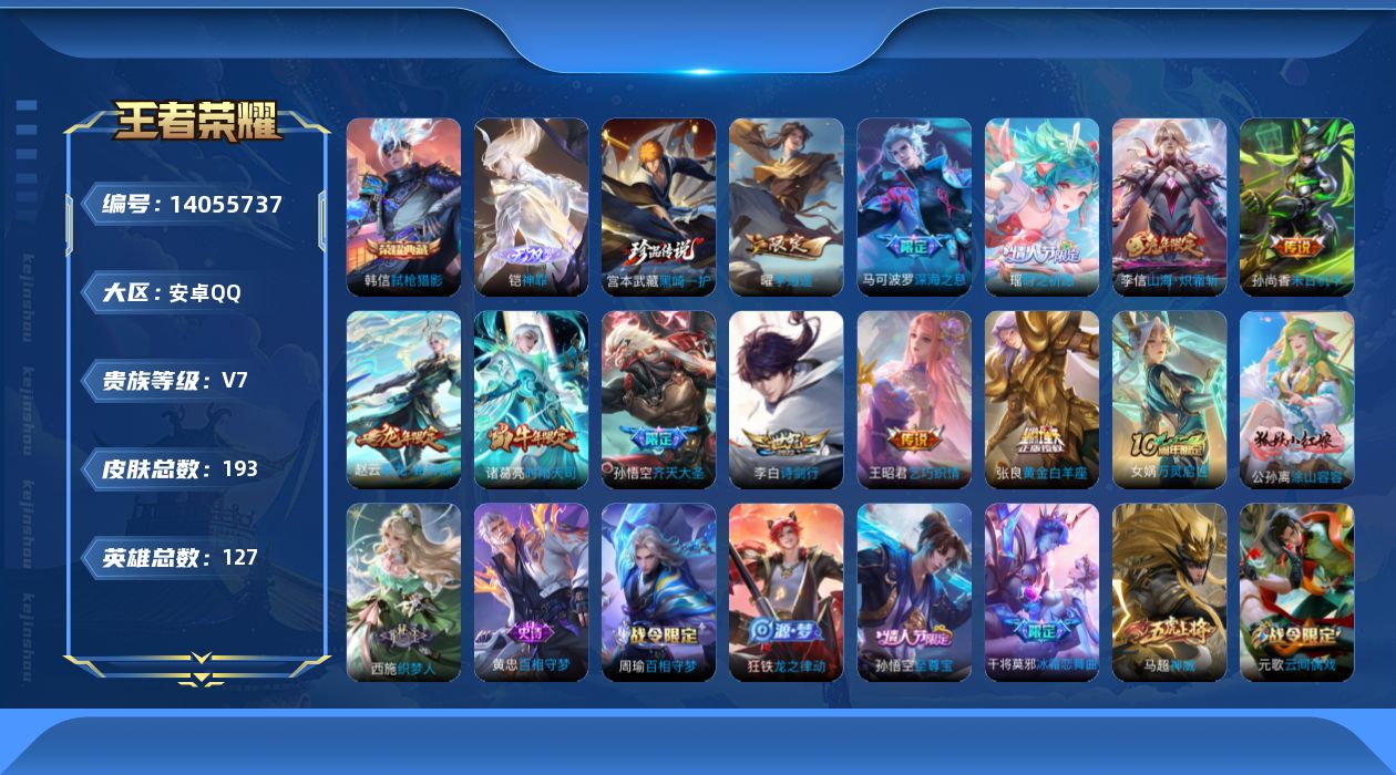[14055737]贵族7 王者28星 贵族积分44851 安卓手q335区193皮1典藏12传说1无双1珍品传说v7 营地id1837352712无双王者【珍品传说皮肤】:黑崎一护【无双皮肤】:神罪【荣耀典藏】:弑呛猎影【优质限定皮肤】:至尊宝山海·炽霜斩瑶时之祈愿神威【传说皮肤】:神树通天末日机甲乞巧织情时雨天司李 黄金白羊座诗剑行乘龙·铭钟鼎山海·炽霜斩齐天大圣