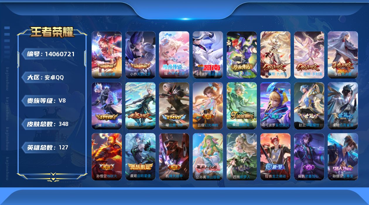 [14060721]皇冠号 11000赵云 贵族8-贵族积分58589-改名卡0-水晶0-总皮348-典藏2-传说14-无双0-珍品无双0-珍品传说3-赵云全皮-鬼谷子全皮-影全皮 安卓手q14区348皮2典藏14传说0无双3珍品传说v8 营地id477180143至尊星耀ii【珍品传说皮肤】:大耳狗之梦时之奇旅怪盗基德【荣耀典藏】:天鹅之梦拾光映像【优质限定皮肤】:神威至尊宝凤求凰【