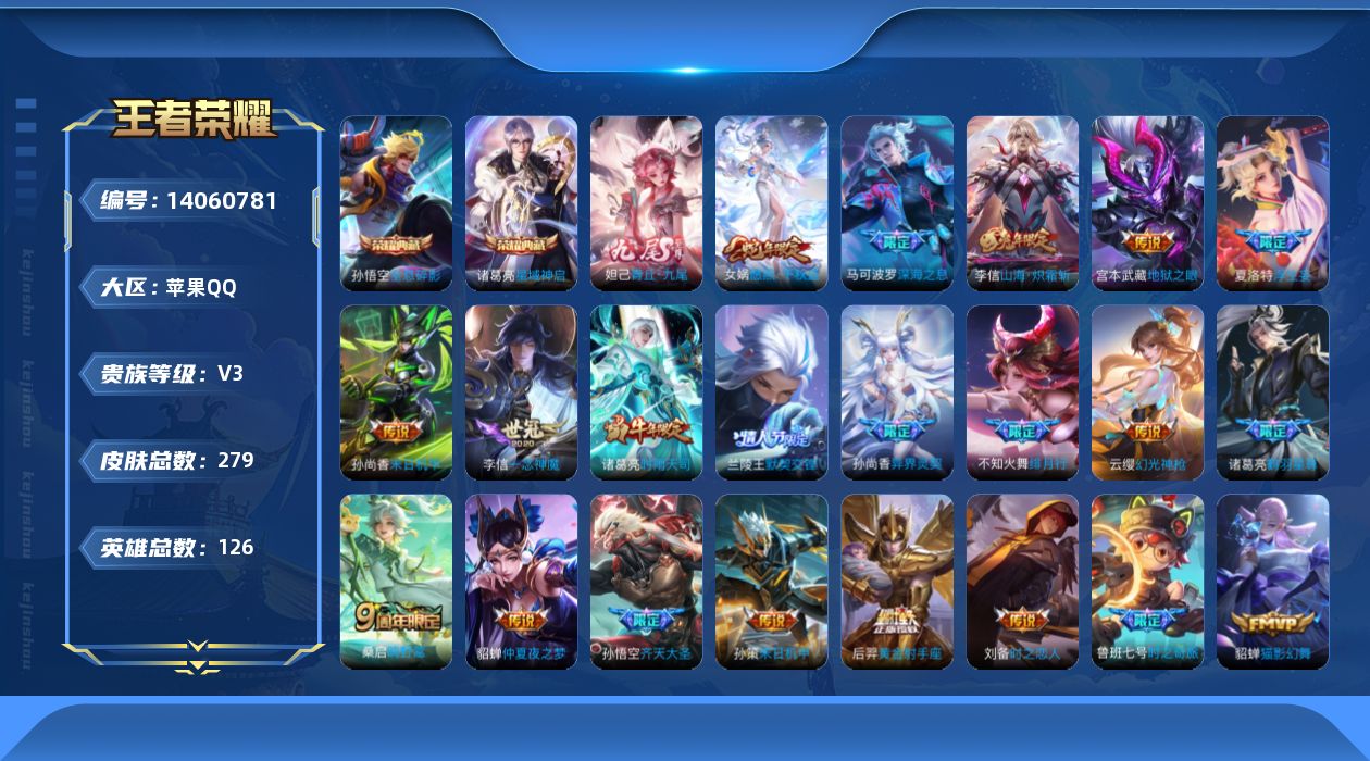 [14060781]可二次 贵族3-279皮2典藏30传说1无双-两个全皮英雄 金标诸葛亮 金标兰陵王 冰雪奇缘小兵皮肤 苹果手q97区279皮2典藏30传说1无双v3 营地id231355031尊贵铂金iv【无双皮肤】:青丘·九尾【荣耀典藏】:星域神启全息碎影【优质限定皮肤】:山海·炽霜斩至尊宝【传说皮肤】:愿照·千秋盛幻光神呛鸣野蒿齐天大圣地狱之眼时之恋