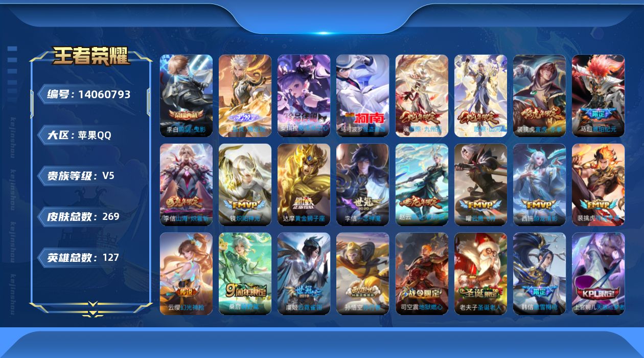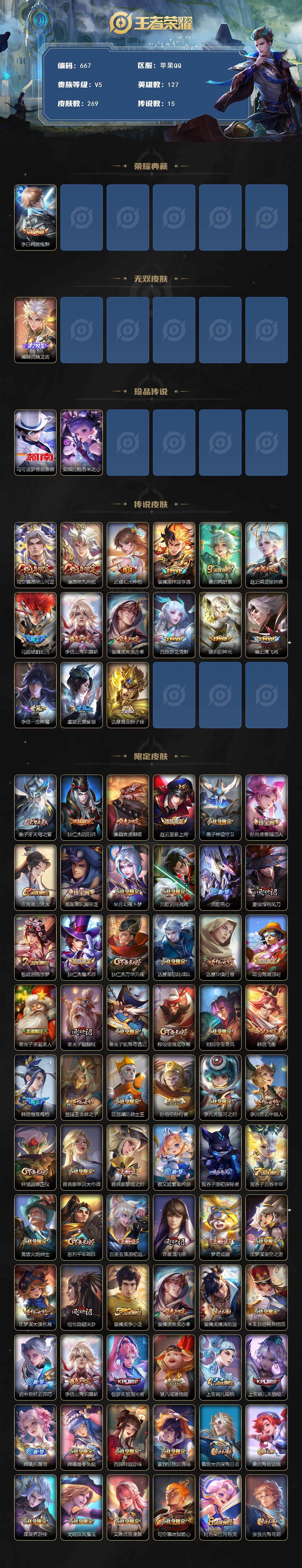 [14060793]贵族5-269皮1典藏15传说1无双2珍品传说-六个全皮英雄 苹果手q144区269皮1典藏15传说1无双2珍品传说v5 营地id2113288156尊贵铂金ii【珍品传说皮肤】:怪盗基德酷洛米之心【无双皮肤】:器灵·螭龙剑【荣耀典藏】:鸣剑·曳影【优质限定皮肤】:山海·炽霜斩【传说皮肤】:一念神魔愿照·九州拓幻光神呛愿照·山河定祥瑞亨通山海·炽霜斩云