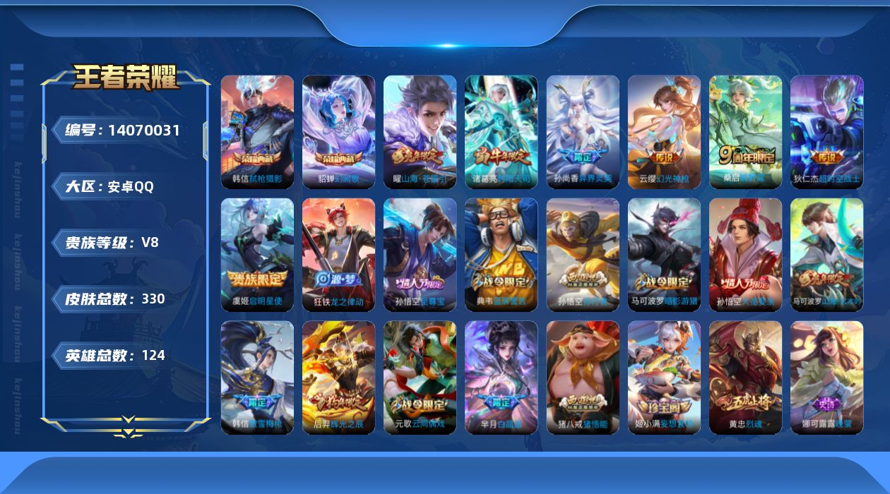 [14070031]贵族8 王者2 贵族积分65320 安卓q-v8-最强王者段位-124英雄-330皮肤-2典藏-0珍品无双-0无双-0珍品传说-7传说-92史诗 荣耀典藏:貂蝉幻阙歌,韩信弑呛猎影 传说皮肤:云缨幻光神呛,桑启鸣野蒿,曜山海苍雷引,孙尚香异界灵契,诸葛亮时雨天司,虞姬启明星使,狄仁杰超时空战士 营地id:479811302
