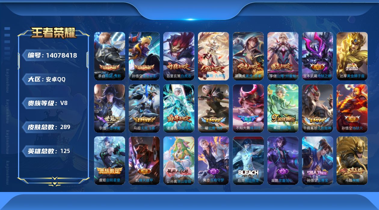[14078418]贵族8 王者32星 贵族积分69634 安卓q-v8-最强王者段位-125英雄-289皮肤-2典藏-0珍品无双-0无双-0珍品传说-16传说-94史诗 荣耀典藏:孙悟空全息碎影,李白鸣剑曳影 传说皮肤:澜愿照九州拓,桑启鸣野蒿,李信山海炽霜斩,不知火舞绯月行,马超无双飞将,裴擒虎寅虎赤拳,诸葛亮时雨天司,铠绛天战甲,虞姬启明星使,曜云鹰飞将,李信一念神魔,干将莫邪久胜战神,达