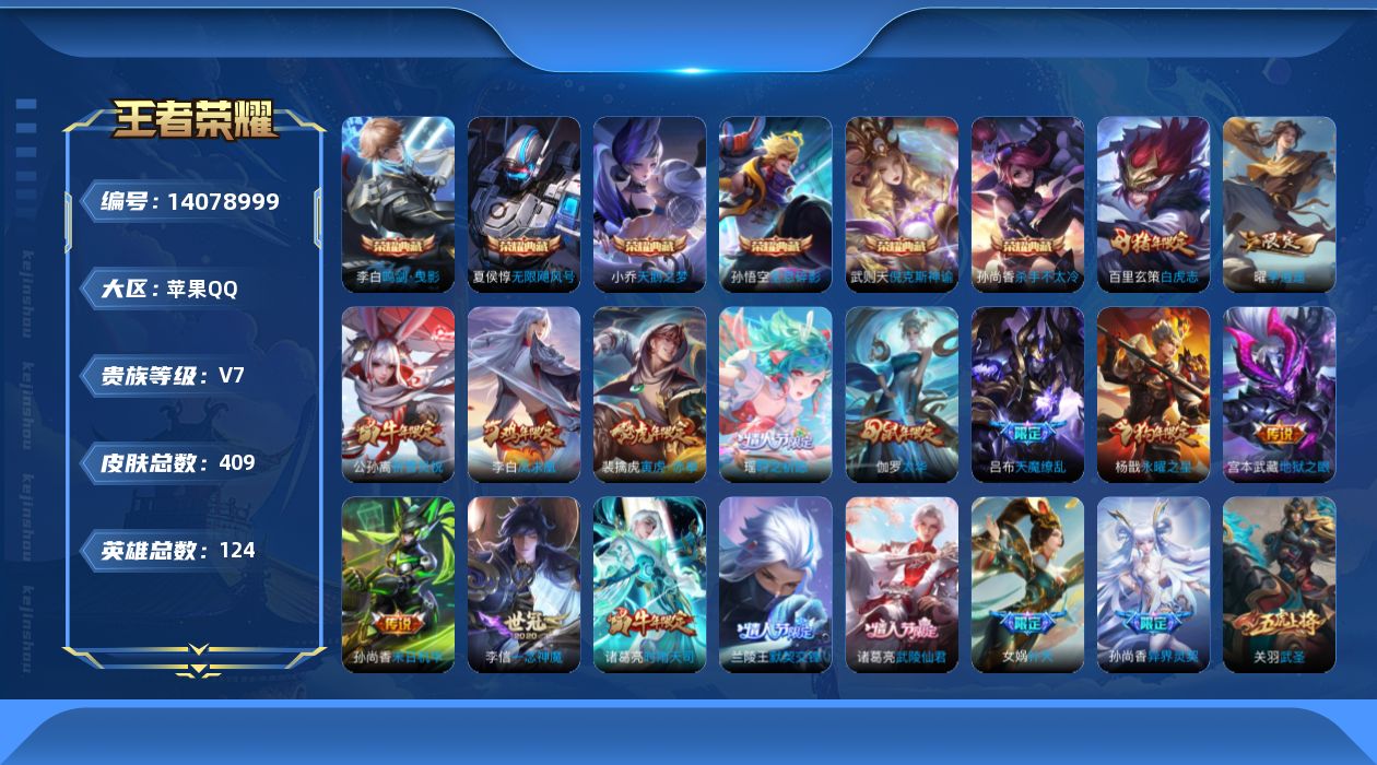 [14078999]贵族10 黄金1 贵族积分195045 苹果q-v7-荣耀黄金i段位-124英雄-409皮肤-6典藏-0珍品无双-0无双-0珍品传说-38传说-145史诗 荣耀典藏:武则天英雄,孙悟空全息碎影,武则天倪克斯神谕,夏侯惇无限飓风号,小乔天鹅之梦,孙尚香杀手不太冷,李白鸣剑曳影 传说皮肤:艾琳觅芳踪,不知火舞绯月行,露娜启示之音,女娲补天,瑶时之祈愿,裴擒虎寅虎赤拳,鲁班七号寅虎