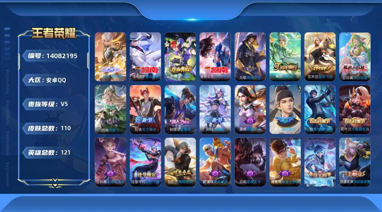 [14082195]贵族5-改名卡0-水晶0-总皮110-典藏0-传说4-无双1-珍品无双0-珍品传说3孙权全皮 安卓手q309区110皮0典藏4传说1无双3珍品传说v5 营地id1664851038至尊星耀ii【珍品传说皮肤】:时之奇旅怪盗基德江户川柯南【无双皮肤】:器灵·螭龙剑【优质限定皮肤】:至尊宝【传说皮肤】:神树通天诡秘之主冠军飞将鸣野蒿【史诗皮肤】:龙之律动原初追逐者万