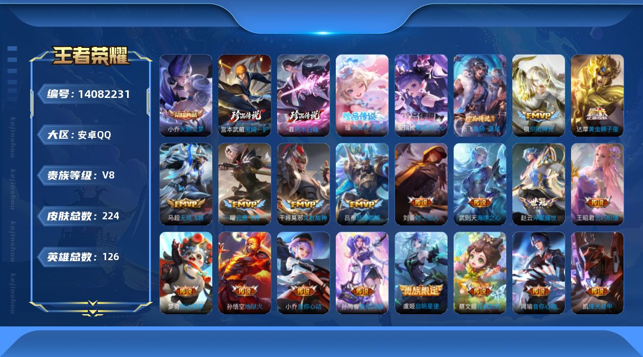 [14082231]贵族8-改名卡12灵宝改名卡0-全皮英雄2-水晶0-总皮224-典藏1-传说18-无双0-珍品无双0-珍品传说5-棉花糖聚会天幕 小女号 可二次 安卓手q260区224皮1典藏18传说0无双5珍品传说v8 营地id530396153至尊星耀v【珍品传说皮肤】:朽木白哉黑崎一护酷洛米之心大耳狗之梦兔狲·蓬尾【荣耀典藏】:天鹅之梦【优质限定皮肤】:无双飞将【传说皮肤】:音