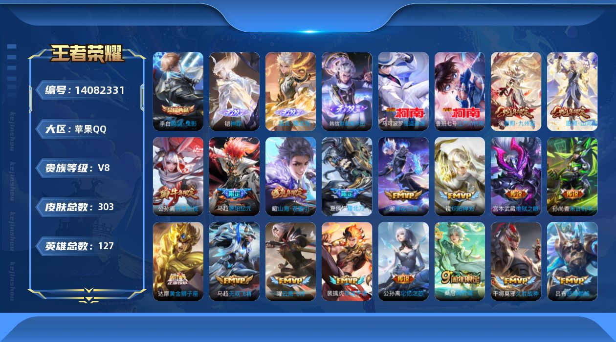 [14082331]贵族8-改名卡0-水晶0-总皮303典藏1-传说26-无双3-珍品无双0-珍品传说2全皮英雄7 哪吒战力10406 苹果手q139区303皮1典藏26传说3无双2珍品传说v8 营地id529170017无双王者【珍品传说皮肤】:江户川柯南怪盗基德【无双皮肤】:神罪器灵·螭龙剑群星魔术团【荣耀典藏】:鸣剑·曳影【优质限定皮肤】:祈雪灵祝神威无双飞将山海·苍雷引【传说