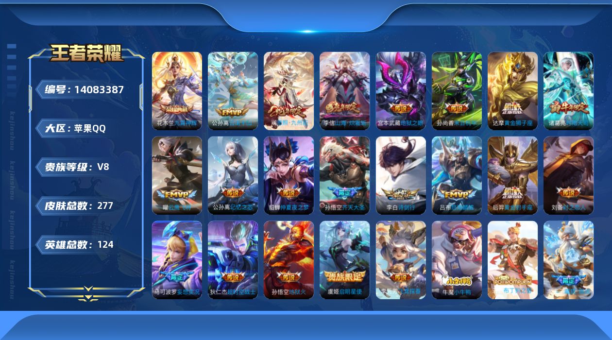 [14083387]贵族8 星耀4 苹果手q127区277皮1典藏20传说0无双 营地id231251950v8至尊星耀iv【荣耀典藏】:九霄神辉【优质限定皮肤】:山海·炽霜斩【传说皮肤】:黄金狮子座妄想实况时之恋人云诺千山怒海麟威诗剑行启明星使愿照·九州拓超时空战士飞鸢探春地狱之眼记忆之芯黄金射手座山海·炽霜斩齐天大圣云鹰飞将仲夏夜之梦末日机甲时雨