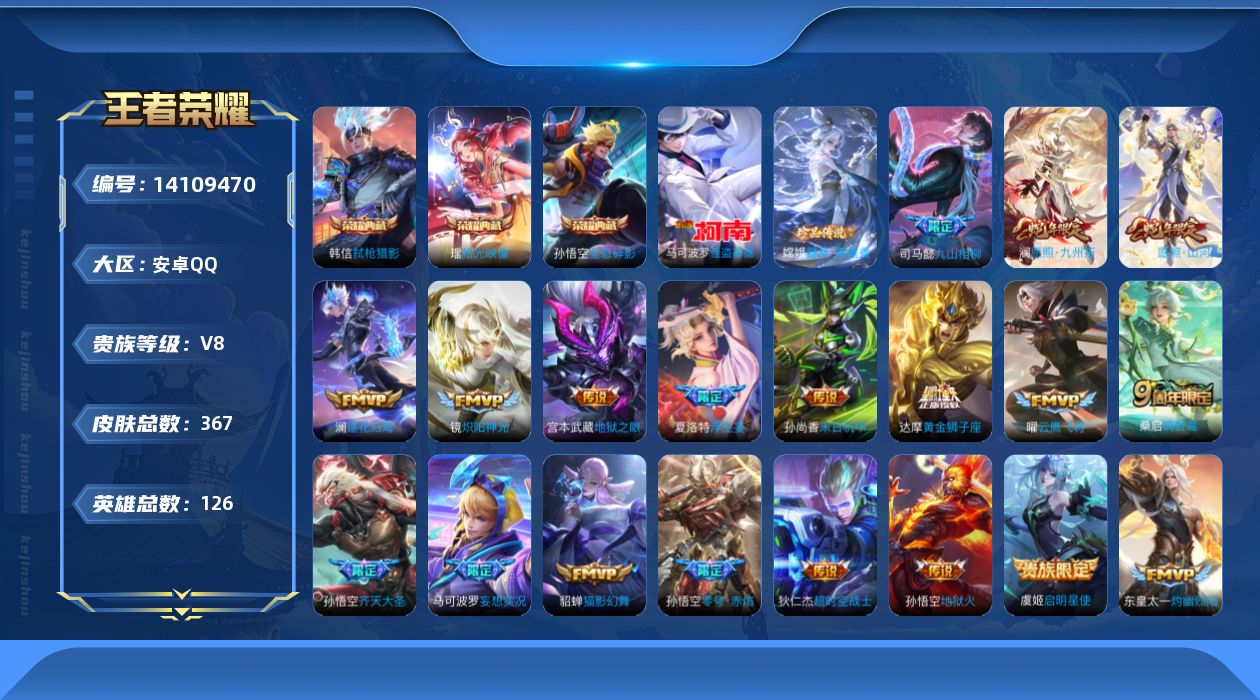 [14109470]贵族8 钻石1 安卓手q171区367皮3典藏19传说0无双2珍品传说 营地id1850246192v8永恒钻石i【珍品传说皮肤】:器灵·落星盏怪盗基德【荣耀典藏】:拾光映像全息碎影弑呛猎影【优质限定皮肤】:至尊宝【传说皮肤】:九山相柳妄想实况超时空战士地狱之眼愿照·山河定愿照·九州拓启明星使齐天大圣鸣野蒿末日机甲零号·赤焰猫影幻舞地狱火黄金狮