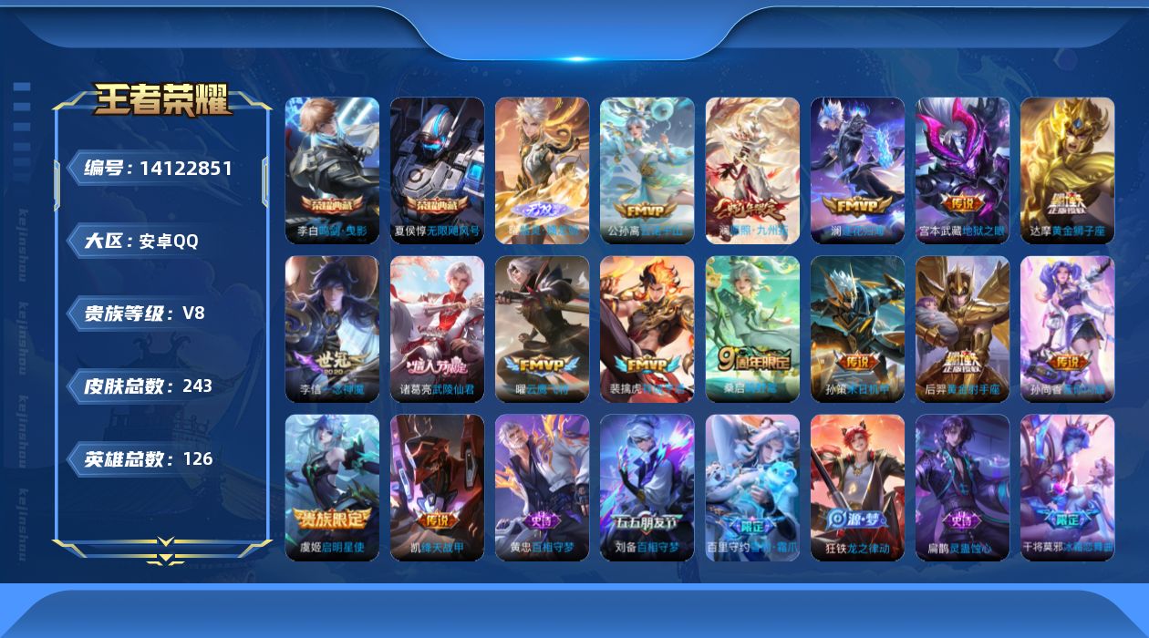 [14122851]贵族8-243皮2典藏15传说1无双-影全皮 安卓手q161区243皮2典藏15传说1无双v8 营地id99058414绝世王者【无双皮肤】:器灵·螭龙剑【荣耀典藏】:鸣剑·曳影无限飓风号【优质限定皮肤】:神威【传说皮肤】:云诺千山黄金狮子座启明星使一念神魔绛天战甲末日机甲愿照·九州拓祥瑞亨通音你闪耀逐花归海地狱之眼黄金射手座鸣野蒿云鹰飞将