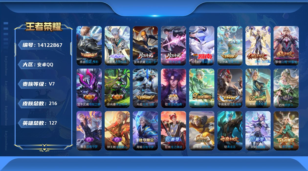 [14122867]贵族8-216皮1典藏10传说1无双3珍品传说-5个全皮英雄 安卓手q339区216皮1典藏10传说1无双3珍品传说v7 营地id1837022696至尊星耀iii【珍品传说皮肤】:黑崎一护朽木白哉怪盗基德【无双皮肤】:天机白泽【荣耀典藏】:鸣剑·曳影【优质限定皮肤】:无双飞将山海·炽霜斩【传说皮肤】:地狱之眼神树通天久胜战神云诺千山愿照·山河定鸣野蒿