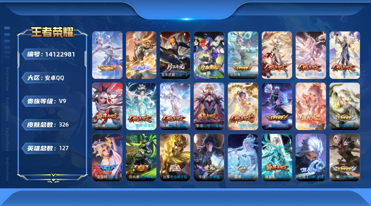 [14122981]贵族9-326皮1典藏35传说1无双2珍品传说-5个英雄全皮 安卓手q158区326皮1典藏35传说1无双2珍品传说v9 营地id498137385最强王者【珍品传说皮肤】:黑崎一护时之奇旅【无双皮肤】:器灵·螭龙剑【荣耀典藏】:最初的交响【优质限定皮肤】:祈雪灵祝山海·炽霜斩至尊宝【传说皮肤】:末日机甲妄想实况霜月吟云诺千山浮生妄续相思星之鸣奏黄金