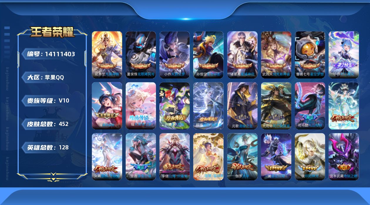 [14111403]全皮英雄 李信 司马懿 贵族10 王者41 改名卡6 貂蝉金色仲夏夜 苹果手q113区452皮7典藏33传说2无双3珍品传说v10 营地id325696585至圣王者【珍品传说皮肤】:大耳狗之梦器灵·落星盏时之奇旅【无双皮肤】:时之魔女瑶真我赫兹【荣耀典藏】:星域神启无限飓风号倪克斯神谕全息碎影星空梦想天鹅之梦九霄神辉【优质限定皮肤】:山海·