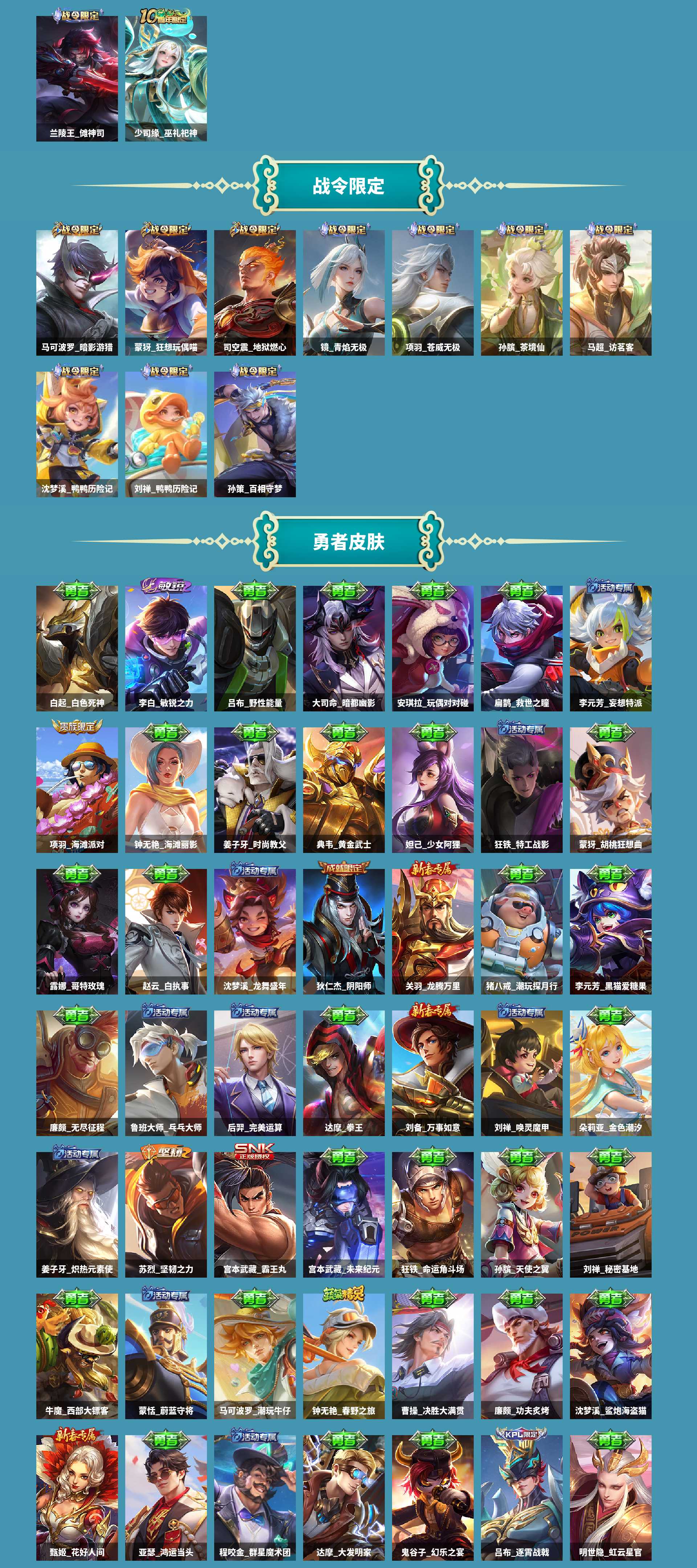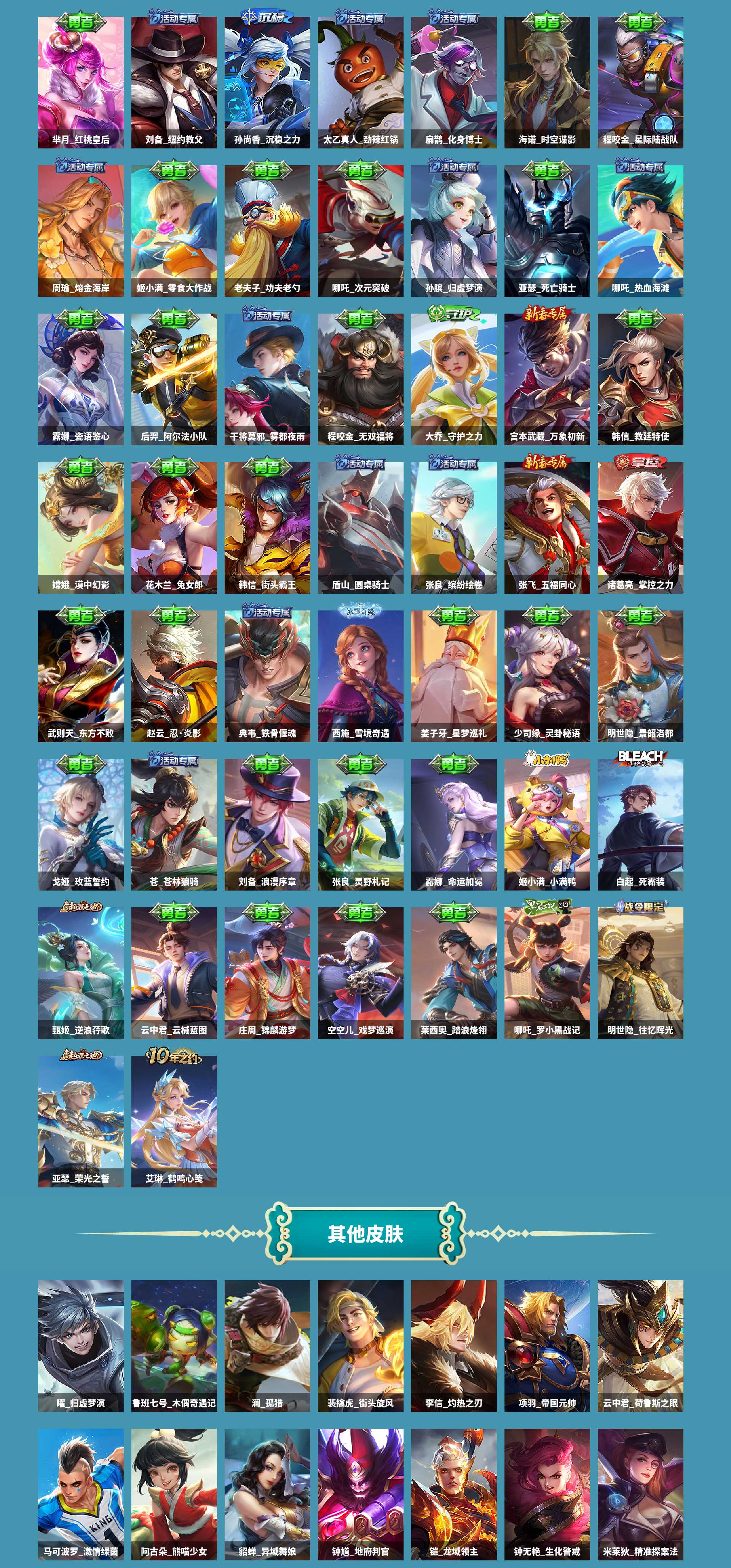 al633062 【特价256皮传说皮肤:后裔神树通天,澜愿照九州拓,云缨幻光神呛,桑启鸣野蒿,铠曙光守护者】 皮肤数256 皮肤价值157976 传说皮肤数4 史诗皮肤数70 英雄数125 营地id1740363702 贵族等级【文本】贵族6级 【贵族6级】 【可排位】 【是】 内测皮肤3 年限皮肤1 限定皮肤65 赛季限定27 史诗皮肤71 战令限定14 勇者皮肤129 其他皮肤50 内测皮肤:高渐离玩趣恶龙,干将莫邪胡桃夹子,孙尚香蔷薇恋人; 年限皮肤:澜愿照九州拓; 限定皮肤:少司缘巫礼祀神,司空震地狱燃心,甄姬游园惊梦,西施织梦人,鬼谷子克喵,白起死霸装,姬小满小满鸭,蒙犽狂想玩偶喵,狂铁龙之律动,狄仁杰魔术师,蒙恬荣光圣徽,钟馗虚灵犬护,苏烈春野闲踪,马可波罗暗影游猎,阿轲化蝶舞,马超访茗客,孙膑茶境仙,澜愿照九州拓,太乙真人谧流熔炉,牛魔星界战将,百里玄策原初追逐者,吕布逐霄战戟,东皇太一噬灭天穹,高渐离玩趣恶龙,桑启鸣野蒿,杨玉环遇见飞天,姜子牙天穹之誓,镜青焰无极,项羽苍威无极,刘邦剑破天穹,沈梦溪龙舞盛年,嫦娥漠中幻影,云中君纤云弄巧,鬼谷子天穹祈灯,蒙犽百解令,嫦娥拒霜思,阿古朵江河有灵,张良古海寻踪,鲁班大师探海日志,赵云皇家上将,孙悟空至尊宝,项羽海滩派对,干将莫邪胡桃夹子,裴擒虎擒涛扼浪,桑启海盐诗旅,元歌无心,鬼谷子五谷丰年,李元芳云中旅人,沈梦溪大漠名商,兰陵王金庭之子,达摩沙漠行僧,上官婉儿梁祝,孙尚香蔷薇恋人,庄周高山流水,苏烈千军破阵,钟馗驱傩正仪,程咬金演武夺筹,狄仁杰万华元夜,裴擒虎李小龙,鬼谷子原初探秘者,老夫子醍醐杖,狄仁杰阴阳师,狄仁杰鹰眼统帅,明世隐疑决卦,弈星混沌棋; 赛季限定:亚瑟荣光之誓,甄姬逆浪荇歌,蒙恬荣光圣徽,钟馗虚灵犬护,太乙真人谧流熔炉,牛魔星界战将,百里玄策原初追逐者,东皇太一噬灭天穹,姜子牙天穹之誓,刘邦剑破天穹,鬼谷子天穹祈灯,张良古海寻踪,鲁班大师探海日志,裴擒虎擒涛扼浪,桑启海盐诗旅,李元芳云中旅人,沈梦溪大漠名商,兰陵王金庭之子,达摩沙漠行僧,苏烈千军破阵,钟馗驱傩正仪,程咬金演武夺筹,狄仁杰万华元夜,鬼谷子原初探秘者,老夫子醍醐杖,明世隐疑决卦,弈星混沌棋; 史诗皮肤:孙策猫狗日记,大乔猫狗日记,少司缘巫礼祀神,橘右京修罗,司空震地狱燃心,杨戬天秀启明,司马懿暗渊魔法,兰陵王傩神司,甄姬游园惊梦,莱西奥光弋星穹,嬴政暗夜贵公子,兰陵王暗隐猎兽者,西施织梦人,公孙离涂山容容,黄忠百相守梦,周瑜百相守梦,廉颇地狱岩魂,蒙犽狂想玩偶喵,狂铁龙之律动,狄仁杰魔术师,夏侯惇乘风破浪,刘禅鸭鸭历险记,蒙恬荣光圣徽,阿古朵_布丁狗之约,马可波罗暗影游猎,阿轲化蝶舞,孙膑茶境仙,诸葛亮黄金分割率,露娜紫霞仙子,牛魔星界战将,刘禅绅士熊喵,百里玄策原初追逐者,张飞乱世虎臣,曹操幽灵船长,花木兰水晶猎龙者,杨玉环遇见飞天,伽罗箭羽风息,安琪拉心灵骇客,镜青焰无极,宫本武藏鬼剑武藏,李白千年之狐,娜可露露晚萤,铠曙光守护者,妲己女仆咖啡,云中君纤云弄巧,蒙犽百解令,嫦娥拒霜思,百里守约特工魅影,程咬金功夫厨神,甄姬冰雪圆舞曲,阿古朵江河有灵,刘禅电玩爆裂旋风,赵云皇家上将,孙悟空至尊宝,吕布圣诞狂欢,嬴政摇滚巨星,阿轲节奏热浪,元歌无心,孙尚香水果甜心,刘禅天才门将,鬼谷子五谷丰年,白起星夜王子,刘邦德古拉伯爵,墨子金属风暴,李元芳逐浪之夏,上官婉儿梁祝,孙尚香蔷薇恋人,庄周高山流水,裴擒虎李小龙,狄仁杰鹰眼统帅,妲己魅力维加斯; 战令限定:司空震地狱燃心,兰陵王傩神司,莱西奥光弋星穹,明世隐往忆晖光,孙策