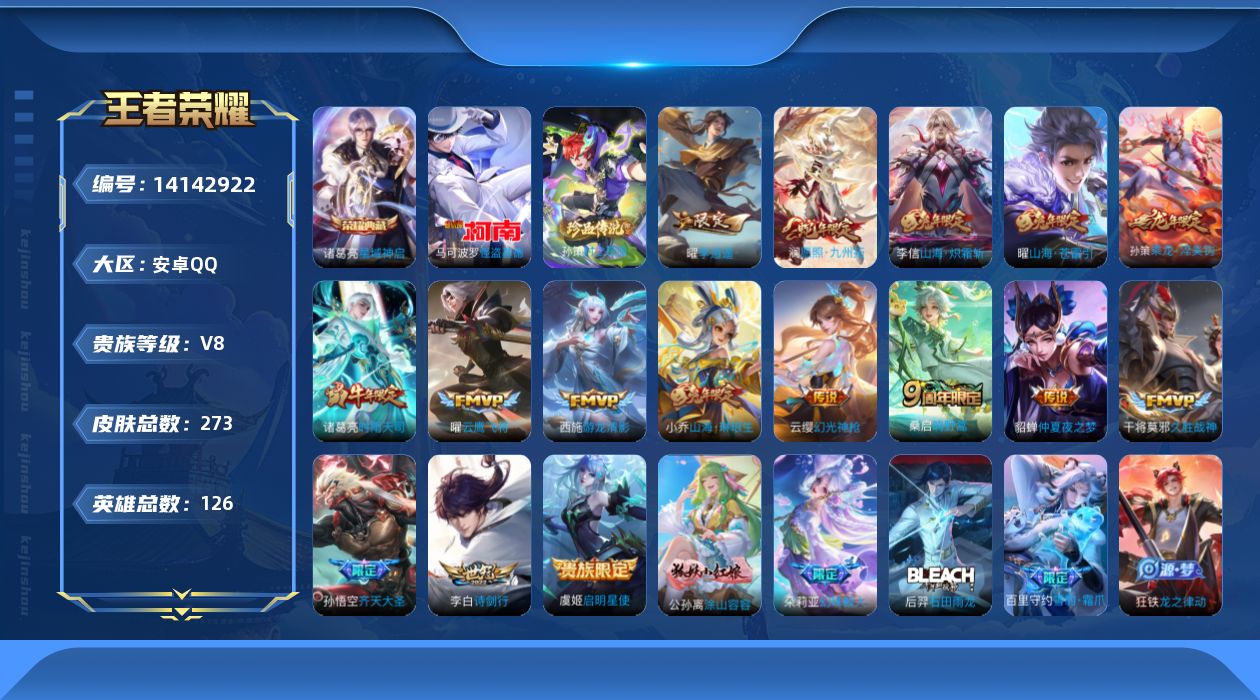 [14142922]贵族8 钻石4 贵族积分63638 安卓手q342区273皮1典藏16传说0无双2珍品传说v8 营地id1753116701永恒钻石iv【珍品传说皮肤】:时之奇旅怪盗基德【荣耀典藏】:星域神启【优质限定皮肤】:山海·琳琅生山海·苍雷引山海·炽霜斩云中君时之祈愿【传说皮肤】:启明星使时雨天司云鹰飞将久胜战神乘龙·淬吴钩游龙清影齐天大圣山海·琳琅