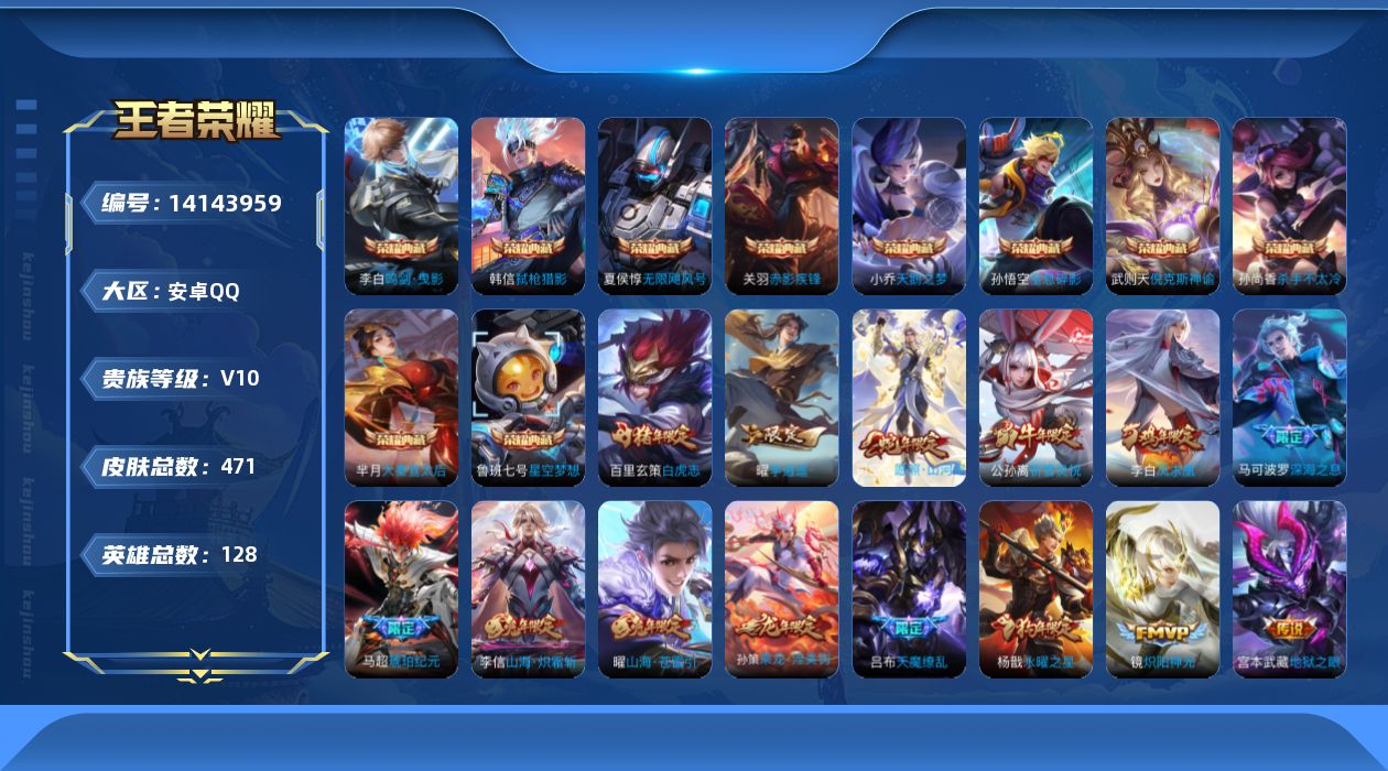 [14143959]战力12401高渐离、11749吕布、10907橘右京、9614司空震 贵族10 王者60星 贵族积分307182 安卓手q261区471皮10典藏47传说0无双v10 营地id422546334荣耀王者【荣耀典藏】:弑呛猎影赤影疾锋鸣剑·曳影倪克斯神谕杀手不太冷无限飓风号大秦宣太后全息碎影天鹅之梦星空梦想【优质限定皮肤】:神威山海·苍雷引山海·炽霜斩