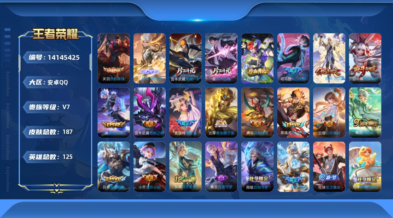 [14145425]可二次 贵族7-金标司空震、达摩、白起、狂铁、司马懿-总皮187-典藏1-传说14-无双1-珍品无双0-珍品传说3-全皮英雄2-财神纳福天幕 安卓手q497区 营地id1658051948绝世王者【珍品传说皮肤】:朽木白哉黑崎一护时之奇旅【无双皮肤】:器灵·螭龙剑【荣耀典藏】:赤影疾锋【优质限定皮肤】:祈雪灵祝神威至尊宝【传说皮肤】:神树通天九山相柳祈雪灵祝地狱