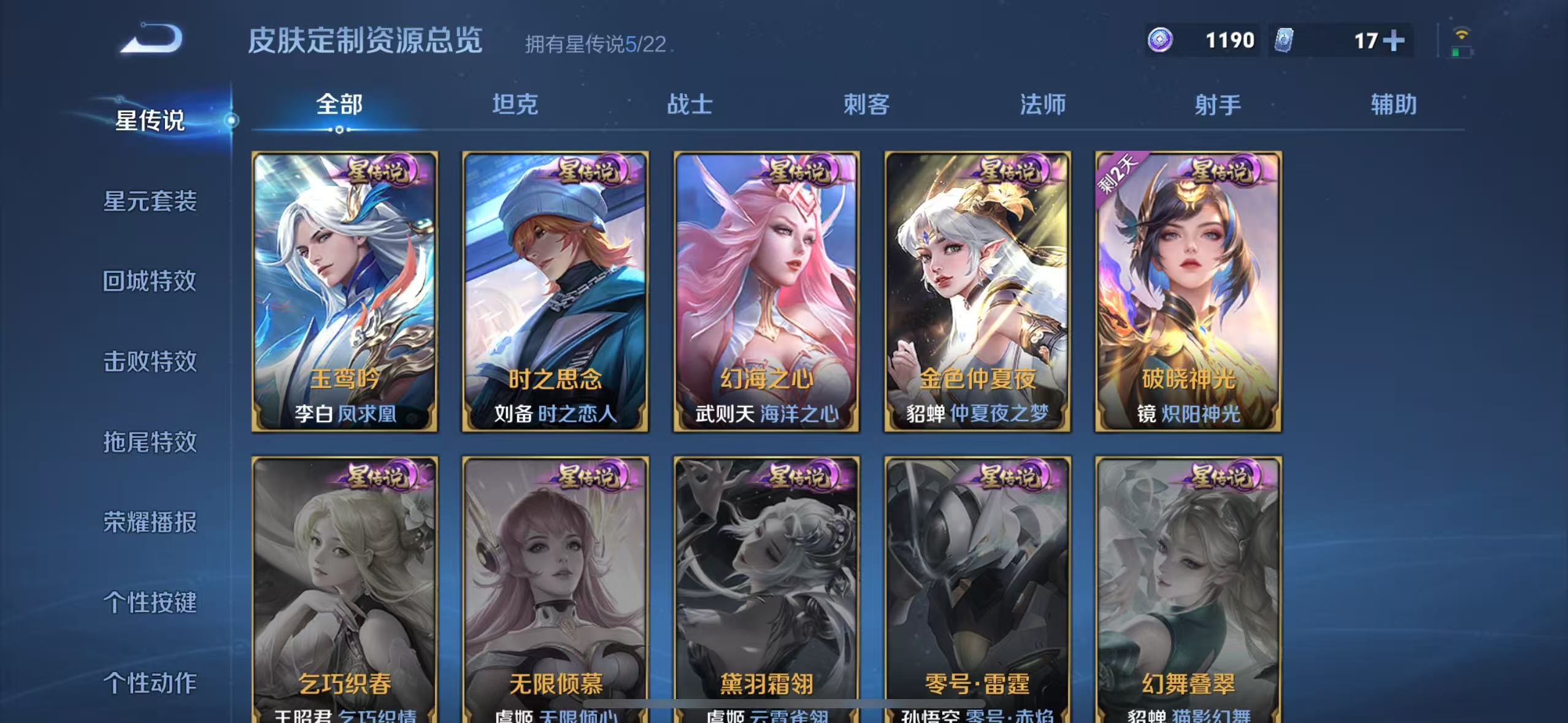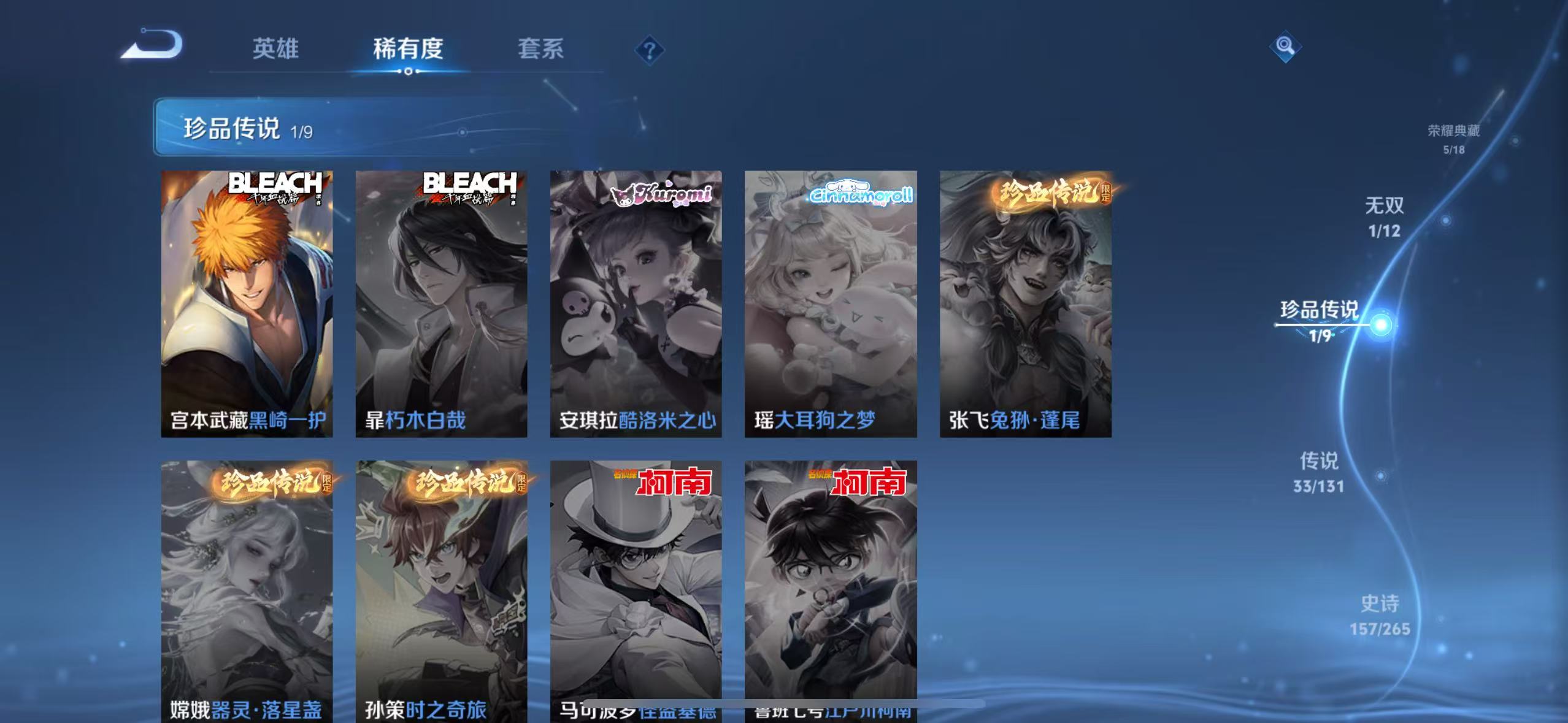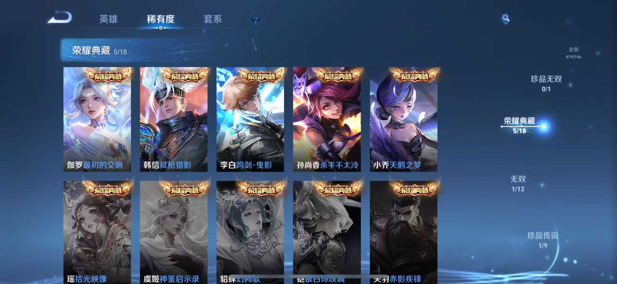 v10-479皮肤 5典藏最初的交响,弑呛猎影,鸣剑·曳影,杀手不太冷,天鹅之梦 1无双神罪 1珍品 黑崎一护 33传说神树通天,九山相柳,寅虎·赤拳,花朝如约,乞巧织情,觅芳踪,愿照·九州拓,愿照·千秋盛,幻光神呛,鸣野蒿,游龙清影,灼幽烈阳,记忆之芯,无双飞将,超时空战士,鹤羽星尊,黄金射手座,地狱火,一念神魔,遇见胡旋,时之祈愿,异界灵契,云鹰飞将,零号·赤焰,炽阳神光,启明星使,时之恋人,凤求凰,久胜战神,云霓雀翎,海洋之心,仲夏夜之梦,末日机甲 157史诗