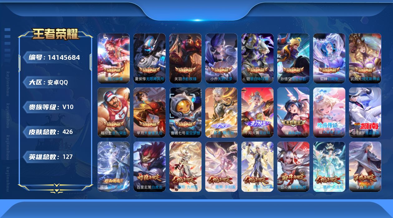 [14145684]贵族10-贵族积分11951-改名3-水晶0-总皮426-典藏11-传说36-无双3-珍品无双0-珍品传说3-全皮英雄9-财神纳福天幕 安卓手q454区426皮11典藏36传说3无双3珍品传说v10 营地id439526438至尊星耀i【珍品传说皮肤】:大耳狗之梦器灵·落星盏怪盗基德【无双皮肤】:器灵·螭龙剑瑶真我赫兹花合斗【荣耀典藏】:拾光映像幻阙歌大秦宣太后
