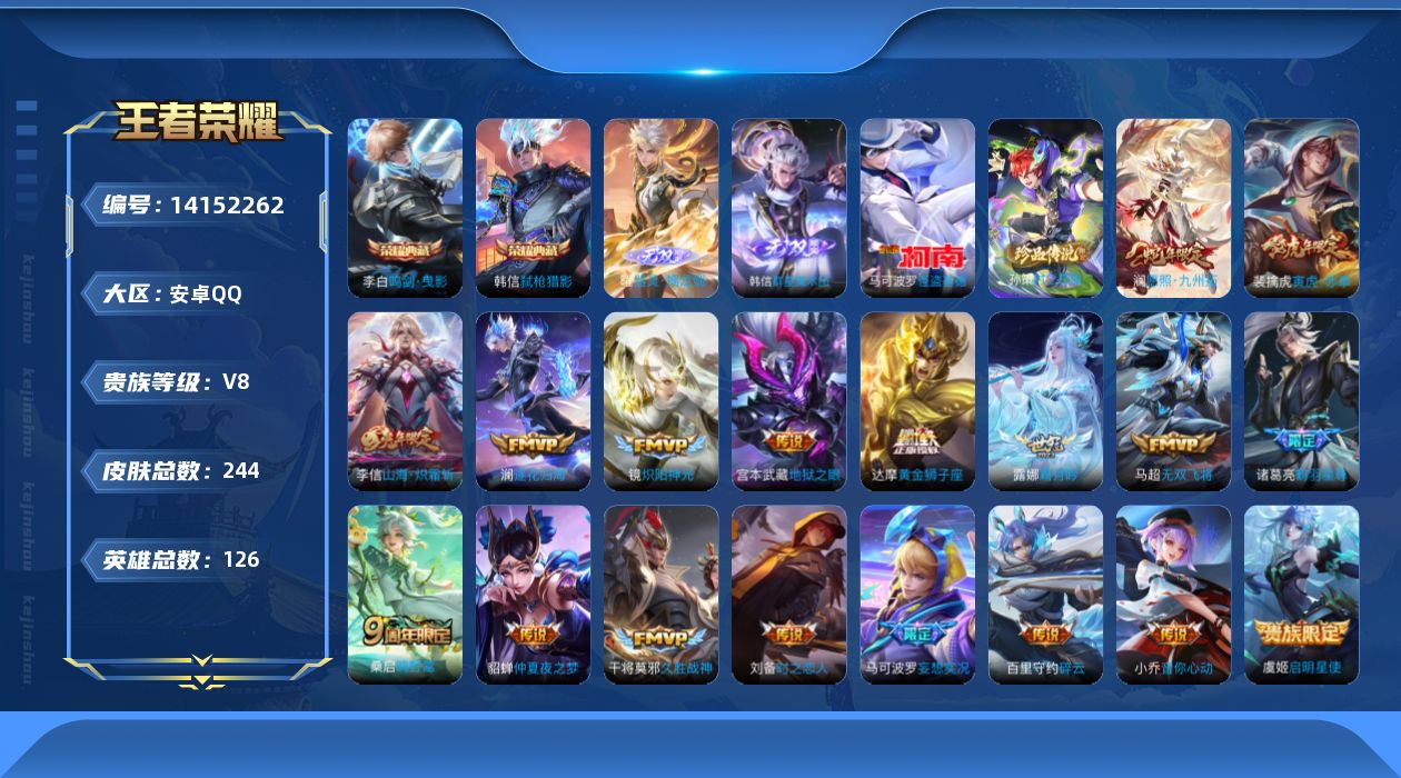 [14152262]打野号 9800镜 8300韩信 贵族8 王者21 贵族积分67290 安卓手q418区244皮2典藏19传说2无双2珍品传说v8 营地id1753195309无双王者【珍品传说皮肤】:时之奇旅怪盗基德【无双皮肤】:群星魔术团器灵·螭龙剑【荣耀典藏】:鸣剑·曳影弑呛猎影【优质限定皮肤】:至尊宝山海·炽霜斩无双飞将云中君时之祈愿【传说皮肤
