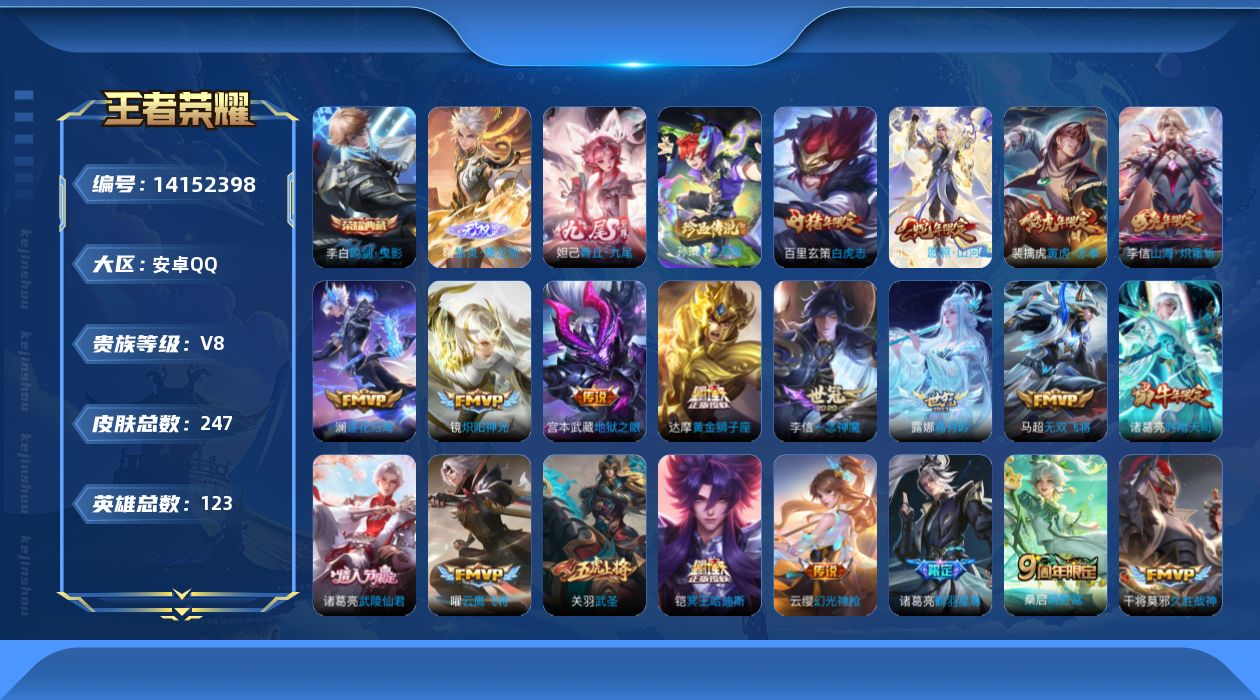 [14152398]贵族8-247总皮-1典藏-29传说-2无双-1珍品传说-0珍品无双-1全皮-2改名卡 可二次 安卓手q394区247皮1典藏29传说2无双1珍品传说v8 营地id1745493682无双王者【珍品传说皮肤】:时之奇旅【无双皮肤】:器灵·螭龙剑青丘·九尾【荣耀典藏】:鸣剑·曳影【优质限定皮肤】:至尊宝武圣白虎志无双飞将山海·炽霜斩【传说皮肤】:地狱之眼愿照·山河定