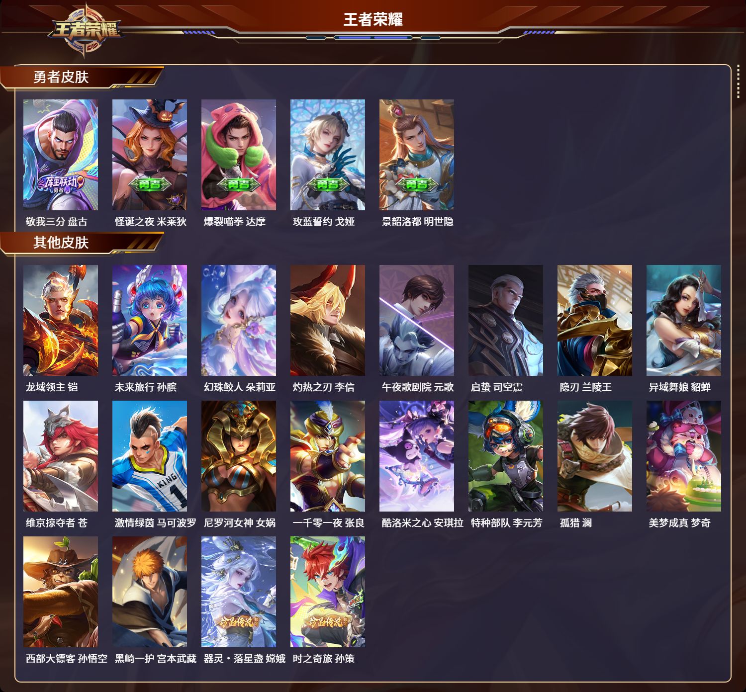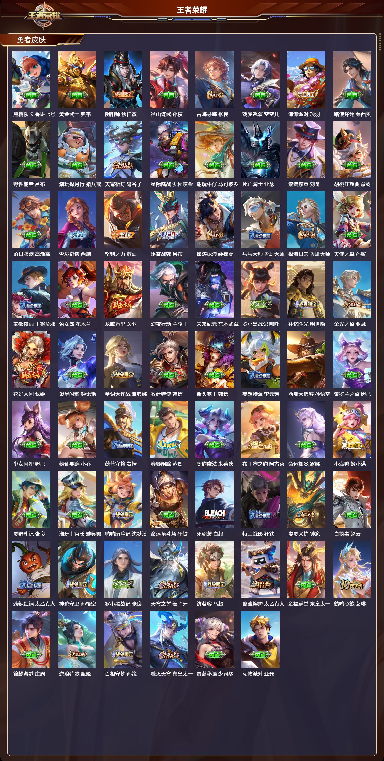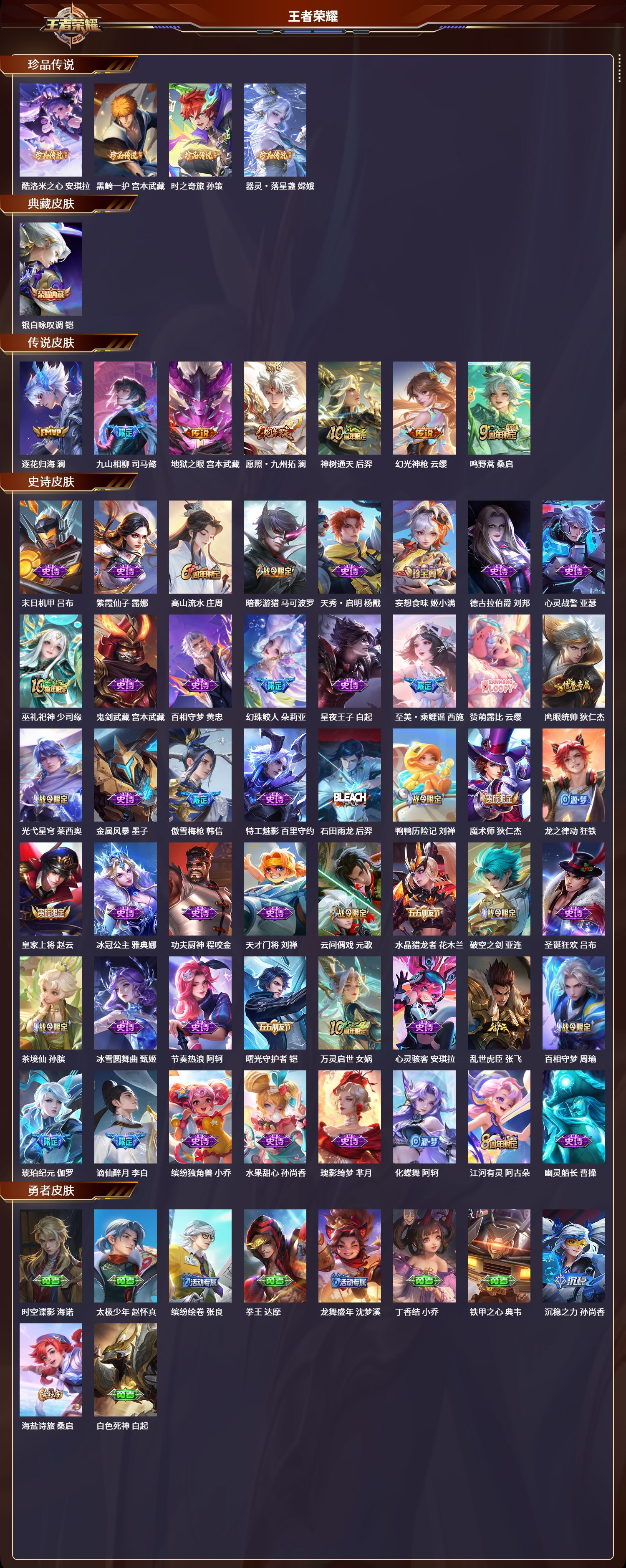 安卓qq/至圣王者/160皮肤/125英雄/1典藏/0珍品无双/0无双/4珍品传说/7传说/48史诗/7稀有英雄【4 珍品传说】酷洛米之心 安琪拉黑崎一护 宫本武藏时之奇旅 孙策器灵·落星盏 嫦娥【1 典藏皮肤】银白咏叹调 铠【7 传说皮肤】逐花归海 澜九山相柳 司马懿地狱之眼 宫本武藏愿照·九州拓 澜神树通天 后羿幻光神呛 云缨鸣野蒿 桑启【48 史诗皮肤】末日机甲 吕布