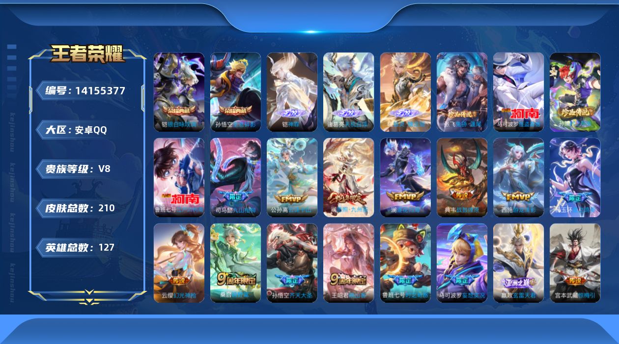 [14155377]贵族8-210总皮-2典藏-21传说-3无双-4珍品传说-0珍品无双-2全皮-0改名卡 安卓手q465区 营地id1669461741荣耀王者【珍品传说皮肤】:兔狲·蓬尾时之奇旅江户川柯南怪盗基德【无双皮肤】:神罪天机白泽器灵·螭龙剑【荣耀典藏】:银白咏叹调全息碎影【传说皮肤】:神树通天九山相柳战鼓燎原逐花归海云诺千山绛天战甲愿照·九州拓星之鸣奏启