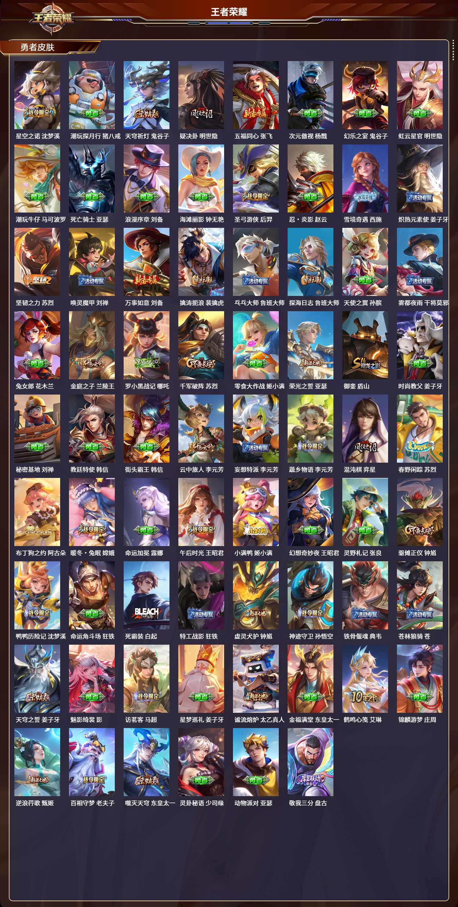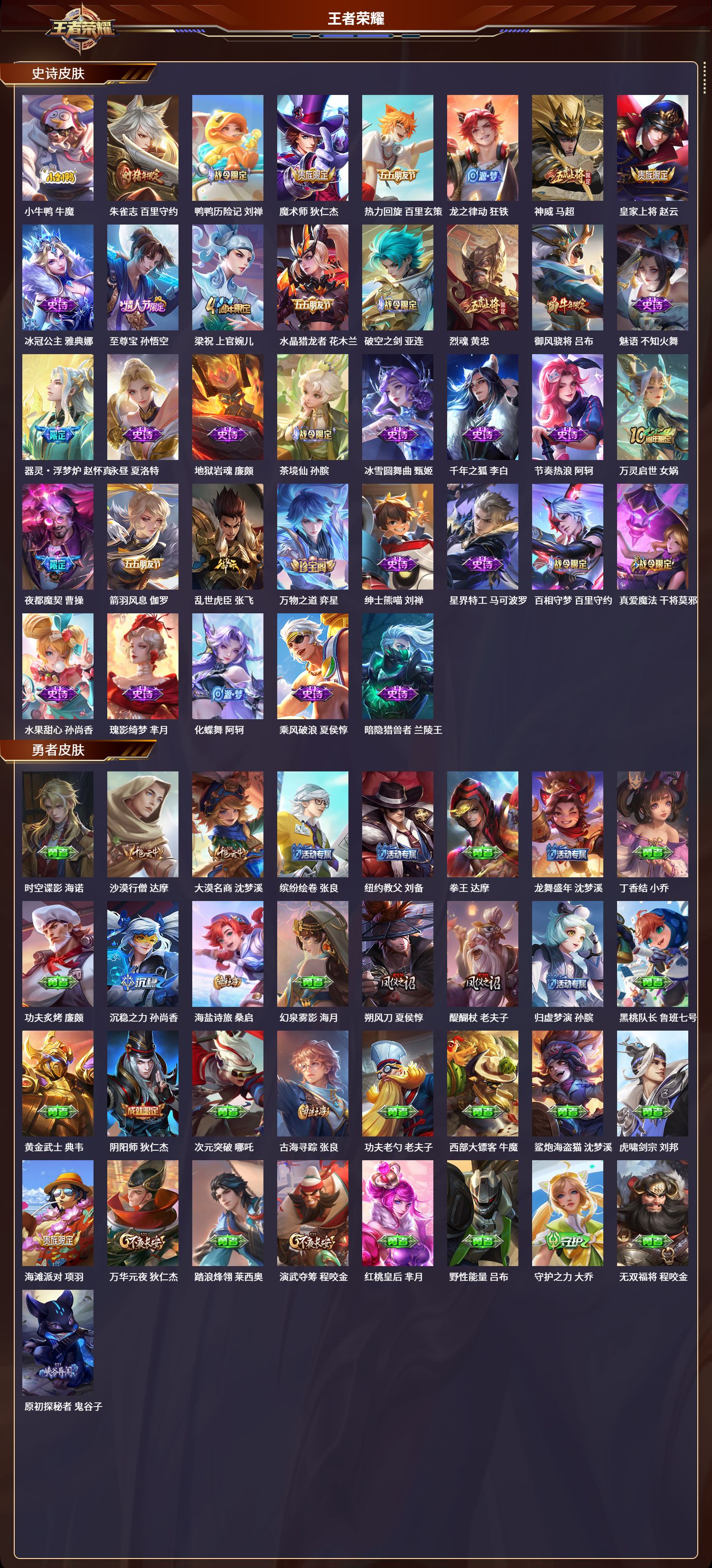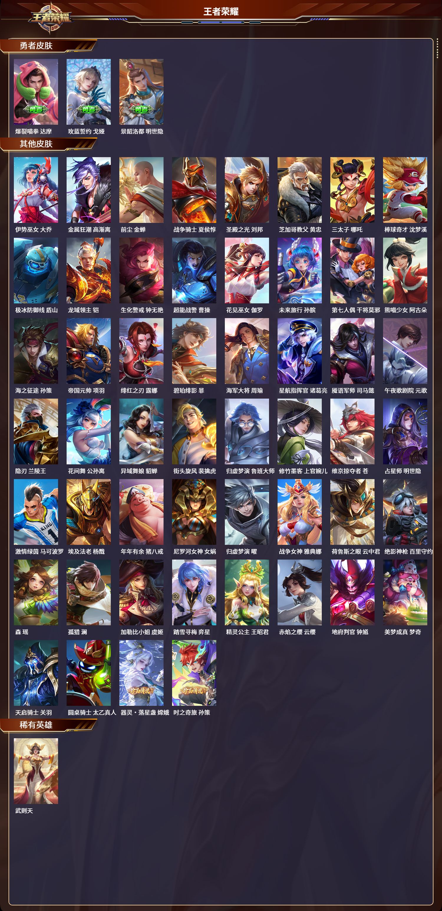 安卓qq/至圣王者/264皮肤/127英雄/2典藏/0珍品无双/4无双/2珍品传说/24传说/75史诗/9稀有英雄【2 珍品传说】时之奇旅 孙策器灵·落星盏 嫦娥【2 典藏皮肤】鸣剑·曳影 李白最初的交响 伽罗【4 无双皮肤】雪境奇遇 甄姬真我赫兹 瑶离恨烟 公孙离器灵·螭龙剑 曜【24 传说皮肤】启明星使 虞姬逐花归海 澜祈雪灵祝 公孙离海洋之心 武则天时雨天司 诸葛亮