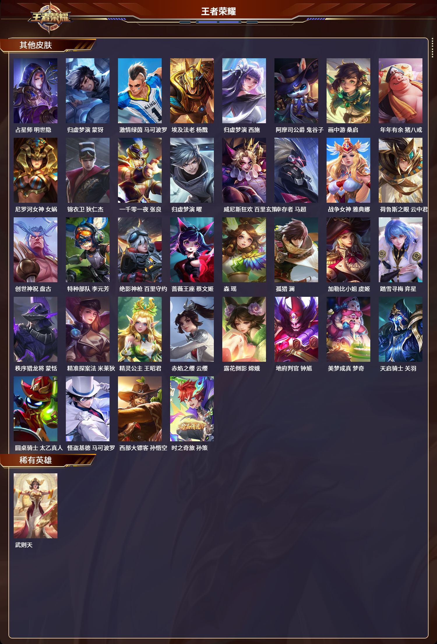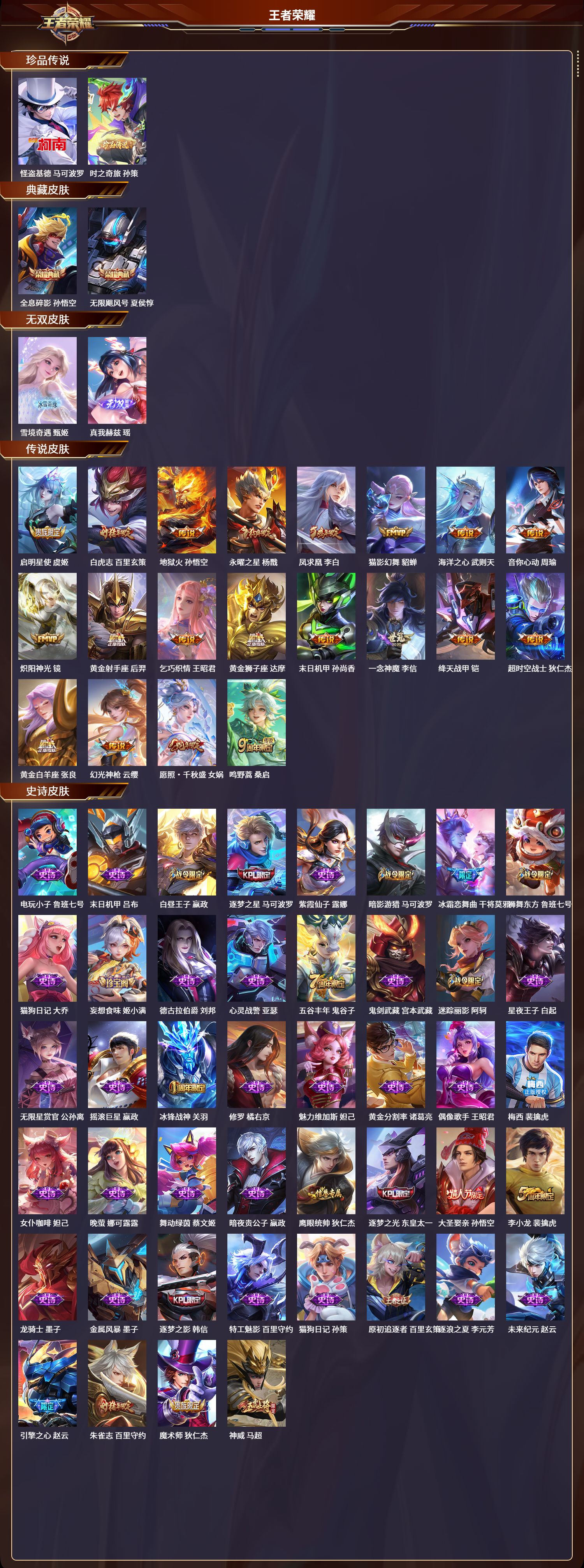 苹果qq/至尊星耀/314皮肤/127英雄/2典藏/0珍品无双/2无双/2珍品传说/20传说/76史诗/10稀有英雄【2 珍品传说】怪盗基德 马可波罗时之奇旅 孙策【2 典藏皮肤】全息碎影 孙悟空无限飓风号 夏侯惇【2 无双皮肤】雪境奇遇 甄姬真我赫兹 瑶【20 传说皮肤】启明星使 虞姬白虎志 百里玄策地狱火 孙悟空永曜之星 杨戬凤求凰 李白猫影幻舞 貂蝉海洋之心 武则天