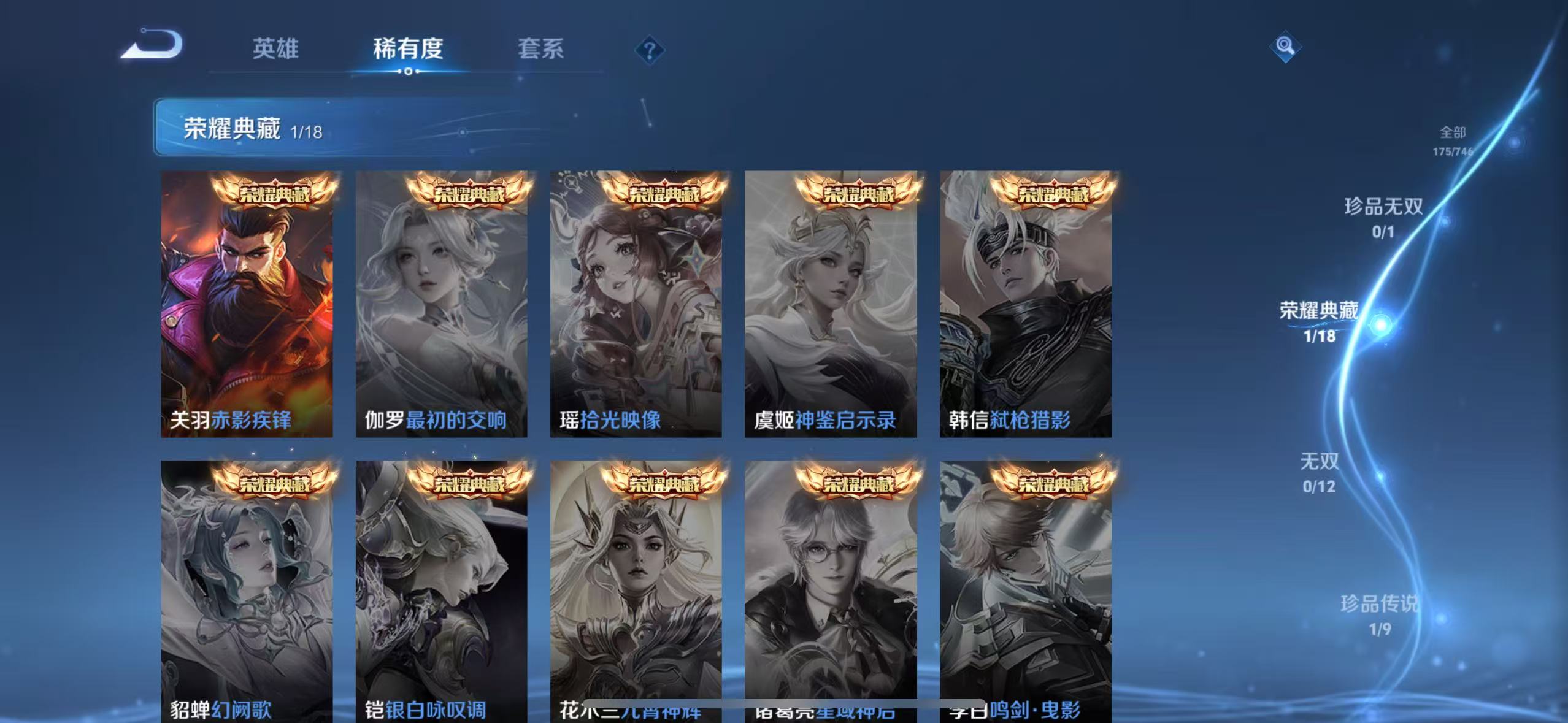 txwz20484 v7-175皮肤 1典藏赤影疾锋 1珍品时之奇旅 11传说神树通天,黄金狮子座,千山共赴,黄金白羊座,幻光神呛,愿照·山河定,鸣野蒿,一念神魔,零号·赤焰,久胜战神,战鼓燎原 64史诗