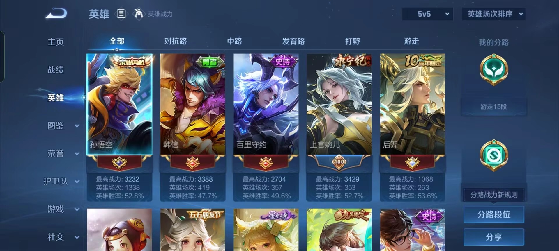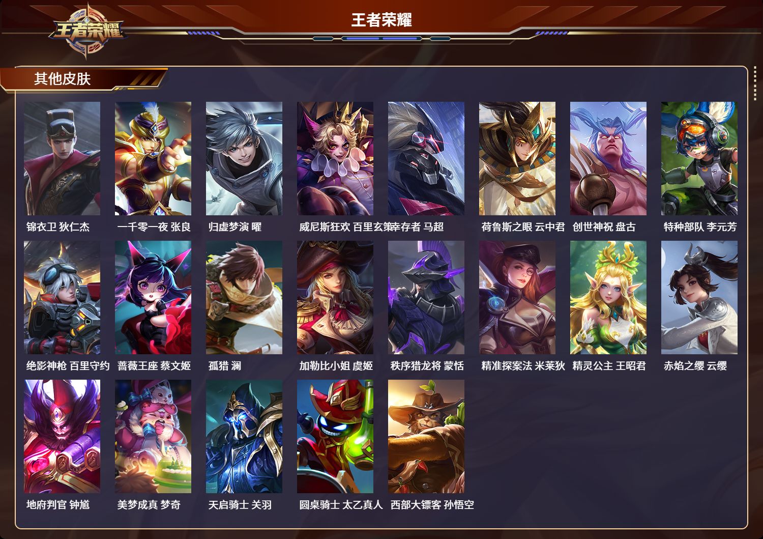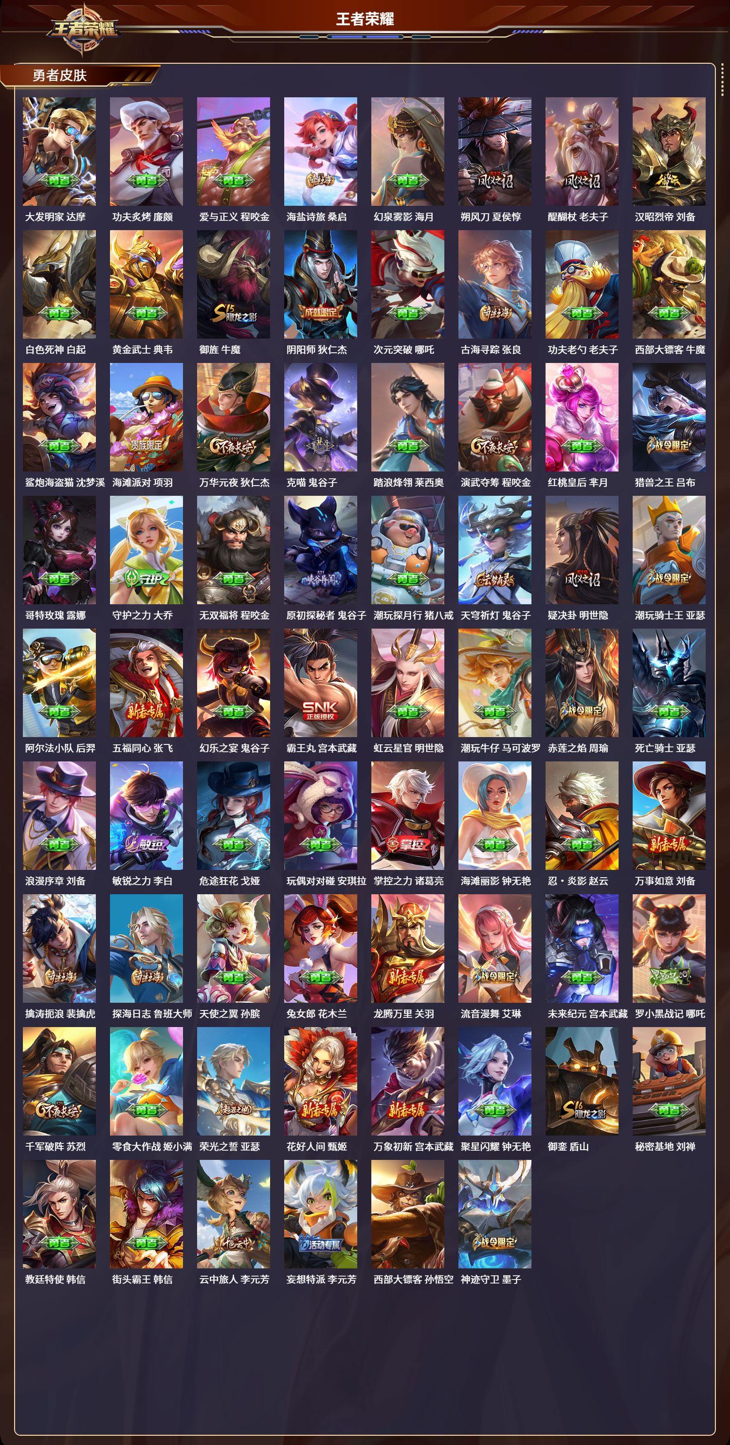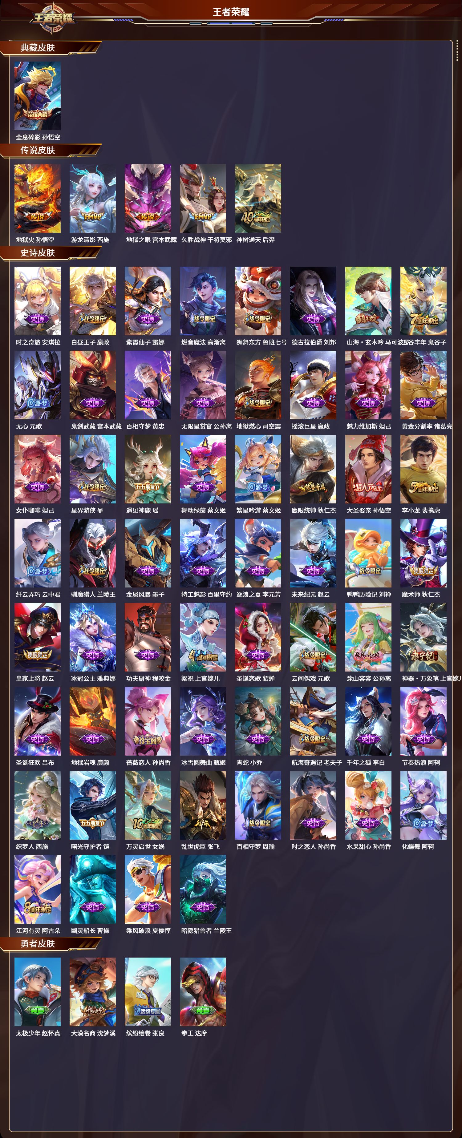 安卓qq/永恒钻石/230皮肤/126英雄/1典藏/0珍品无双/0无双/0珍品传说/5传说/60史诗/8稀有英雄【1 典藏皮肤】全息碎影 孙悟空【5 传说皮肤】地狱火 孙悟空游龙清影 西施地狱之眼 宫本武藏久胜战神 干将莫邪神树通天 后羿【60 史诗皮肤】时之奇旅 安琪拉白昼王子 嬴政紫霞仙子 露娜燃音魔法 高渐离狮舞东方 鲁班七号德古拉伯爵 刘邦山海·