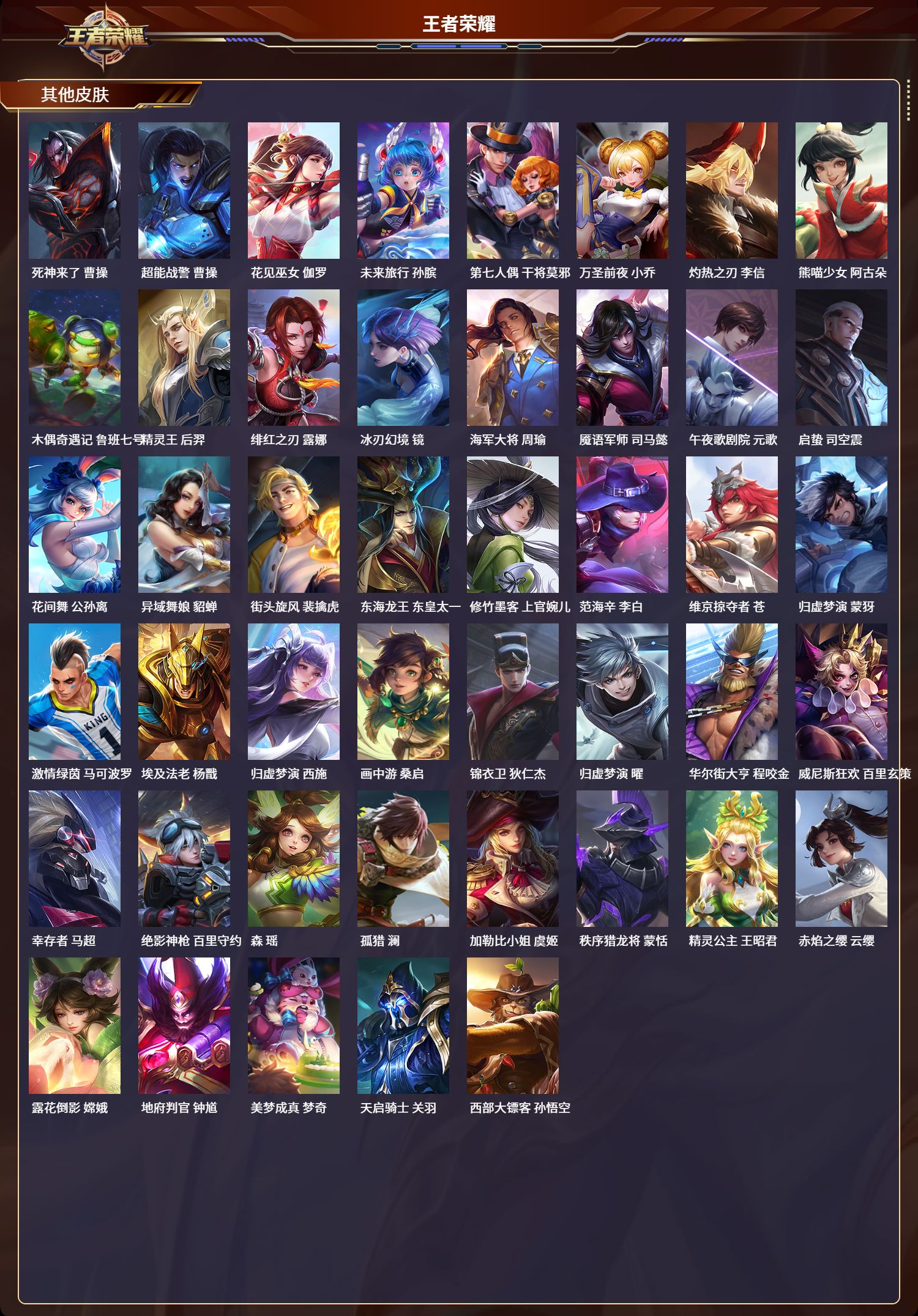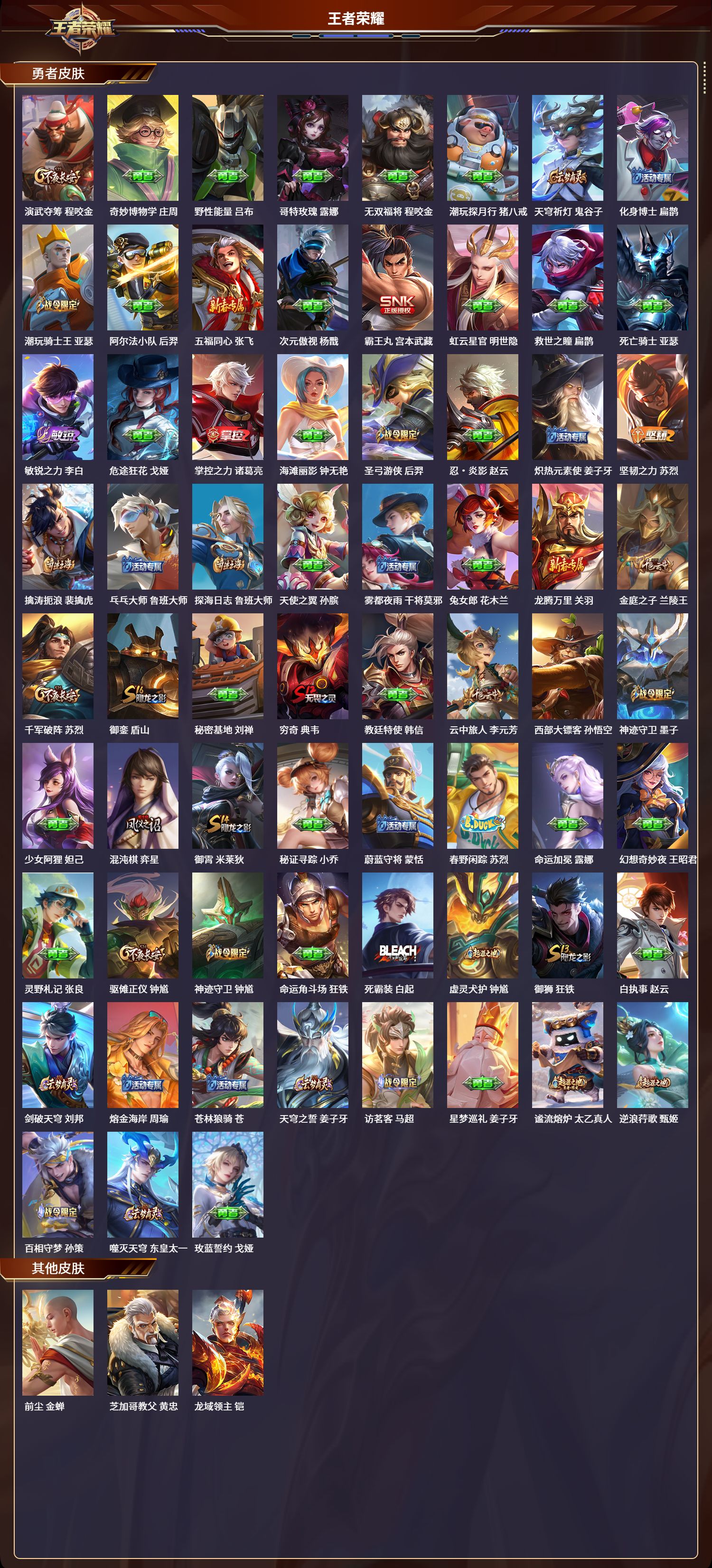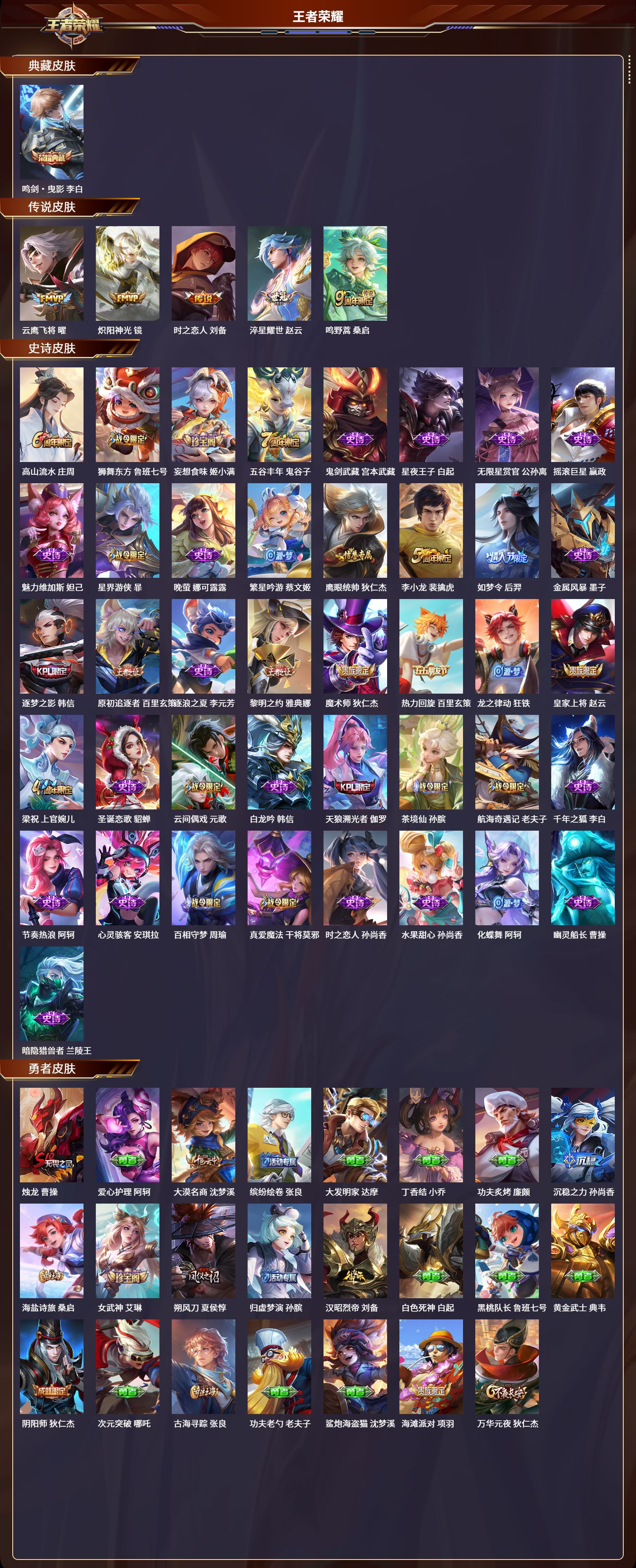 安卓qq/至尊星耀/184皮肤/124英雄/1典藏/0珍品无双/0无双/0珍品传说/5传说/41史诗/7稀有英雄【1 典藏皮肤】鸣剑·曳影 李白【5 传说皮肤】云鹰飞将 曜炽阳神光 镜时之恋人 刘备淬星耀世 赵云鸣野蒿 桑启【41 史诗皮肤】高山流水 庄周狮舞东方 鲁班七号妄想食味 姬小满五谷丰年 鬼谷子鬼剑武藏 宫本武藏星夜王子 白起无限星赏官 公孙离