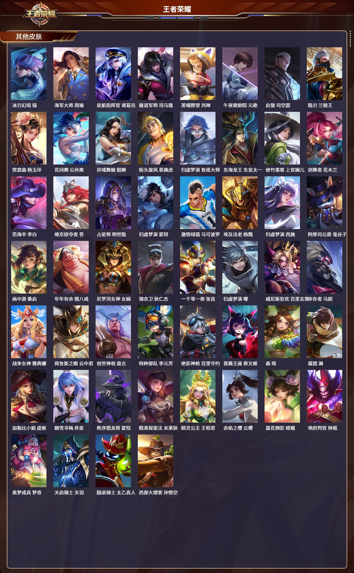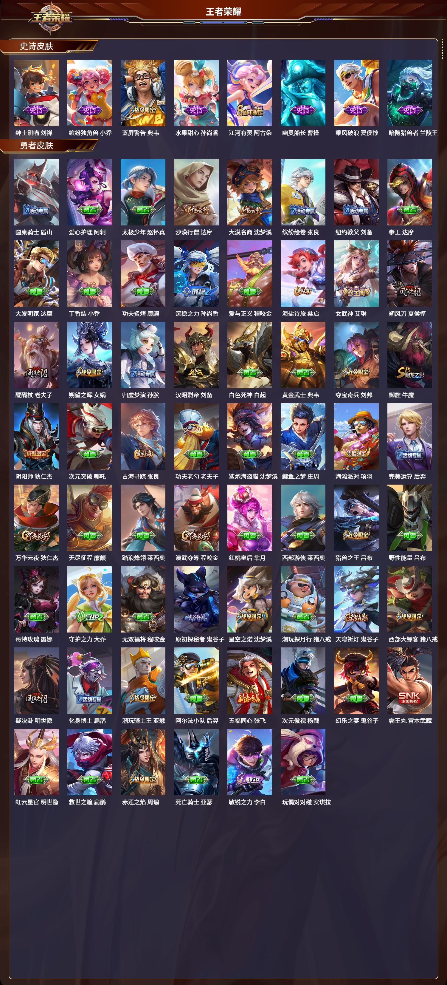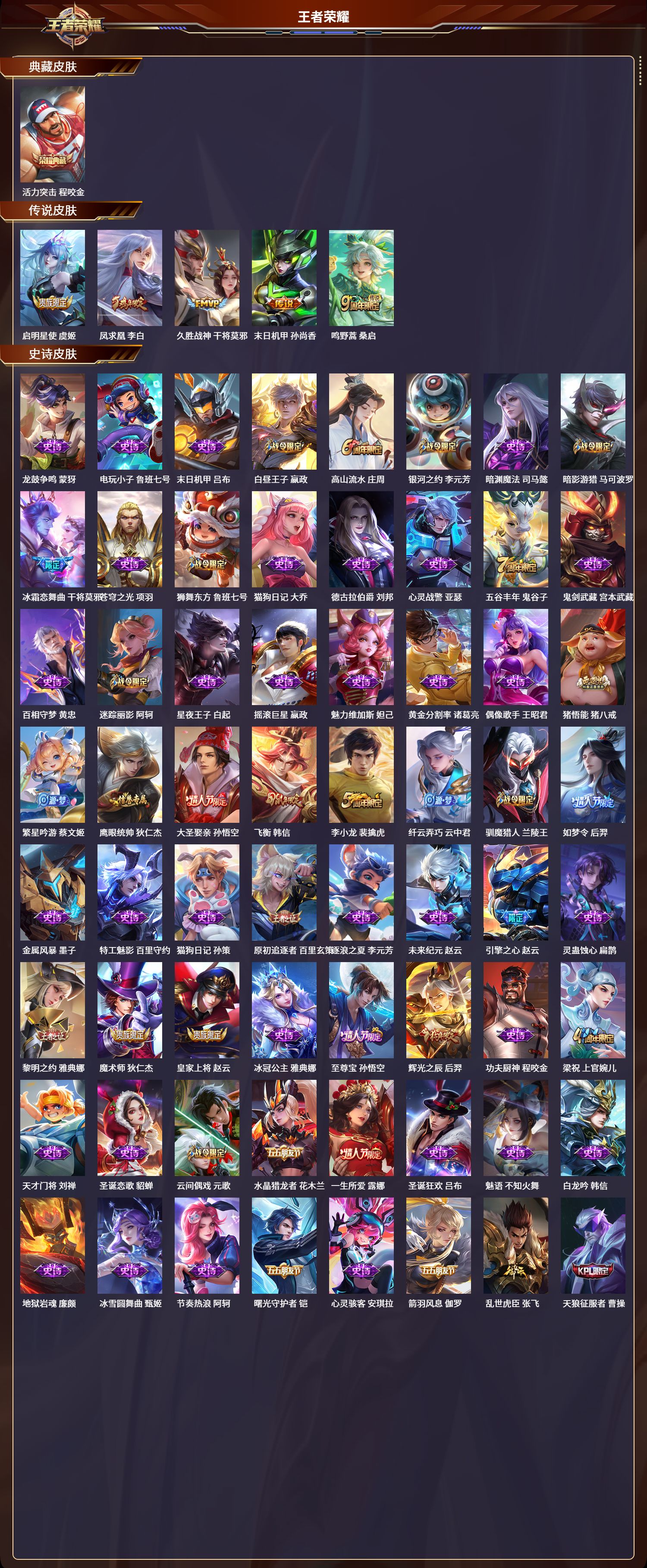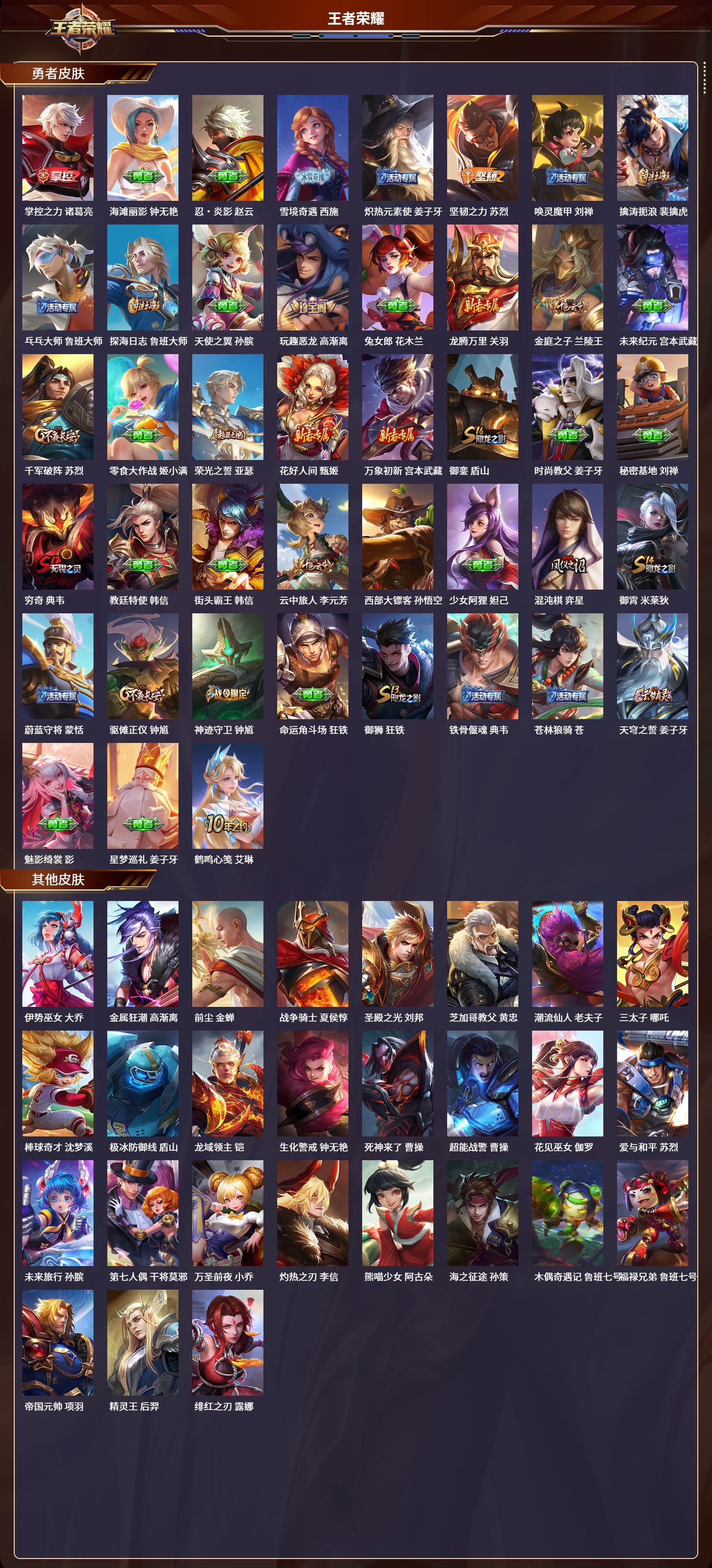 安卓qq/传奇王者/262皮肤/125英雄/1典藏/0珍品无双/0无双/0珍品传说/5传说/72史诗/7稀有英雄【1 典藏皮肤】活力突击 程咬金【5 传说皮肤】启明星使 虞姬凤求凰 李白久胜战神 干将莫邪末日机甲 孙尚香鸣野蒿 桑启【72 史诗皮肤】龙鼓争鸣 蒙犽电玩小子 鲁班七号末日机甲 吕布白昼王子 嬴政高山流水 庄周银河之约 李元芳暗渊魔法 司马懿