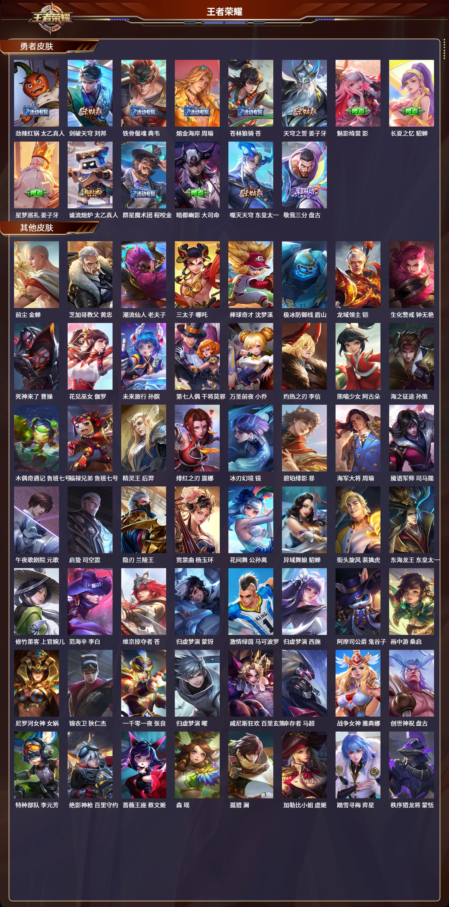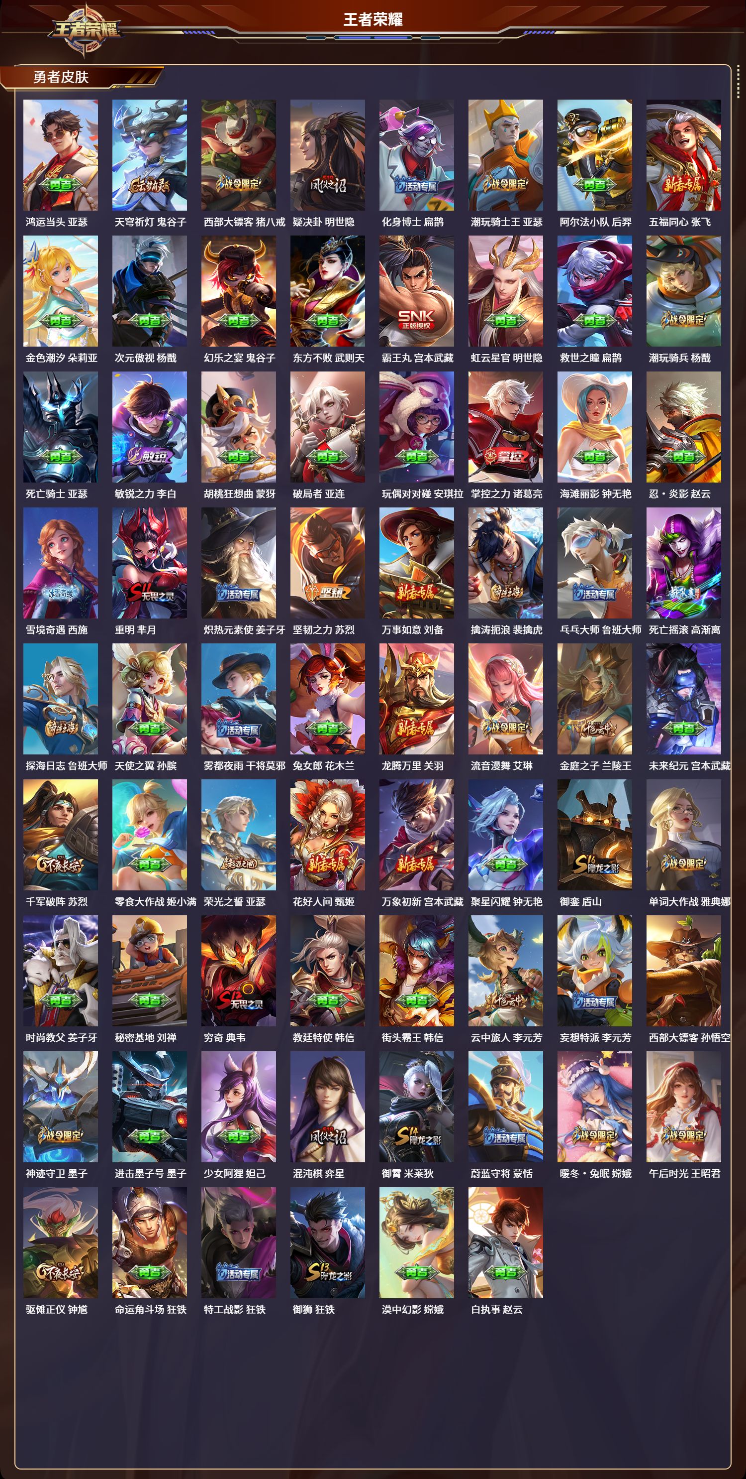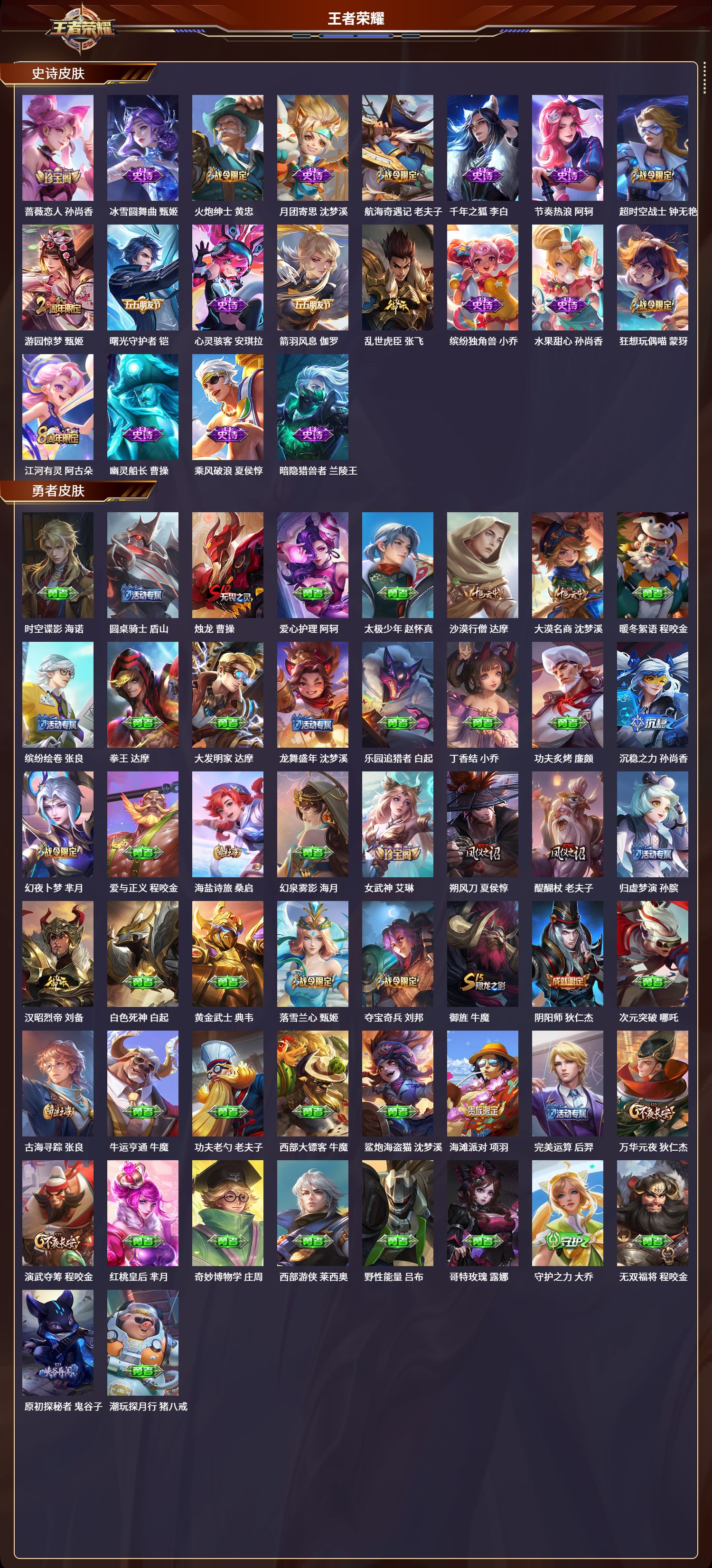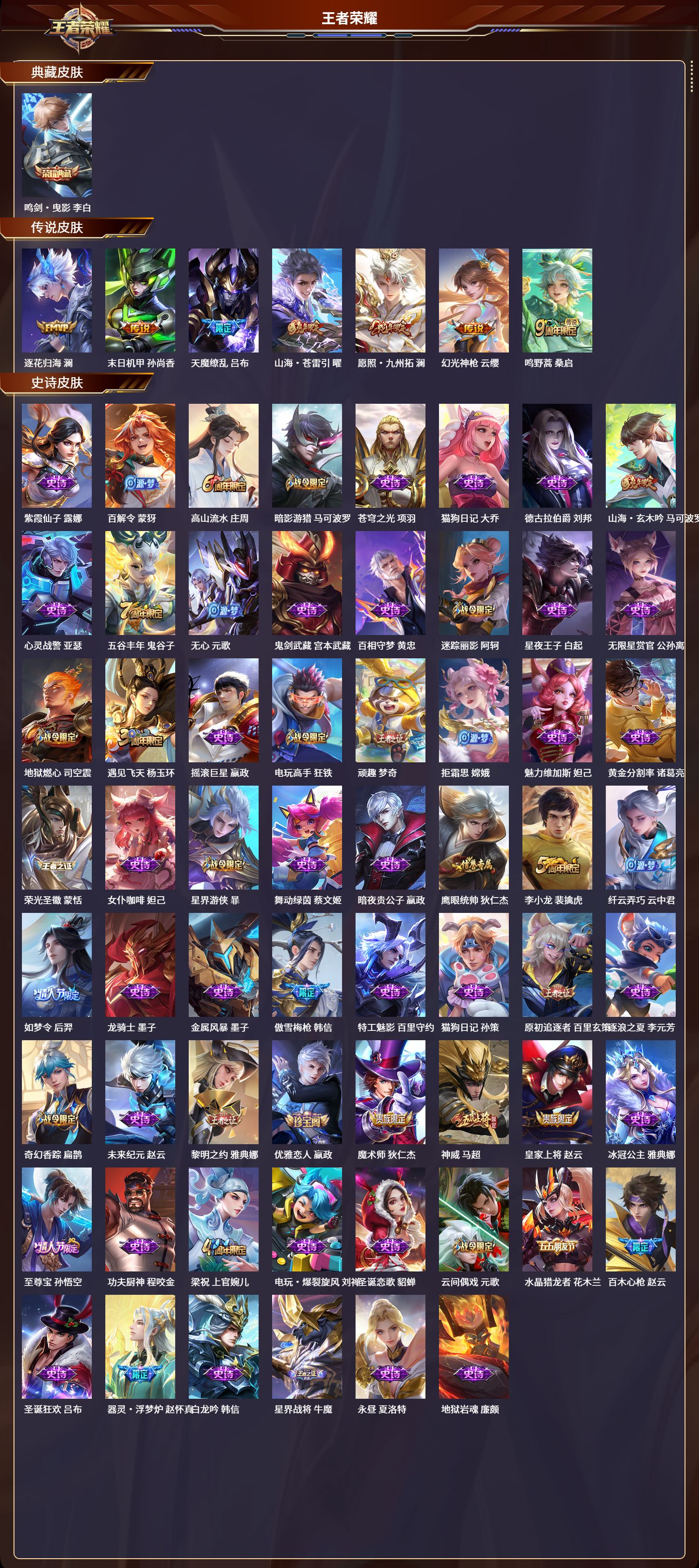 安卓qq/最强王者/287皮肤/126英雄/1典藏/0珍品无双/0无双/0珍品传说/7传说/82史诗/8稀有英雄【1 典藏皮肤】鸣剑·曳影 李白【7 传说皮肤】逐花归海 澜末日机甲 孙尚香天魔缭乱 吕布山海·苍雷引 曜愿照·九州拓 澜幻光神呛 云缨鸣野蒿 桑启【82 史诗皮肤】紫霞仙子 露娜百解令 蒙犽高山流水 庄周暗影游猎 马可波罗苍穹之光 项羽猫狗