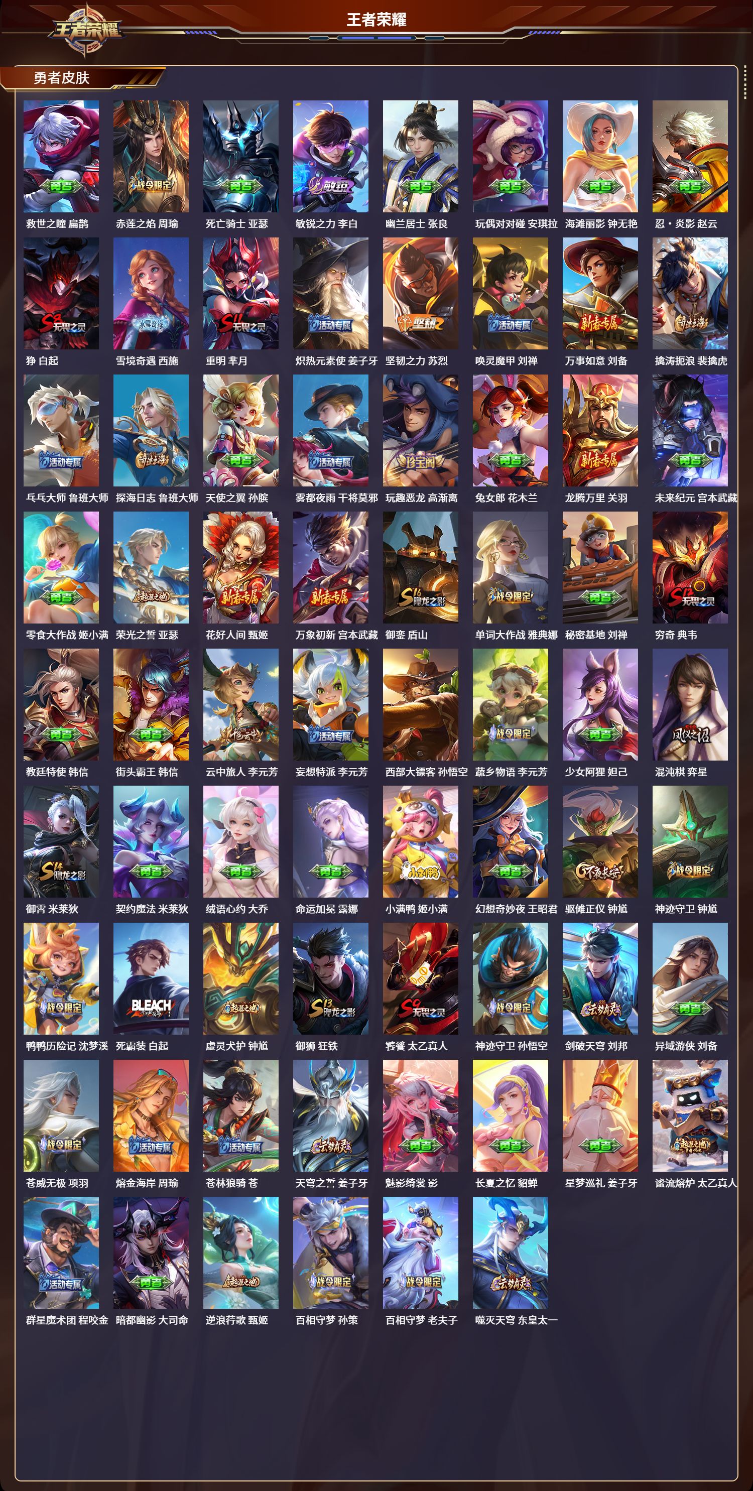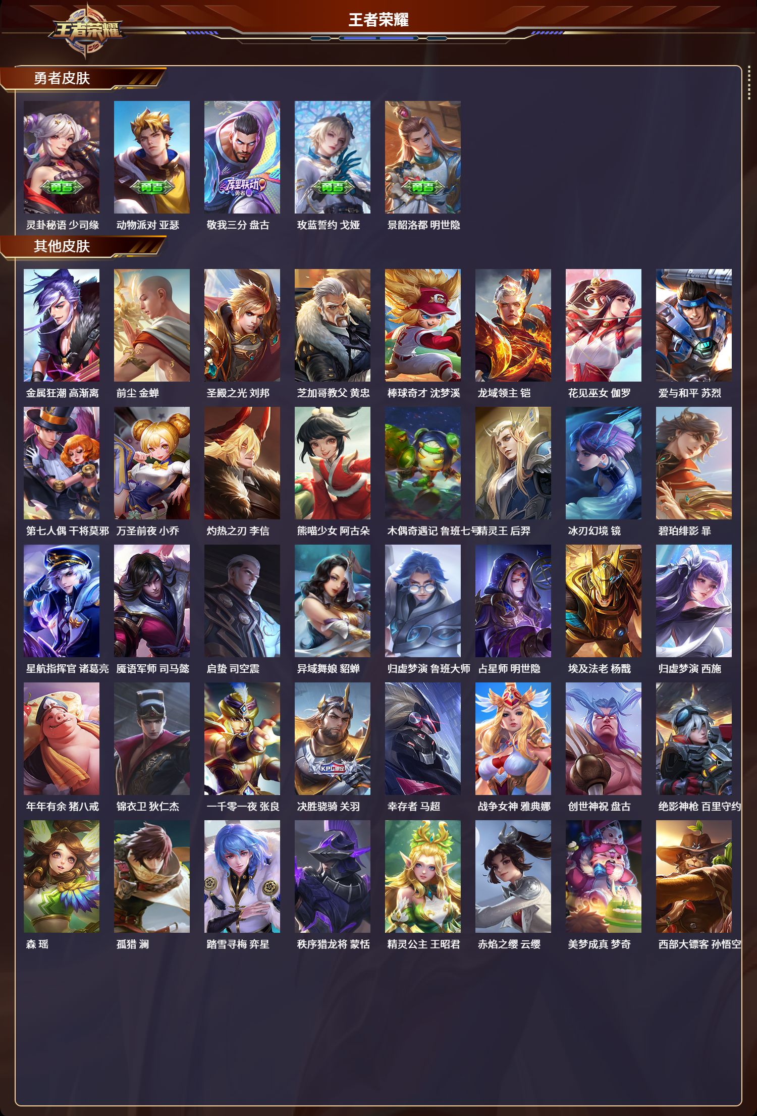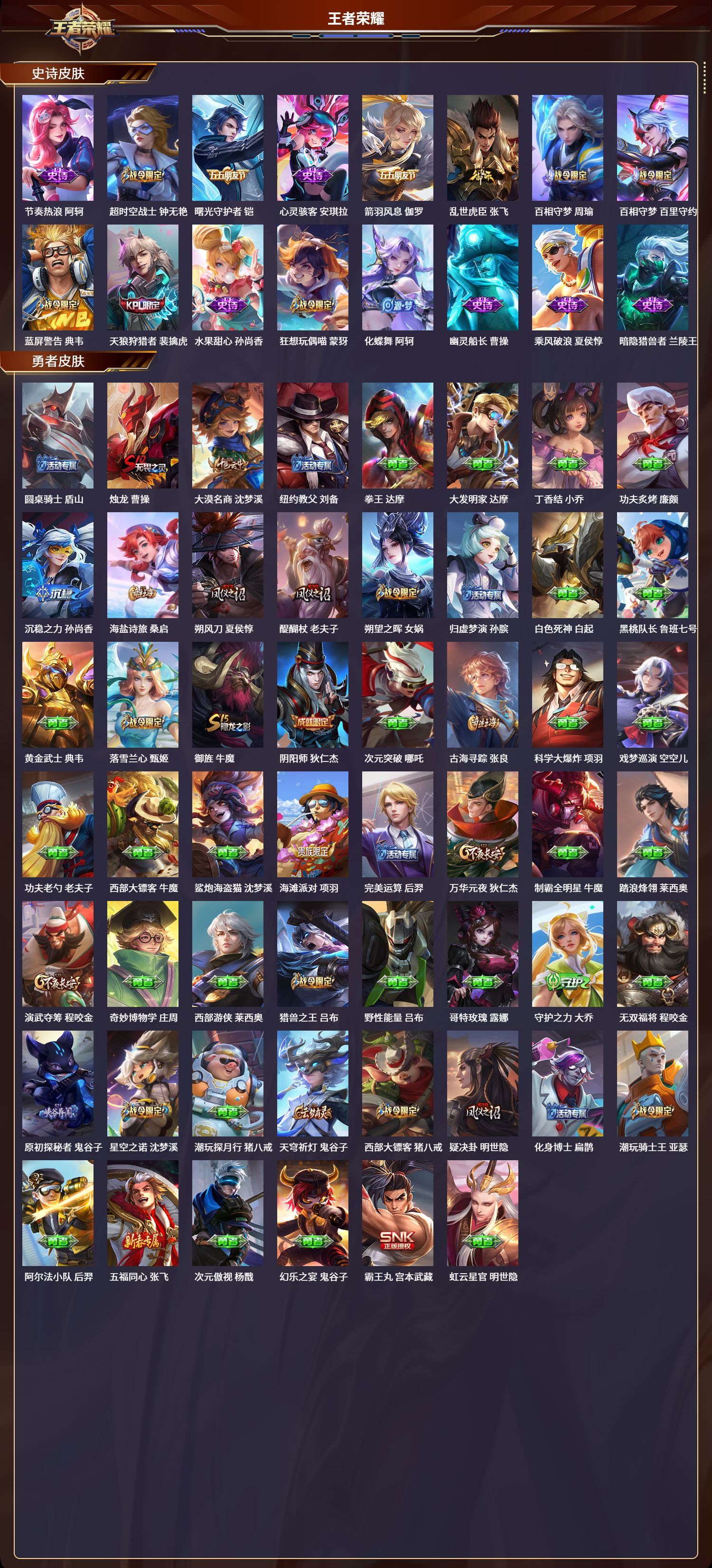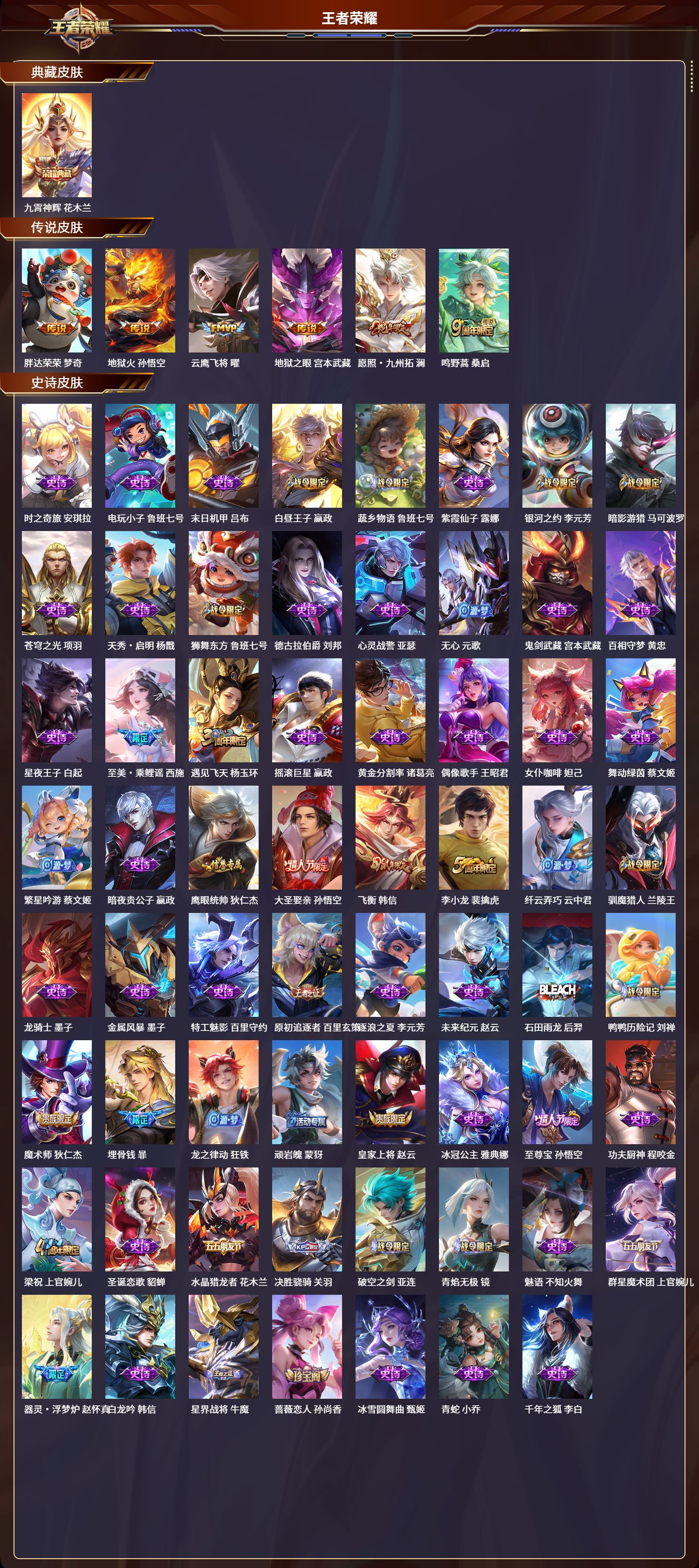 安卓qq/至尊星耀/254皮肤/126英雄/1典藏/0珍品无双/0无双/0珍品传说/6传说/79史诗/8稀有英雄【1 典藏皮肤】九霄神辉 花木兰【6 传说皮肤】胖达荣荣 梦奇地狱火 孙悟空云鹰飞将 曜地狱之眼 宫本武藏愿照·九州拓 澜鸣野蒿 桑启【79 史诗皮肤】时之奇旅 安琪拉电玩小子 鲁班七号末日机甲 吕布白昼王子 嬴政蔬乡物语 鲁班七号紫霞仙子 露