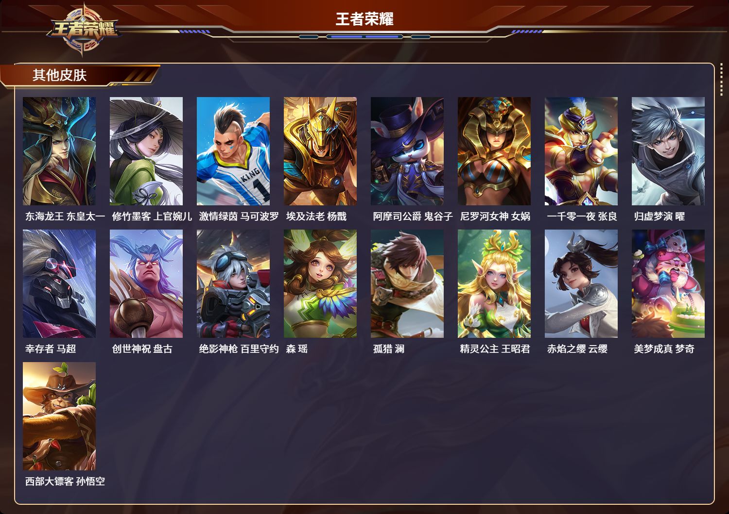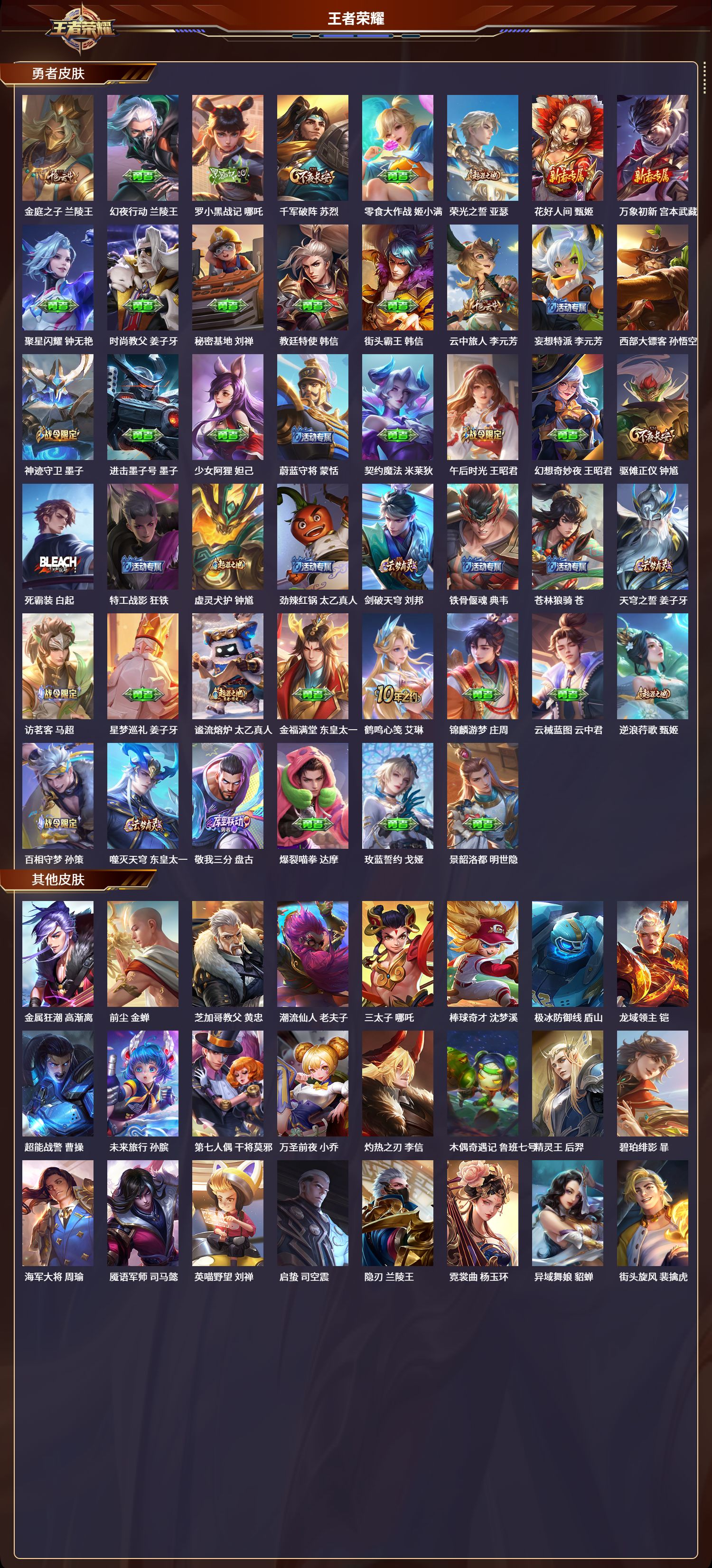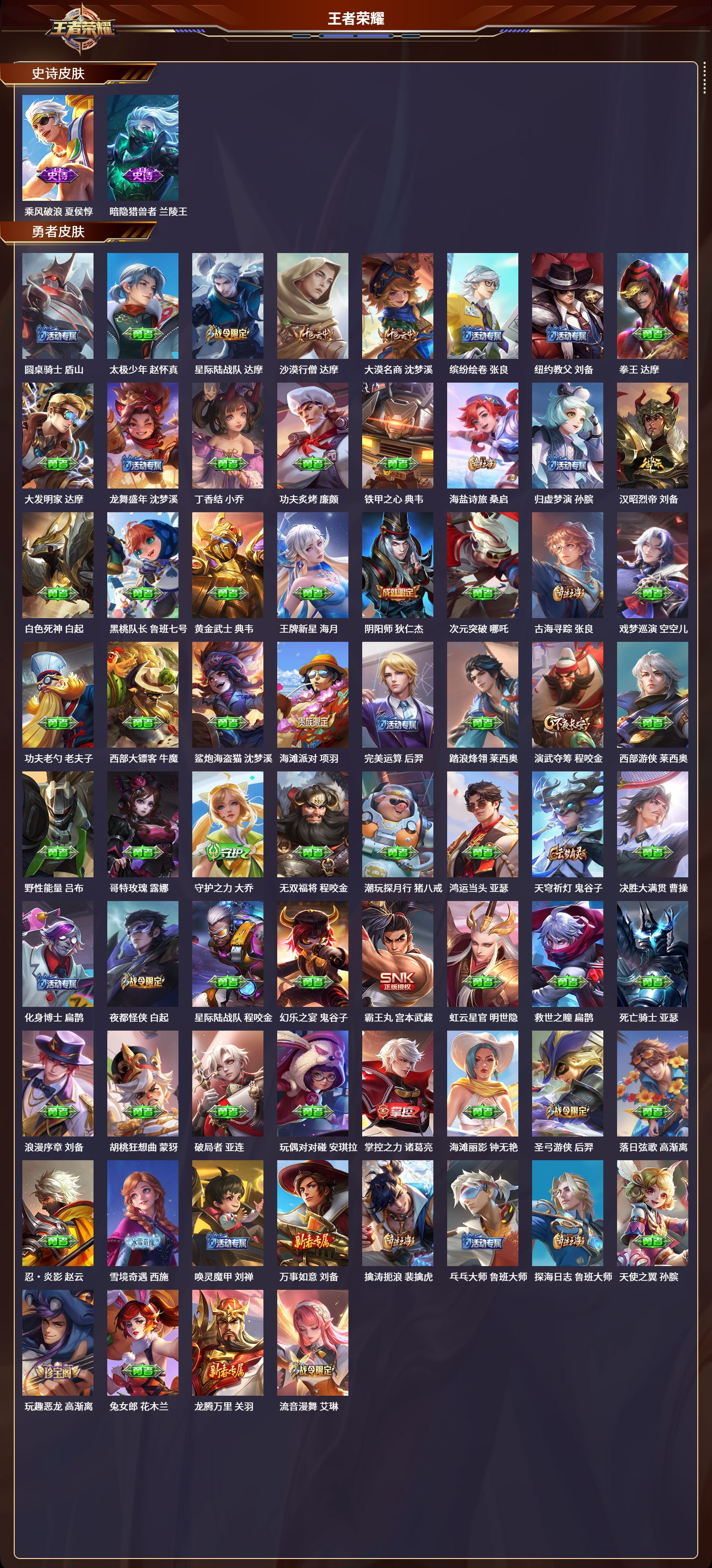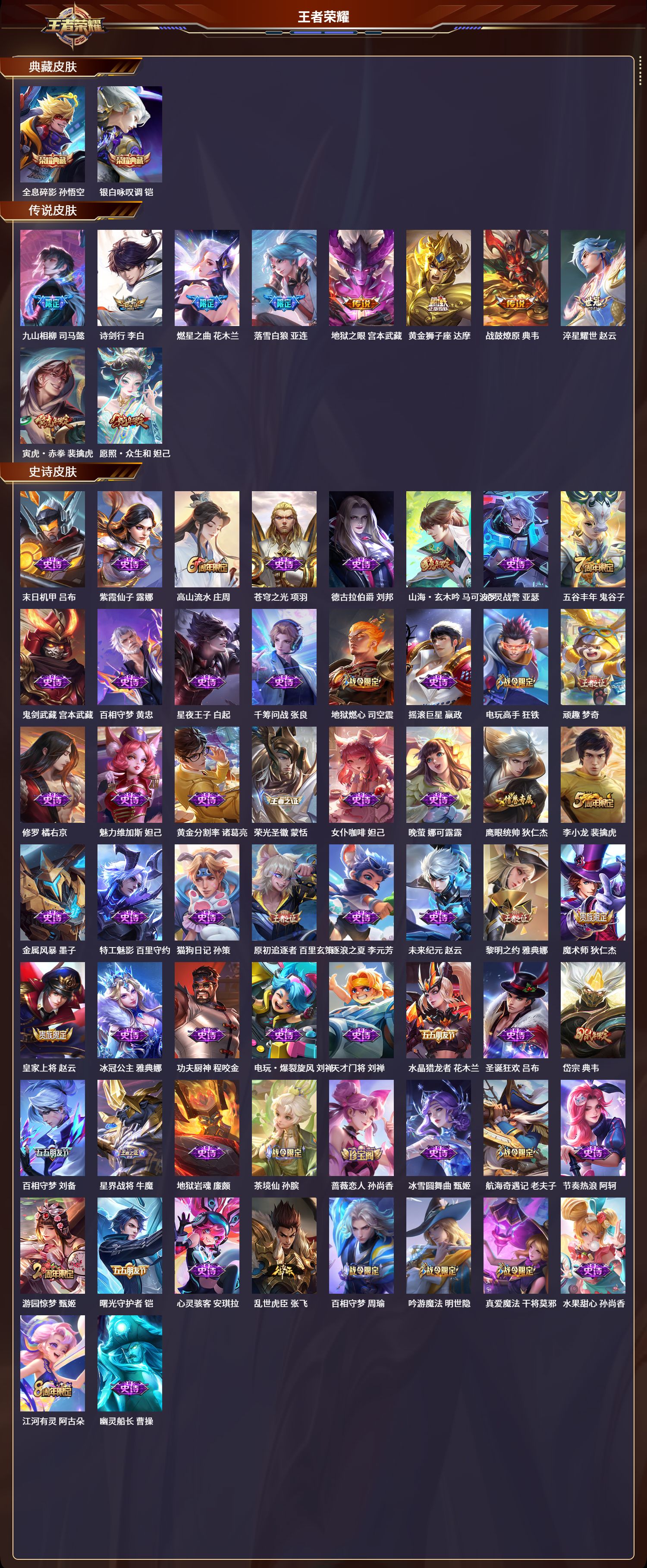 苹果qq/非凡王者/227皮肤/126英雄/2典藏/0珍品无双/0无双/0珍品传说/10传说/60史诗/8稀有英雄【2 典藏皮肤】全息碎影 孙悟空银白咏叹调 铠【10 传说皮肤】九山相柳 司马懿诗剑行 李白燃星之曲 花木兰落雪白狼 亚连地狱之眼 宫本武藏黄金狮子座 达摩战鼓燎原 典韦淬星耀世 赵云寅虎·赤拳 裴擒虎愿照·众生和 妲己【60 史诗皮肤】末日