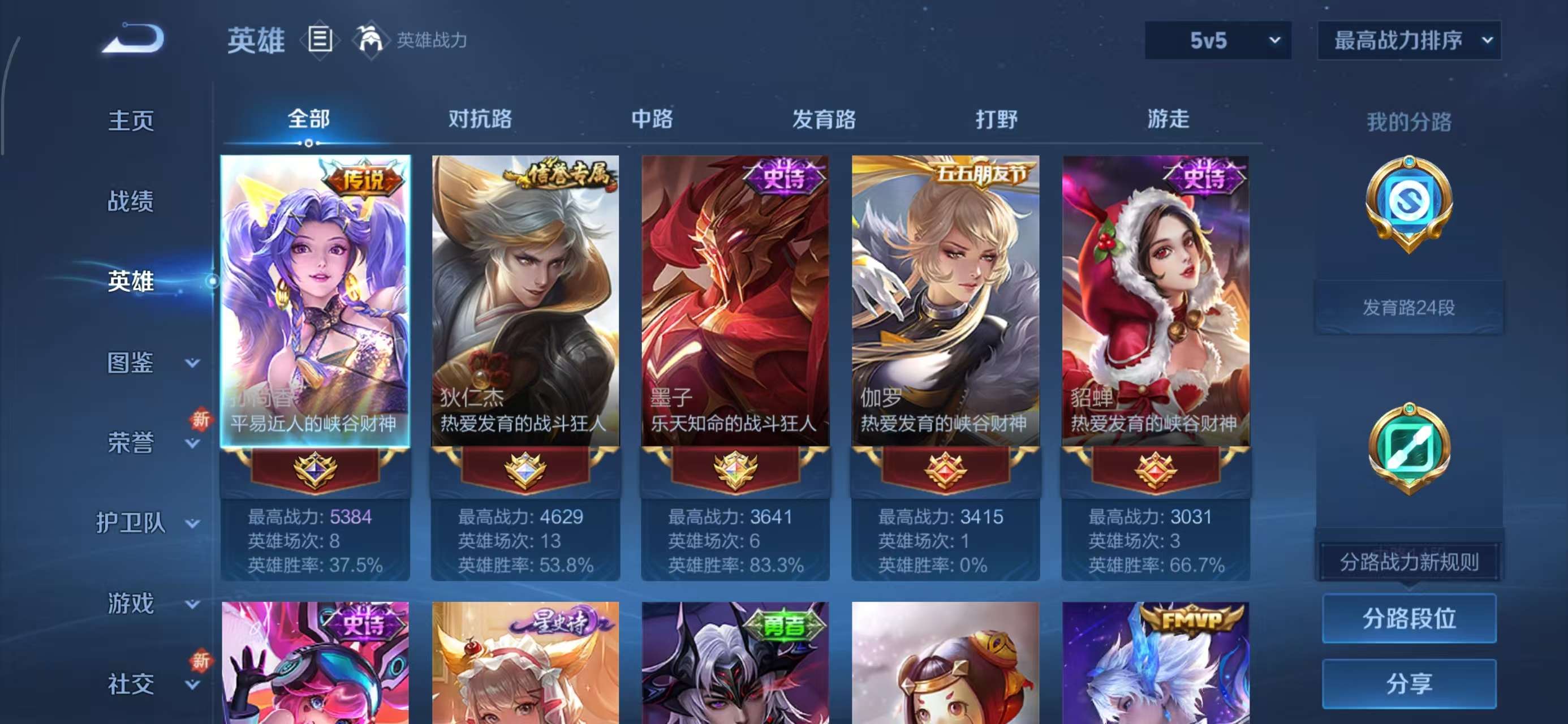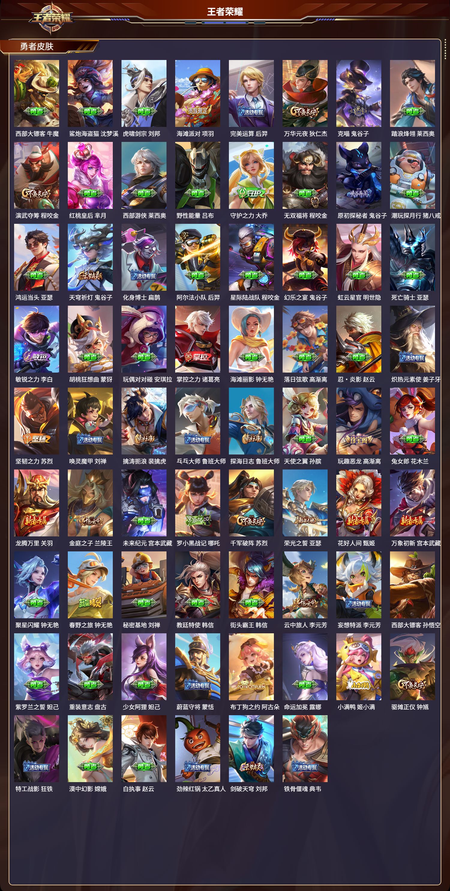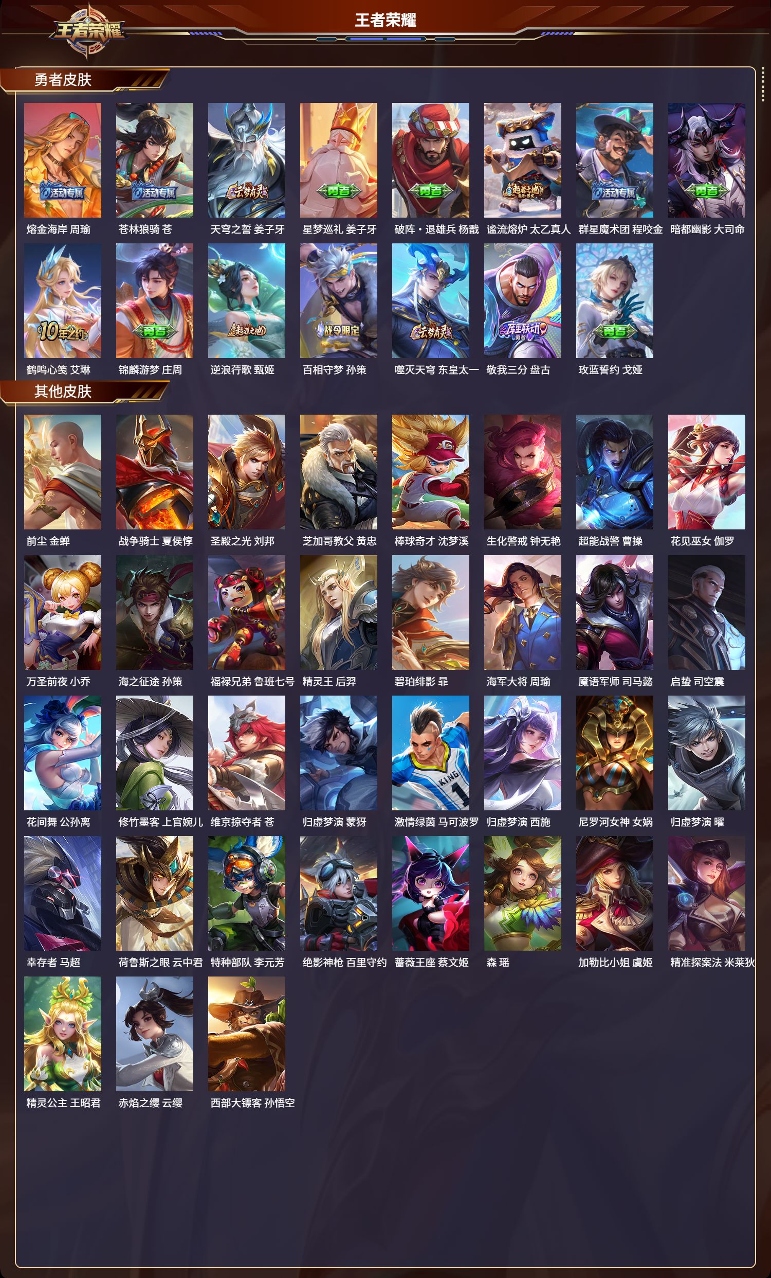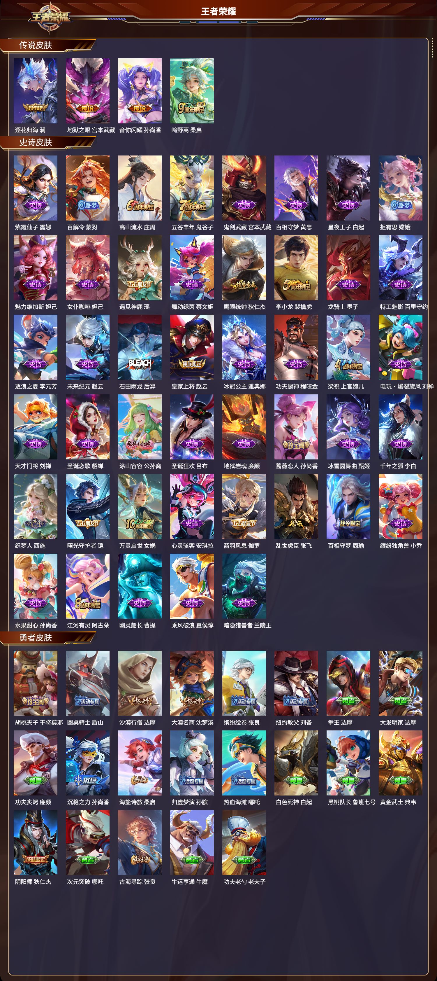 安卓qq/至尊星耀/189皮肤/126英雄/0典藏/0珍品无双/0无双/0珍品传说/4传说/45史诗/8稀有英雄【4 传说皮肤】逐花归海 澜地狱之眼 宫本武藏音你闪耀 孙尚香鸣野蒿 桑启【45 史诗皮肤】紫霞仙子 露娜百解令 蒙犽高山流水 庄周五谷丰年 鬼谷子鬼剑武藏 宫本武藏百相守梦 黄忠星夜王子 白起拒霜思 嫦娥魅力维加斯 妲己女仆咖啡 妲己遇见