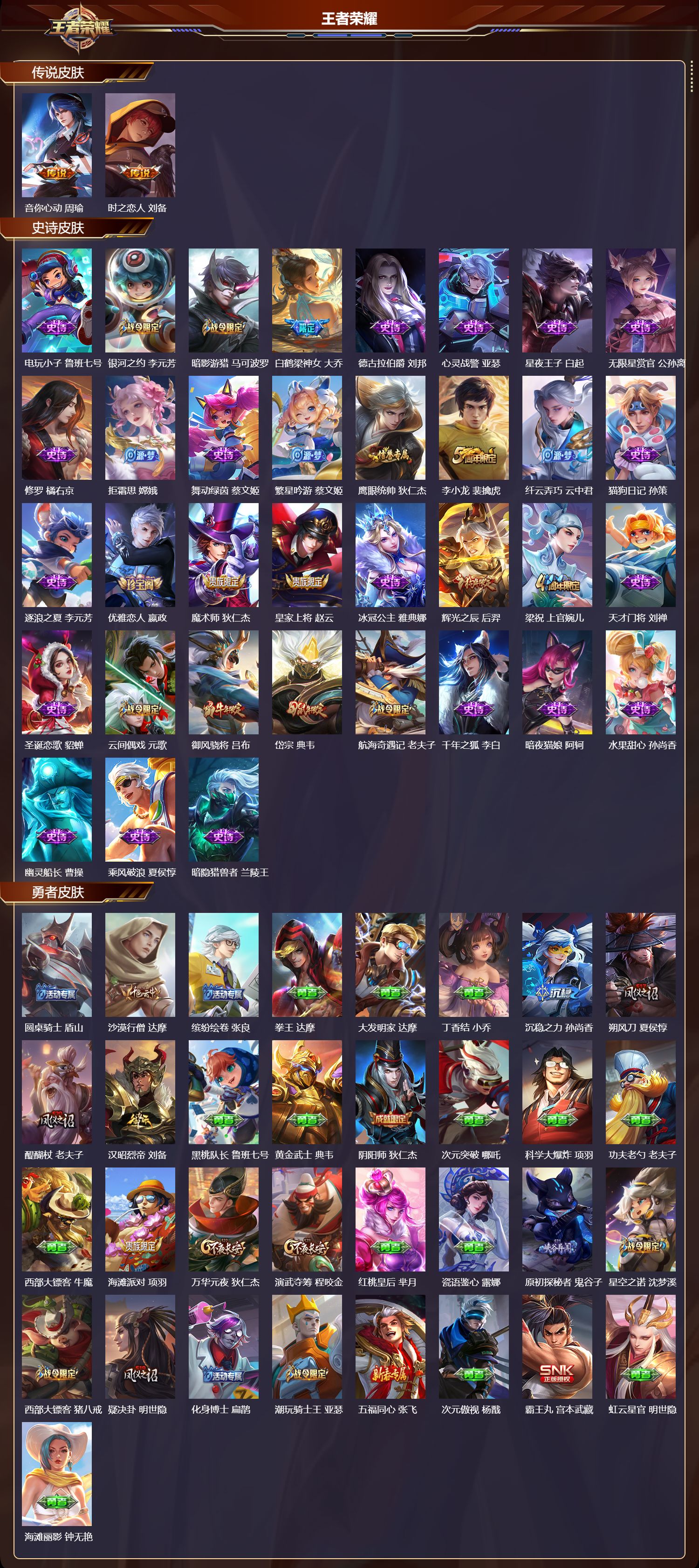 安卓qq/尊贵铂金/116皮肤/113英雄/0典藏/0珍品无双/0无双/0珍品传说/2传说/35史诗/8稀有英雄【2 传说皮肤】音你心动 周瑜时之恋人 刘备【35 史诗皮肤】电玩小子 鲁班七号银河之约 李元芳暗影游猎 马可波罗白鹤梁神女 大乔德古拉伯爵 刘邦心灵战警 亚瑟星夜王子 白起无限星赏官 公孙离修罗 橘右京拒霜思 嫦娥舞动绿茵 蔡文姬繁星吟游