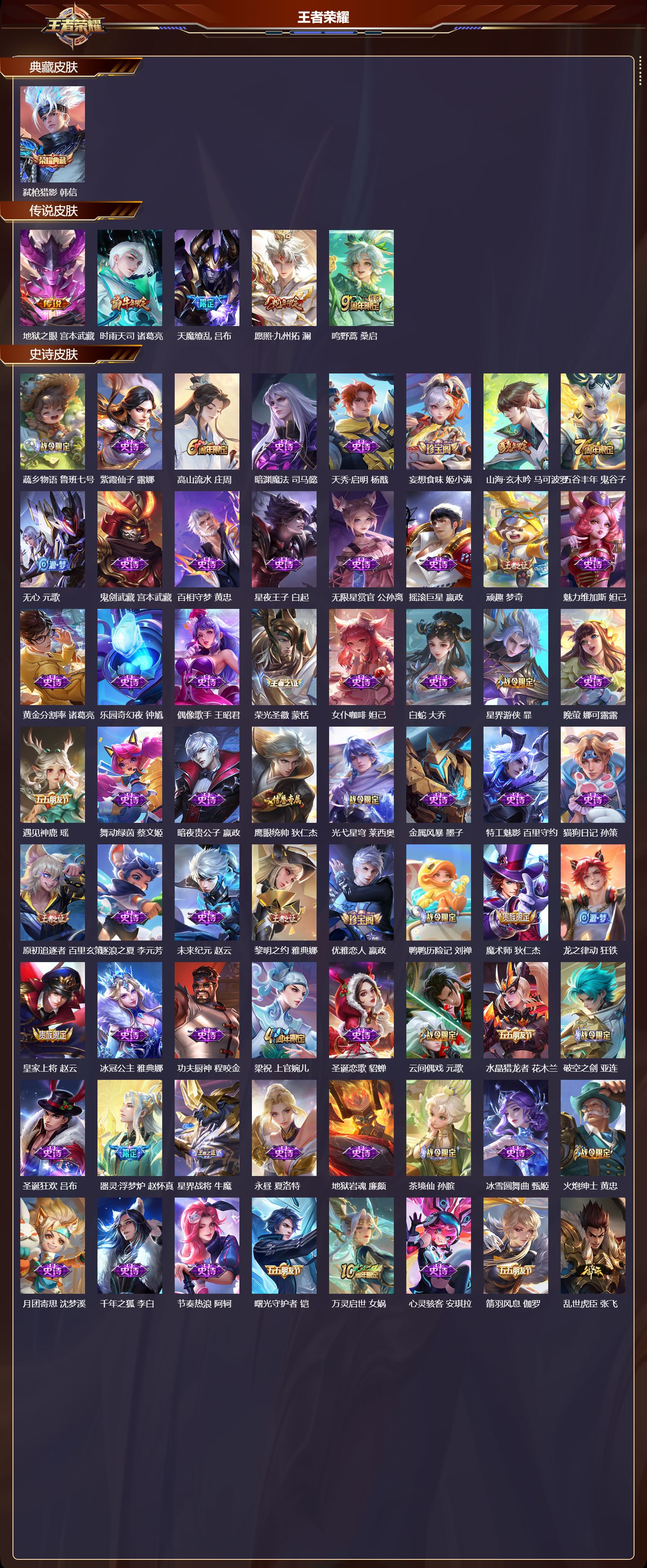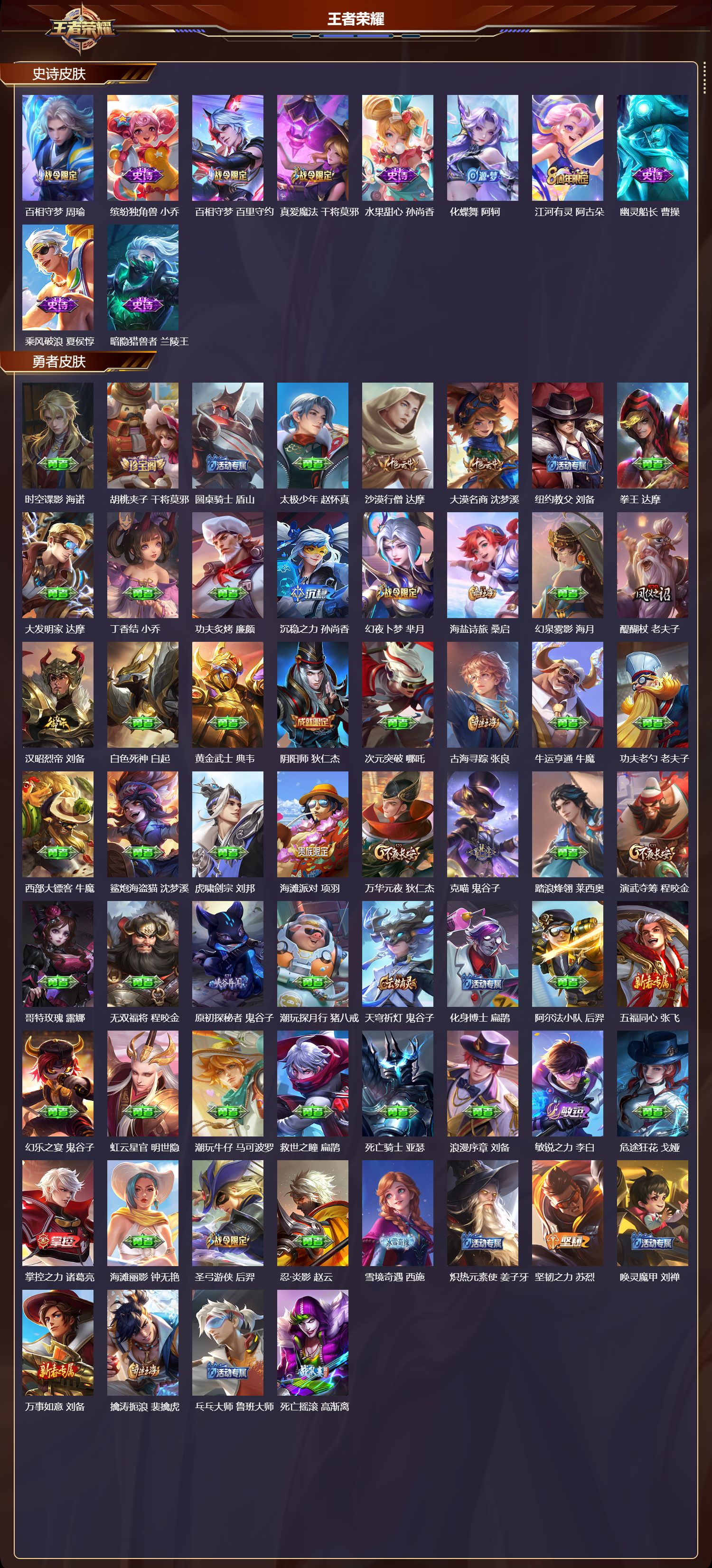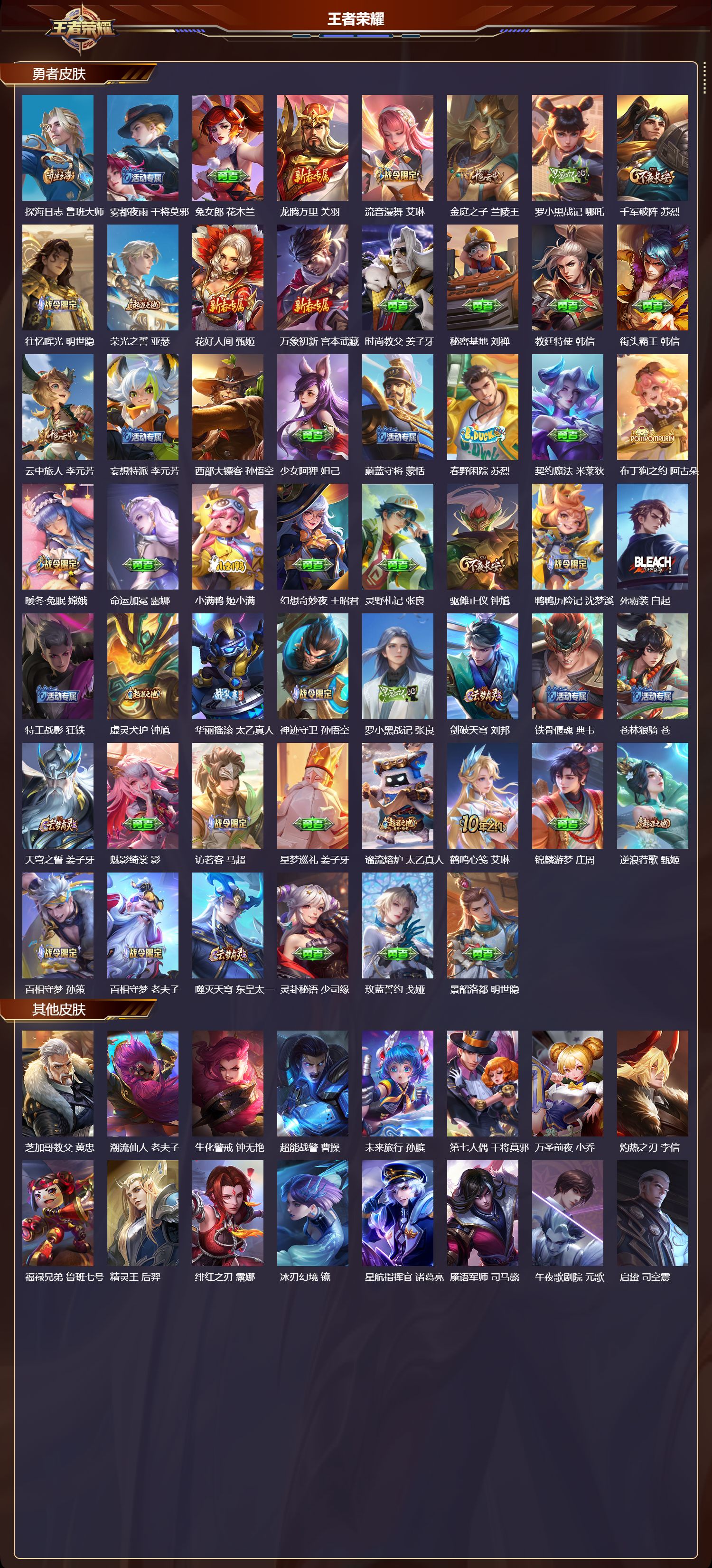 安卓qq/非凡王者/237皮肤/126英雄/1典藏/0珍品无双/0无双/0珍品传说/5传说/74史诗/8稀有英雄【1 典藏皮肤】弑呛猎影 韩信【5 传说皮肤】地狱之眼 宫本武藏时雨天司 诸葛亮天魔缭乱 吕布愿照·九州拓 澜鸣野蒿 桑启【74 史诗皮肤】蔬乡物语 鲁班七号紫霞仙子 露娜高山流水 庄周暗渊魔法 司马懿天秀·启明 杨戬妄想食味 姬小满山海·玄木