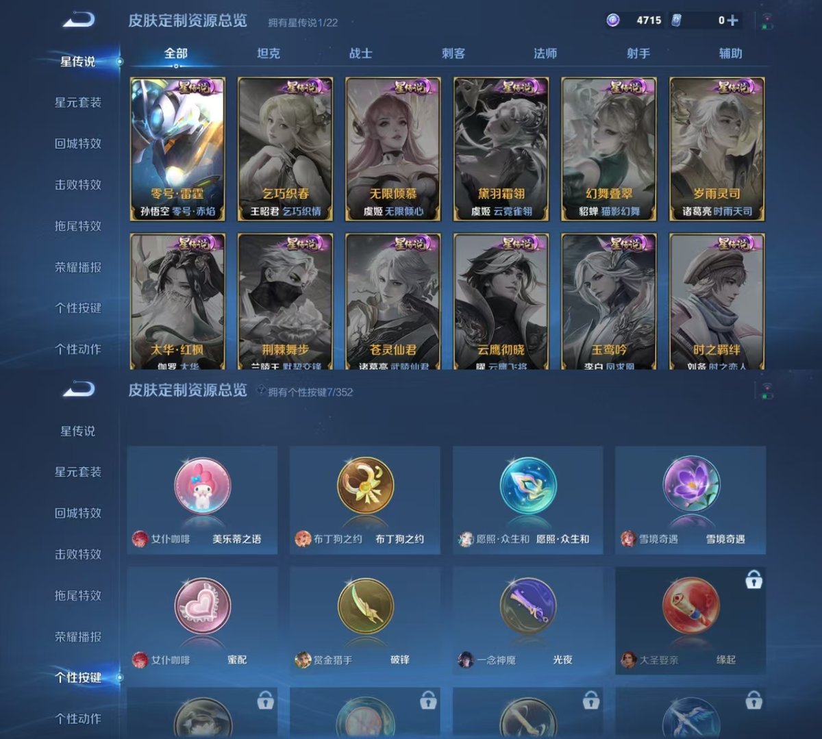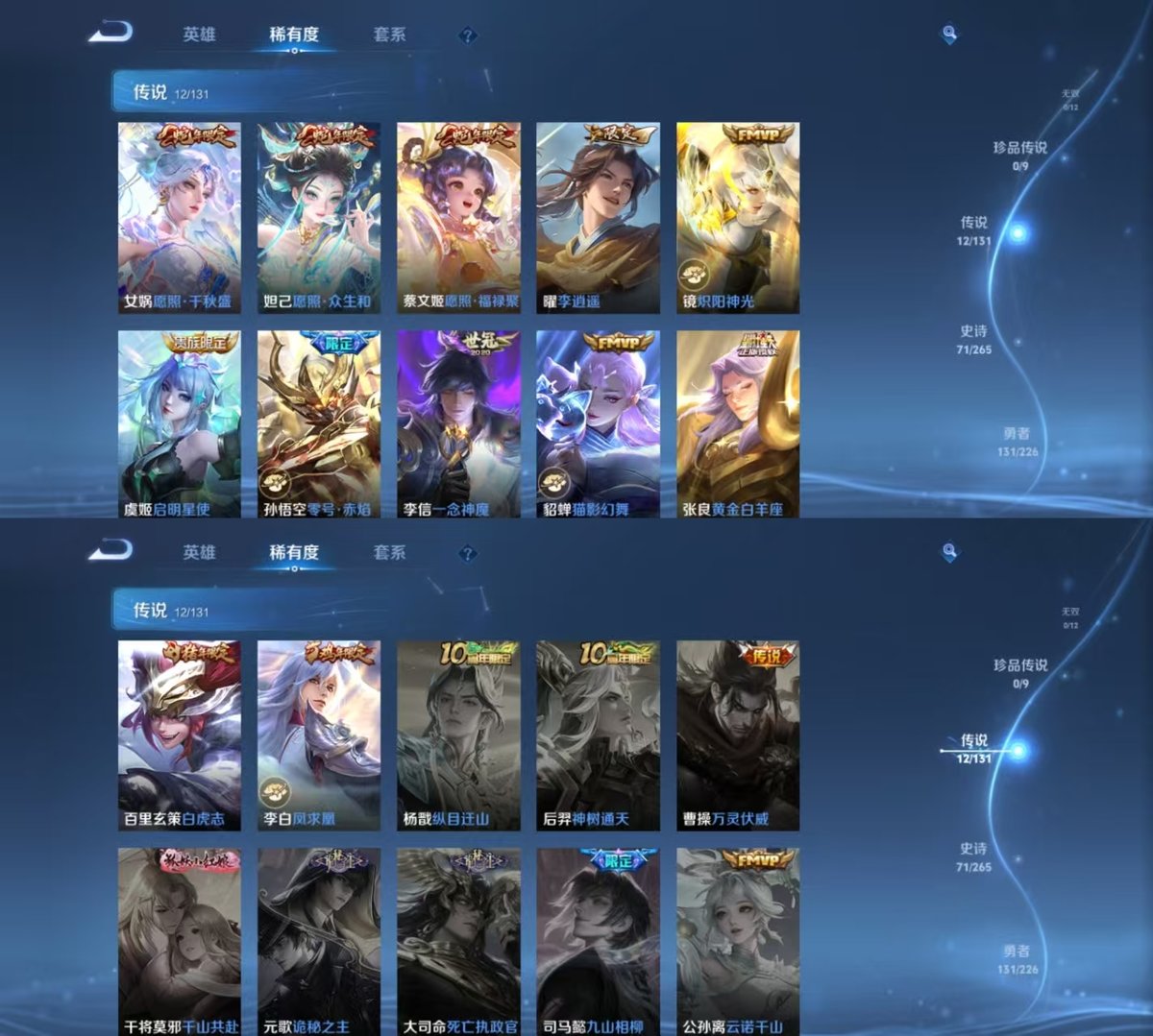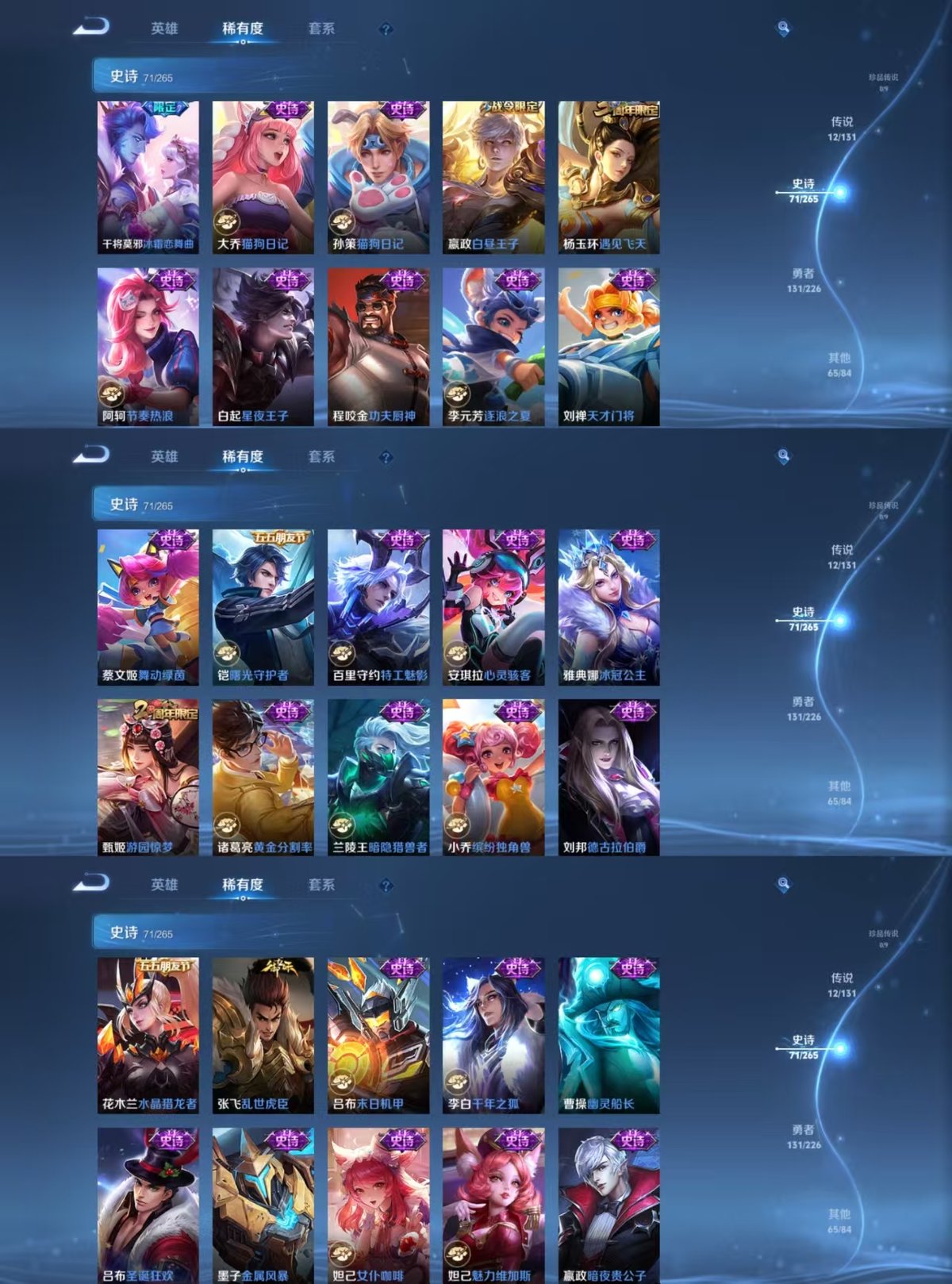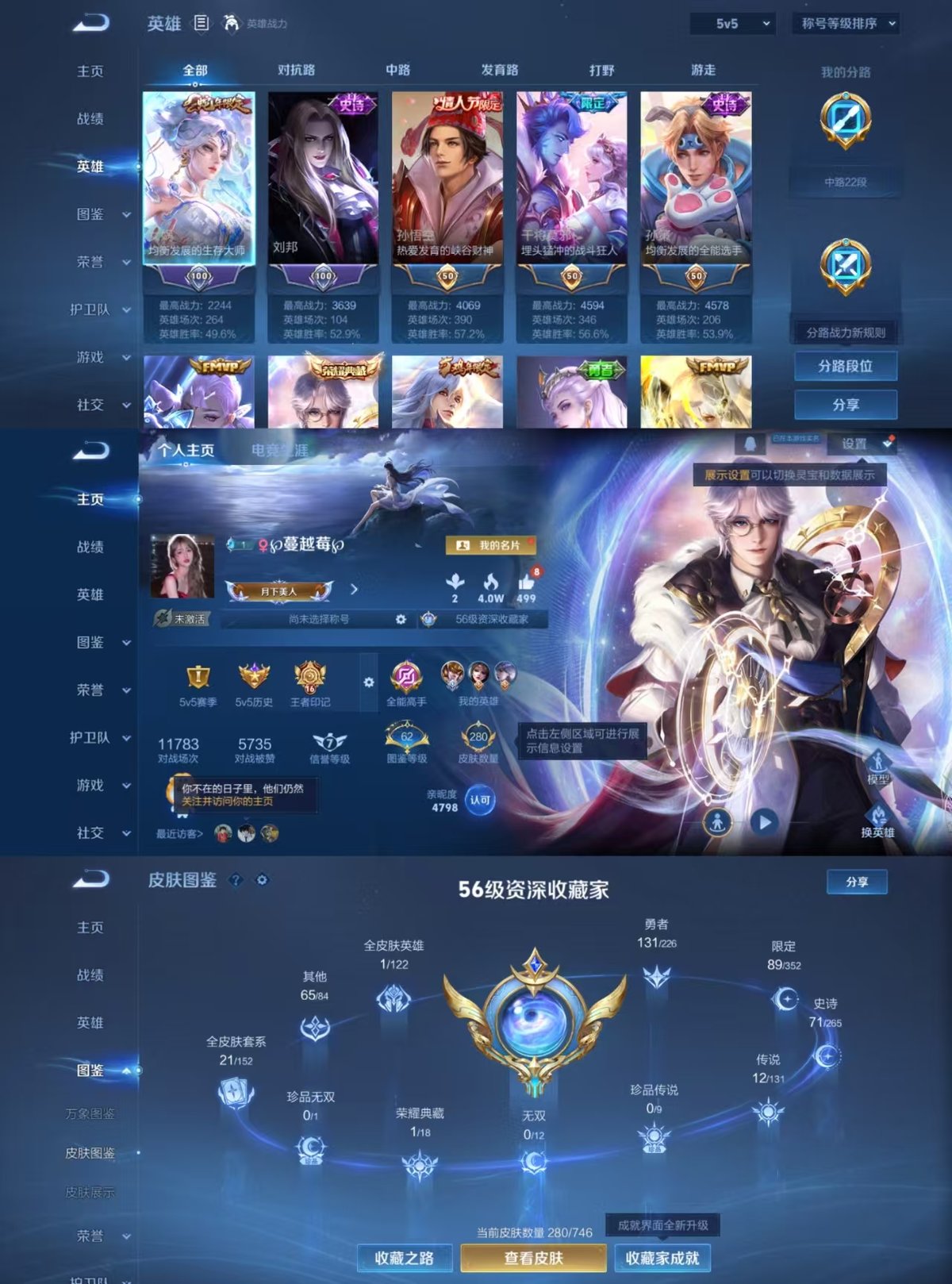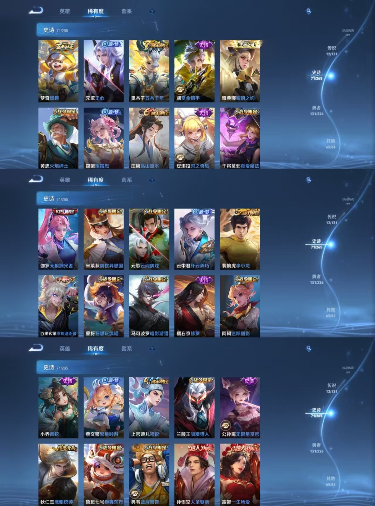 2283440-实名: 可修改 贵族等级: v8 英雄数: 126 皮肤数: 280 荣耀水晶: 星域神启 传说皮: 黄金白羊座猫影幻舞炽阳神光一念神魔零号·赤焰李 限定皮: 遇见飞天李小龙游园惊梦梁祝天狼溯光者冰霜恋舞曲凤求凰白虎志一生所爱大圣娶亲高山流水五谷丰年愿照·千秋盛愿照·众生和愿照·福禄聚