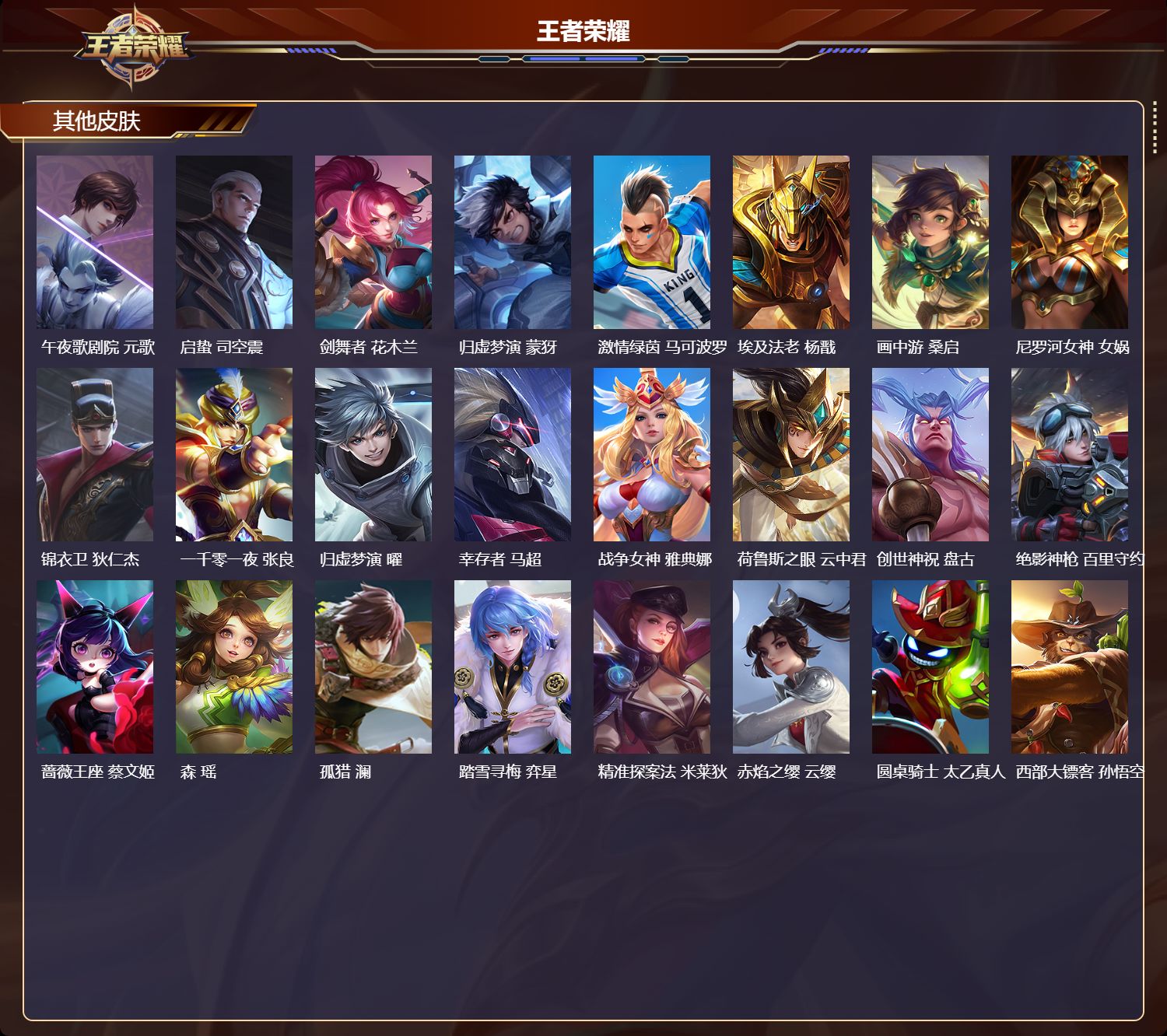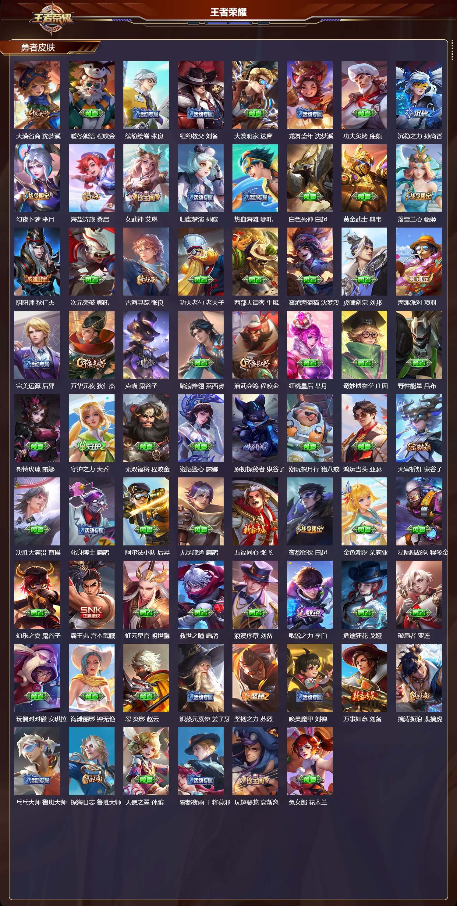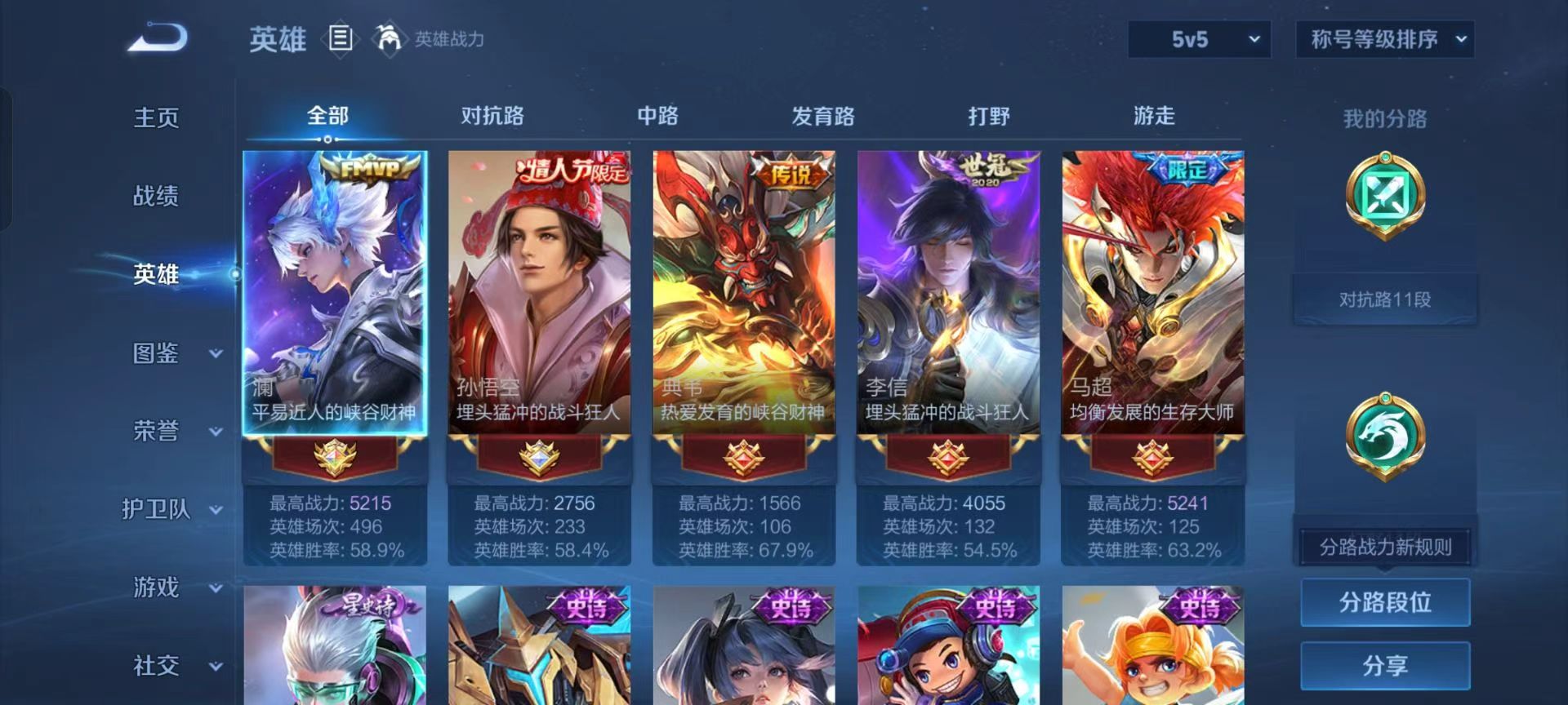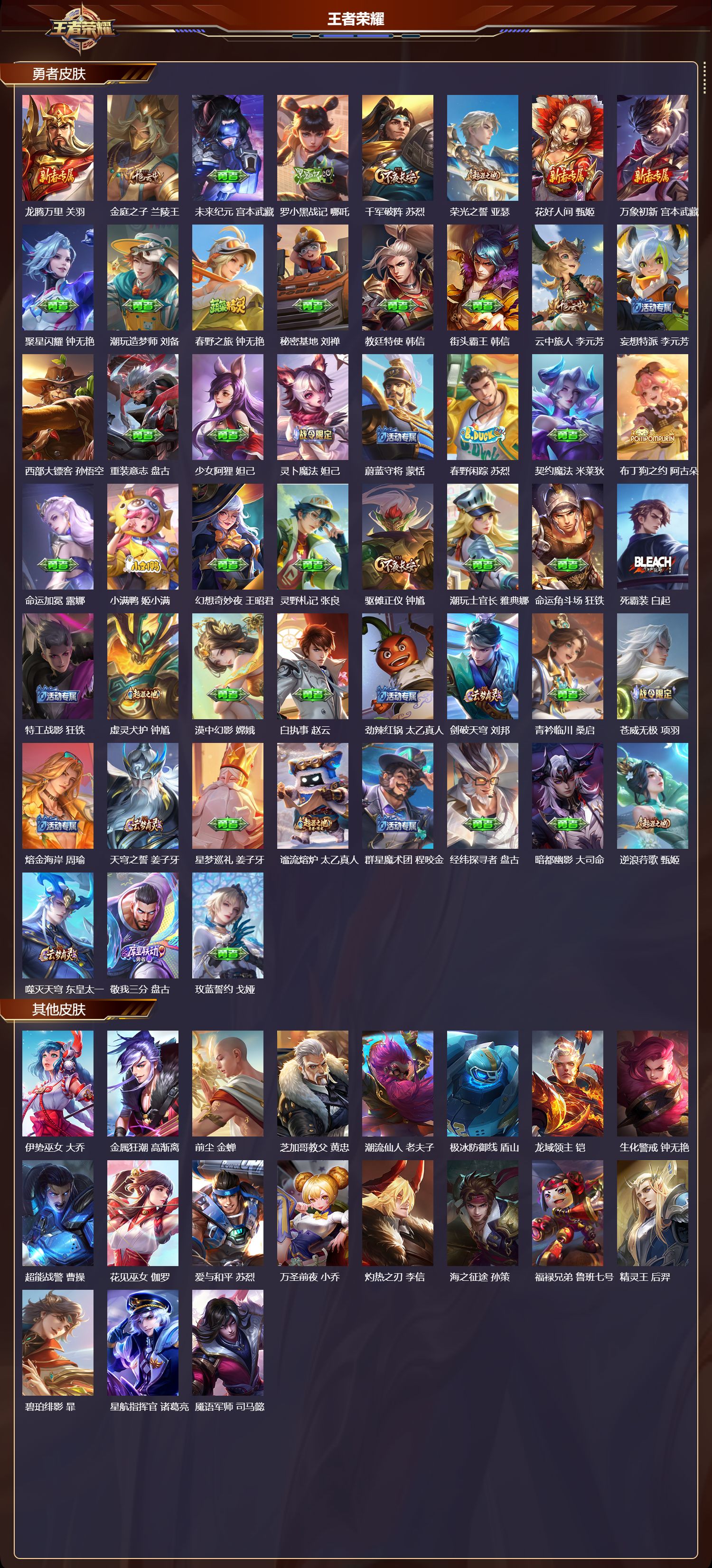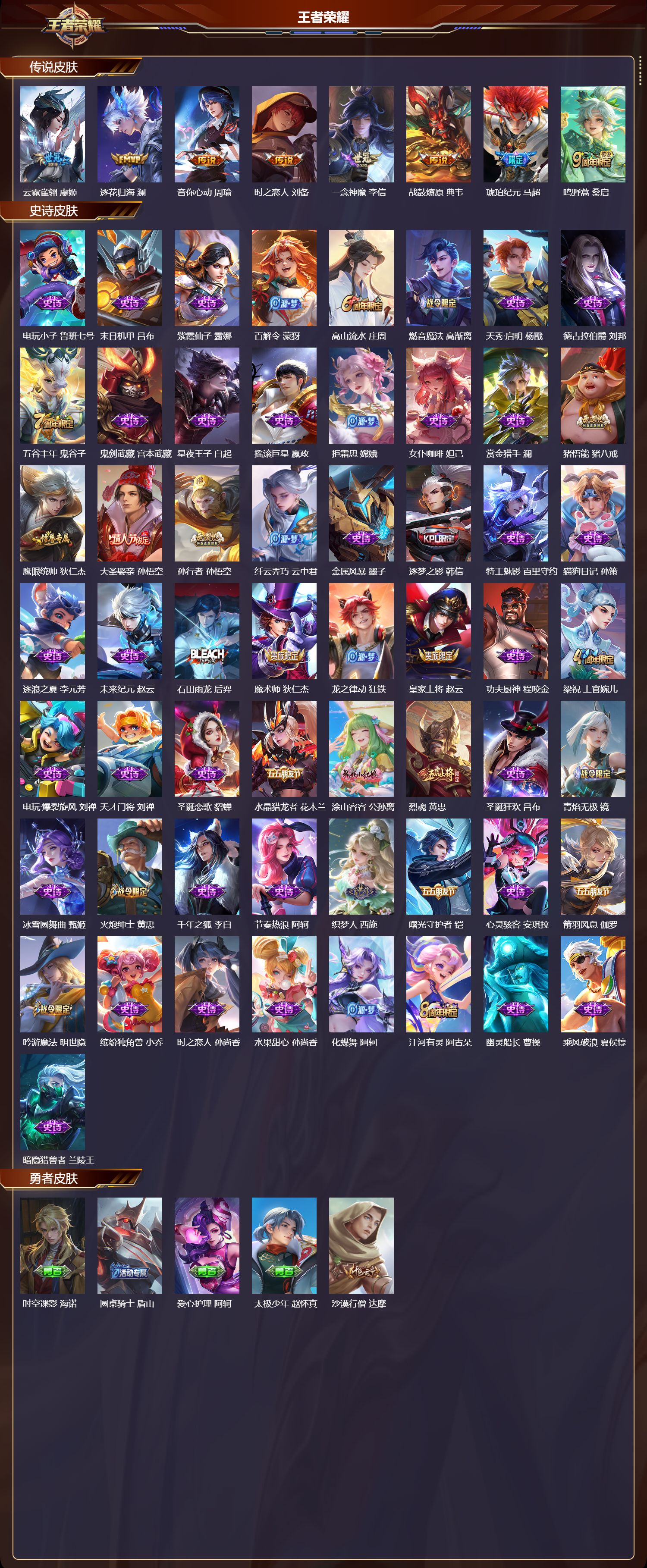 安卓qq/荣耀王者/233皮肤/127英雄/0典藏/0珍品无双/0无双/0珍品传说/8传说/57史诗/9稀有英雄【8 传说皮肤】云霓雀翎 虞姬逐花归海 澜音你心动 周瑜时之恋人 刘备一念神魔 李信战鼓燎原 典韦琥珀纪元 马超鸣野蒿 桑启【57 史诗皮肤】电玩小子 鲁班七号末日机甲 吕布紫霞仙子 露娜百解令 蒙犽高山流水 庄周燃音魔法 高渐离天秀·启明
