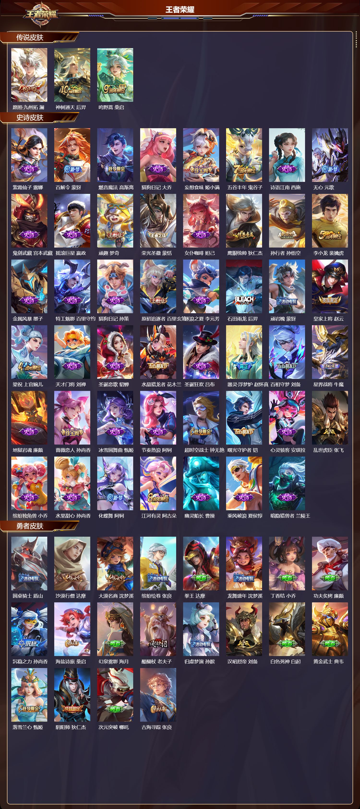 安卓qq/永恒钻石/187皮肤/122英雄/0典藏/0珍品无双/0无双/0珍品传说/3传说/47史诗/7稀有英雄【3 传说皮肤】愿照·九州拓 澜神树通天 后羿鸣野蒿 桑启【47 史诗皮肤】紫霞仙子 露娜百解令 蒙犽燃音魔法 高渐离猫狗日记 大乔妄想食味 姬小满五谷丰年 鬼谷子诗语江南 西施无心 元歌鬼剑武藏 宫本武藏摇滚巨星 嬴政顽趣 梦奇荣光圣徽