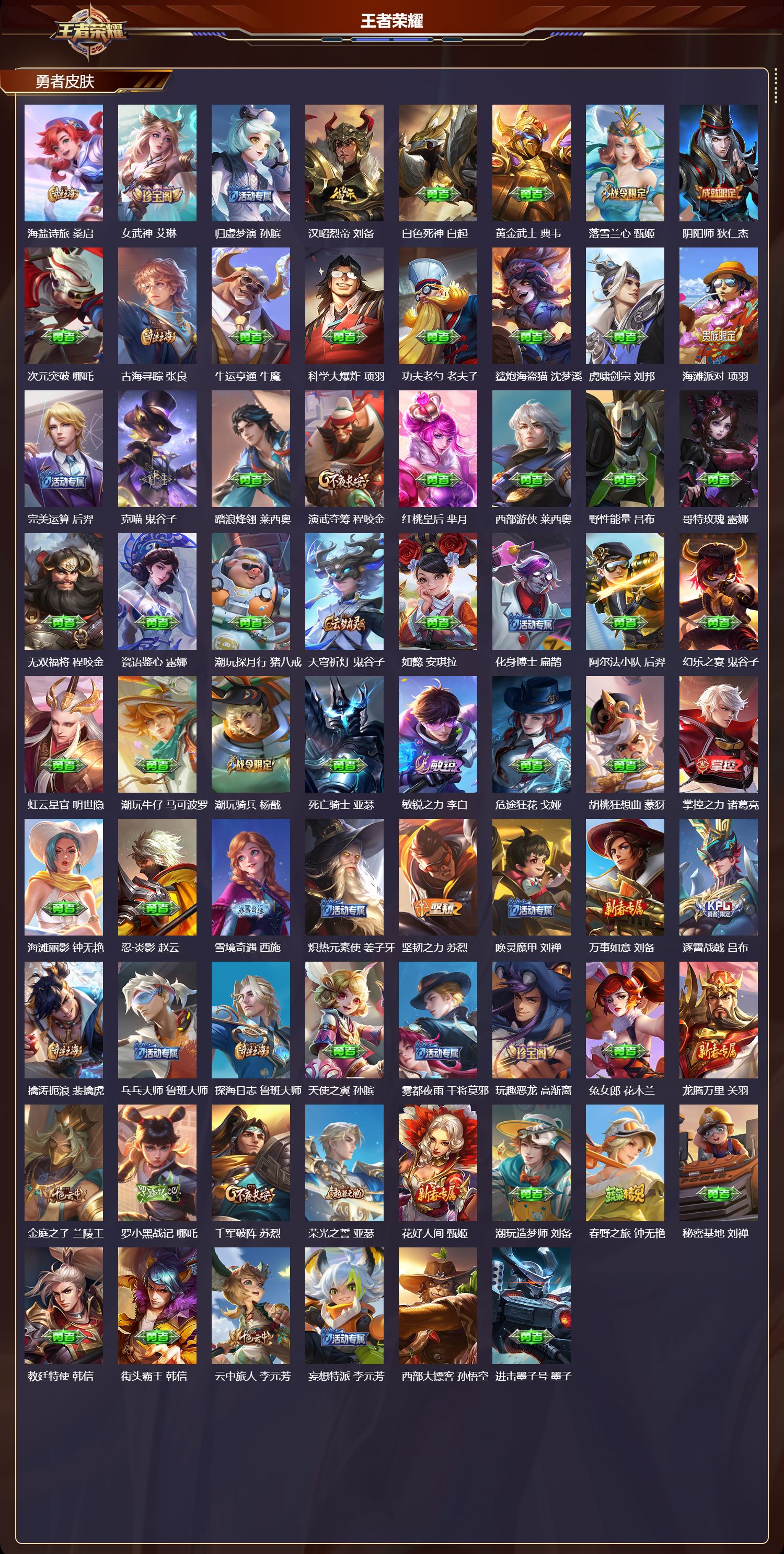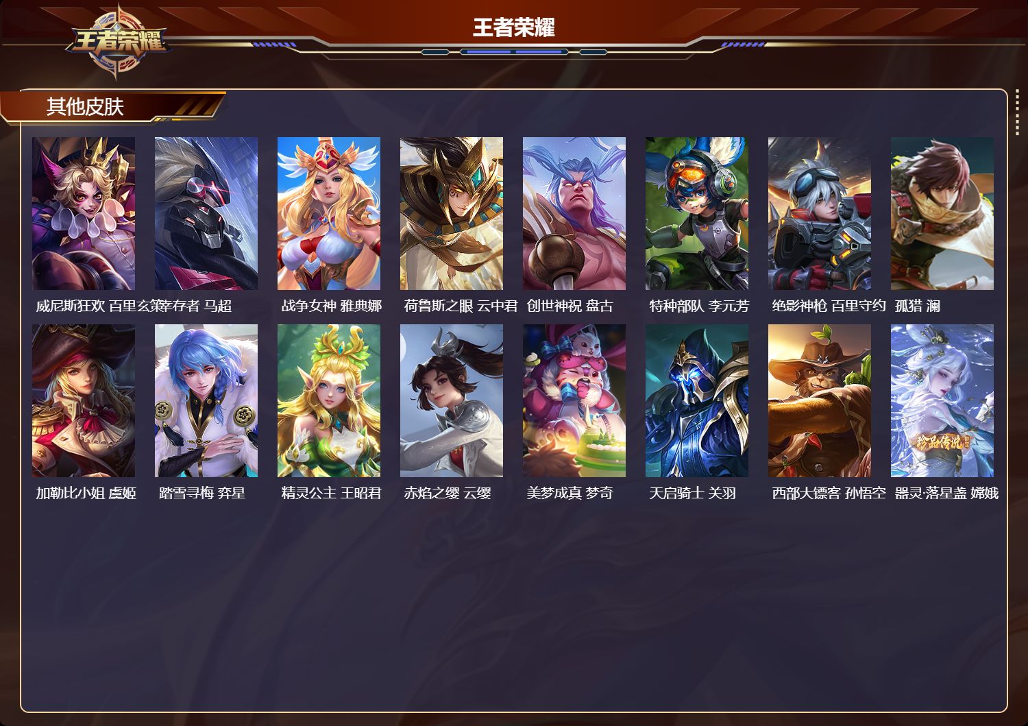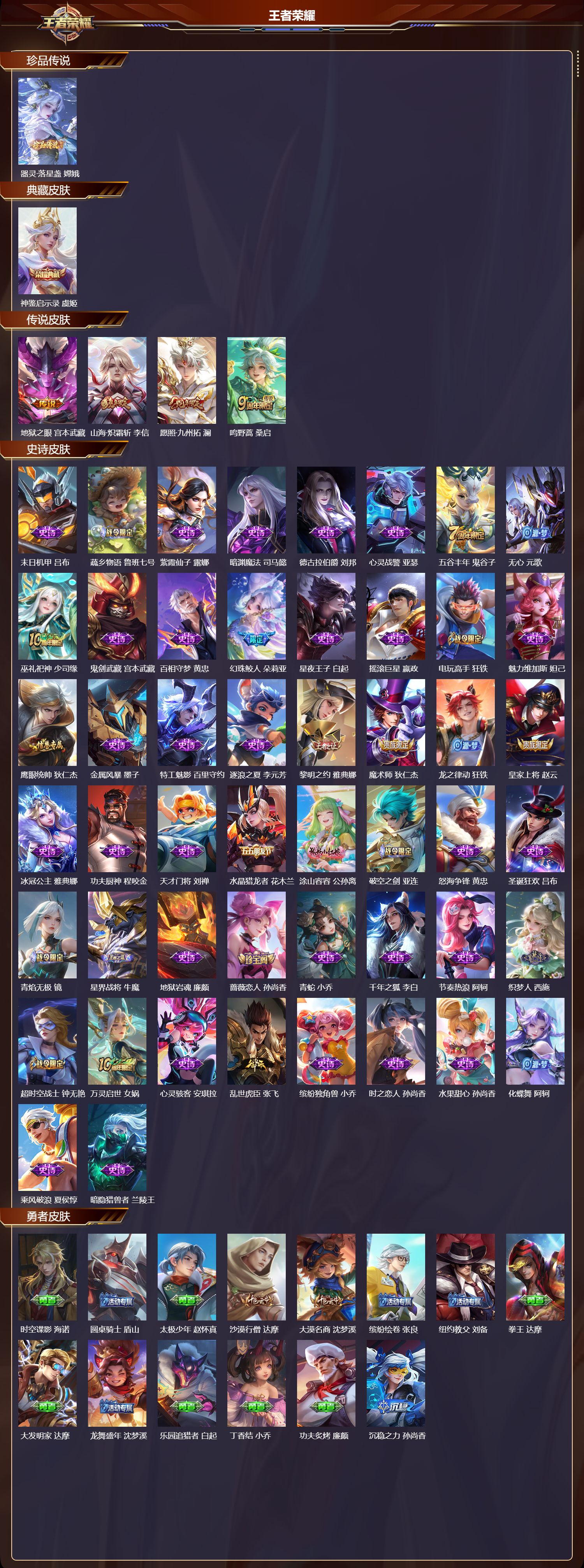 安卓qq/无双王者/224皮肤/127英雄/1典藏/0珍品无双/0无双/1珍品传说/4传说/50史诗/9稀有英雄【1 珍品传说】器灵·落星盏 嫦娥【1 典藏皮肤】神鉴启示录 虞姬【4 传说皮肤】地狱之眼 宫本武藏山海·炽霜斩 李信愿照·九州拓 澜鸣野蒿 桑启【50 史诗皮肤】末日机甲 吕布蔬乡物语 鲁班七号紫霞仙子 露娜暗渊魔法 司马懿德古拉伯爵 刘邦心灵