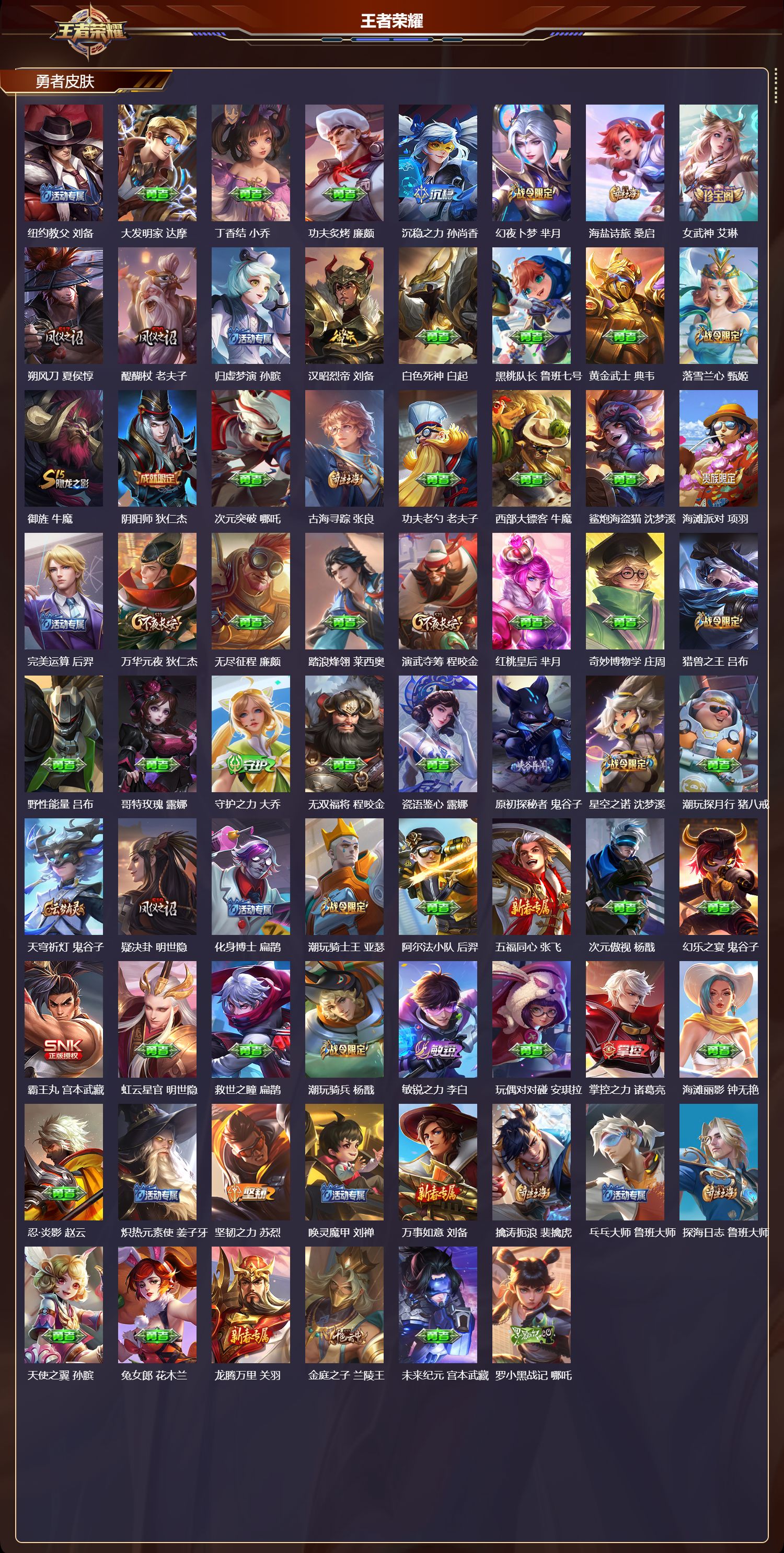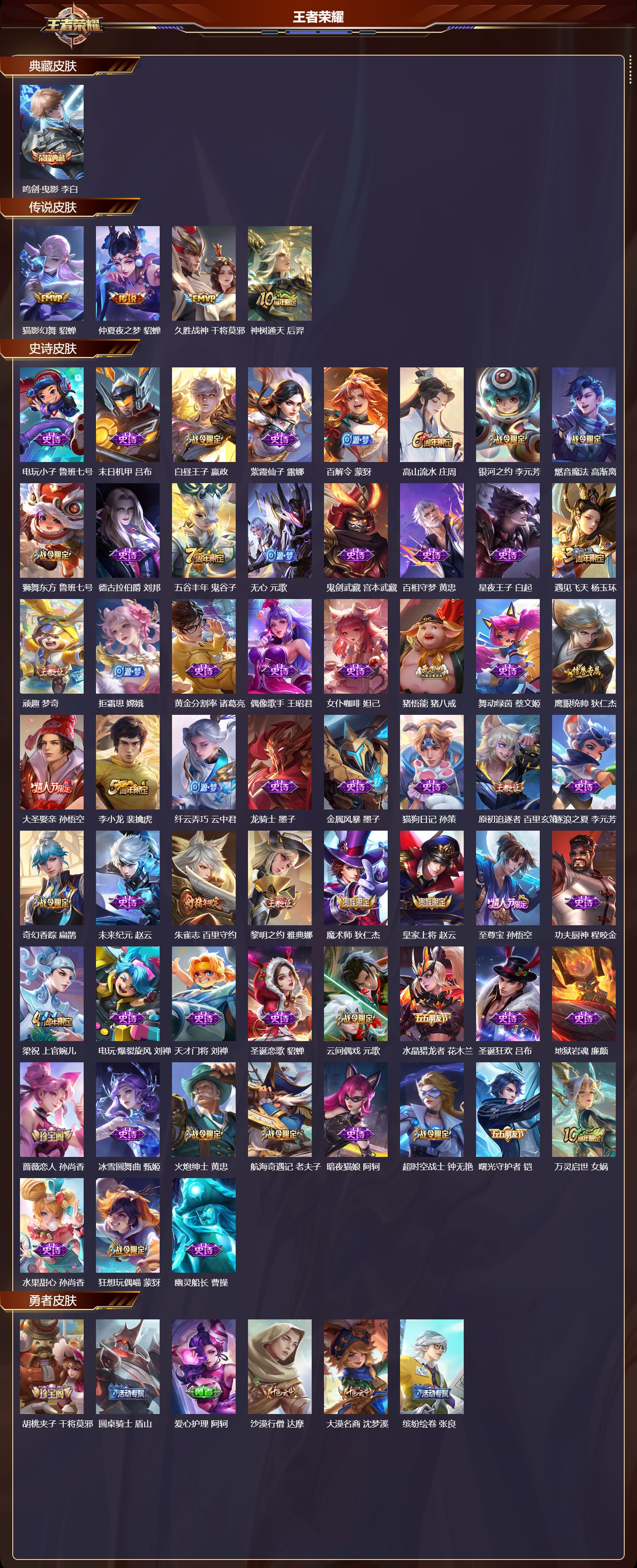 安卓qq/至尊星耀/236皮肤/125英雄/1典藏/0珍品无双/0无双/0珍品传说/4传说/59史诗/7稀有英雄【1 典藏皮肤】鸣剑·曳影 李白【4 传说皮肤】猫影幻舞 貂蝉仲夏夜之梦 貂蝉久胜战神 干将莫邪神树通天 后羿【59 史诗皮肤】电玩小子 鲁班七号末日机甲 吕布白昼王子 嬴政紫霞仙子 露娜百解令 蒙犽高山流水 庄周银河之约 李元芳燃音魔法 高渐