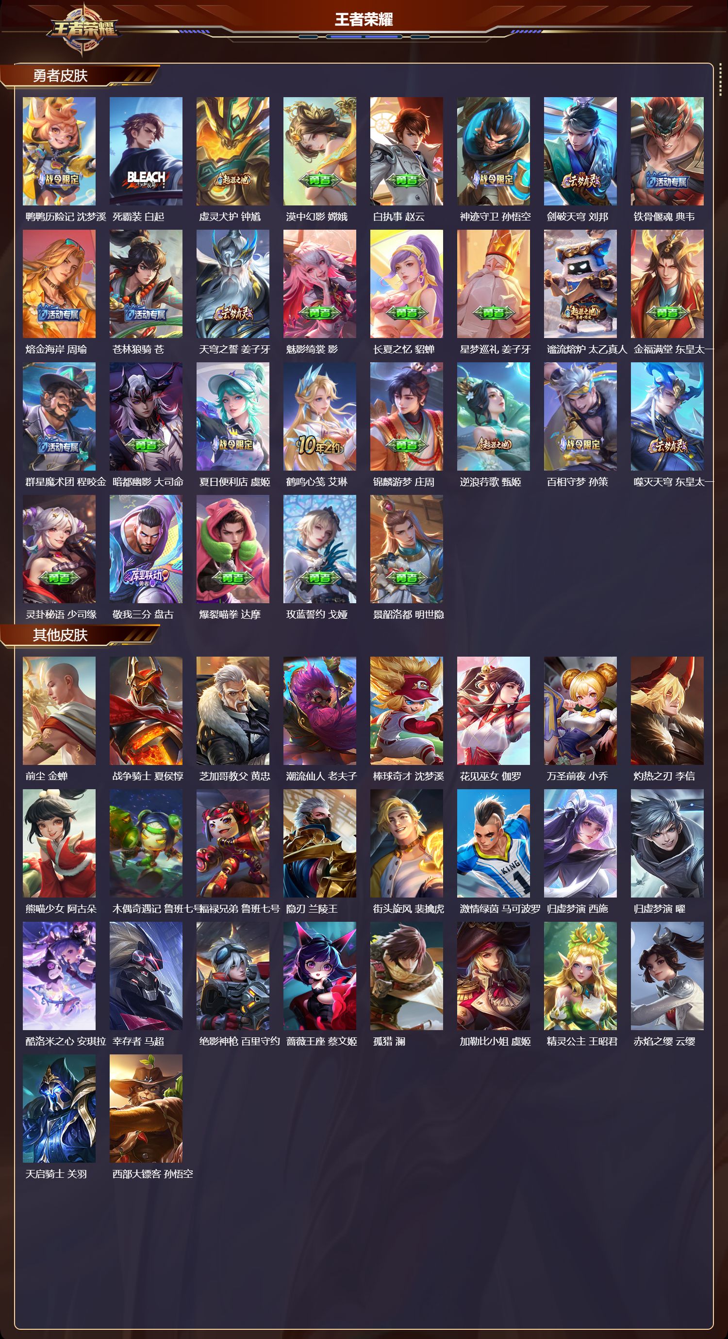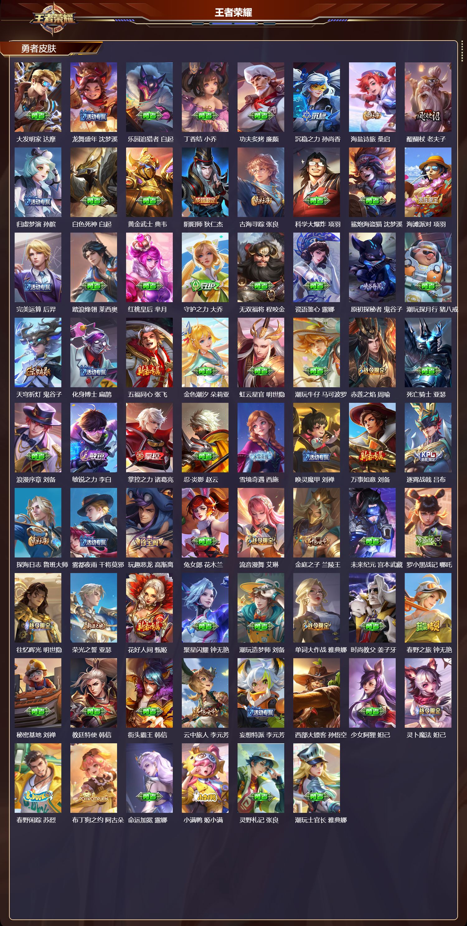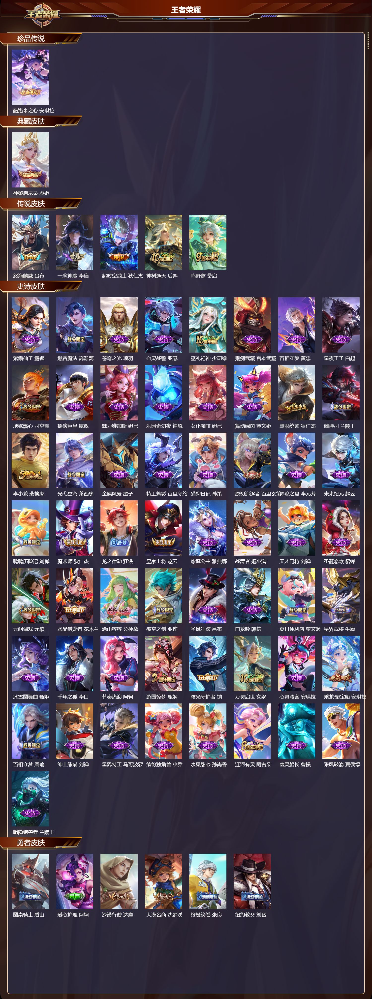安卓qq/荣耀王者/194皮肤/125英雄/1典藏/0珍品无双/0无双/1珍品传说/5传说/57史诗/7稀有英雄【1 珍品传说】酷洛米之心 安琪拉【1 典藏皮肤】神鉴启示录 虞姬【5 传说皮肤】怒海麟威 吕布一念神魔 李信超时空战士 狄仁杰神树通天 后羿鸣野蒿 桑启【57 史诗皮肤】紫霞仙子 露娜燃音魔法 高渐离苍穹之光 项羽心灵战警 亚瑟巫礼祀神 少司缘