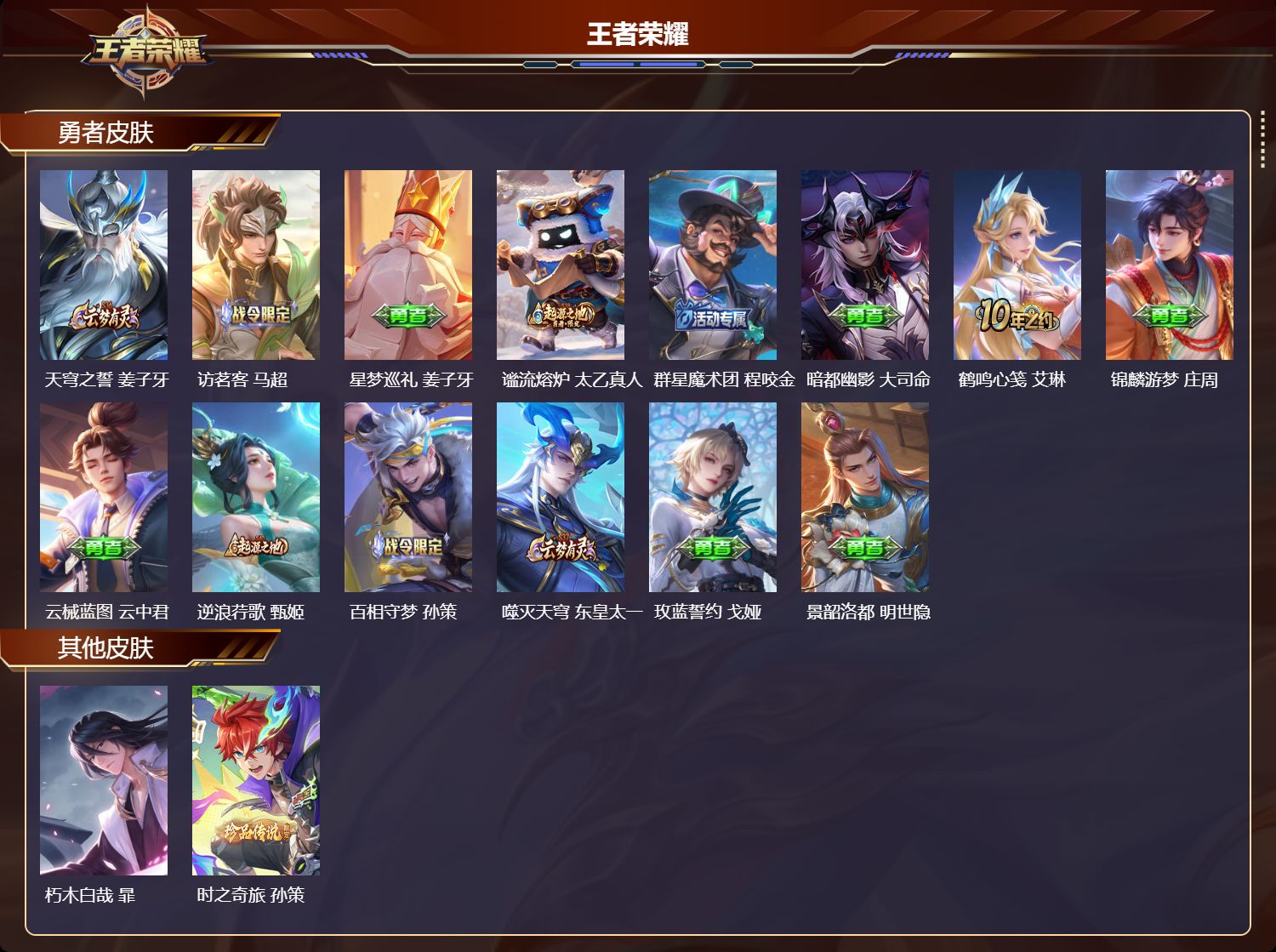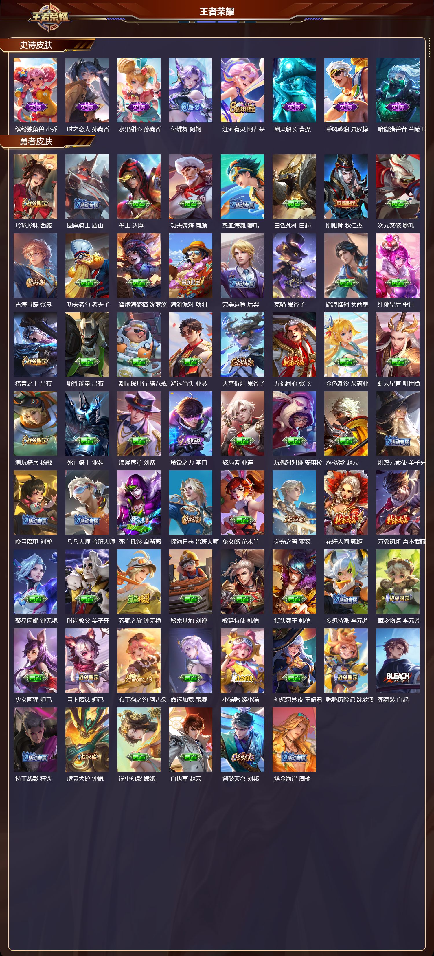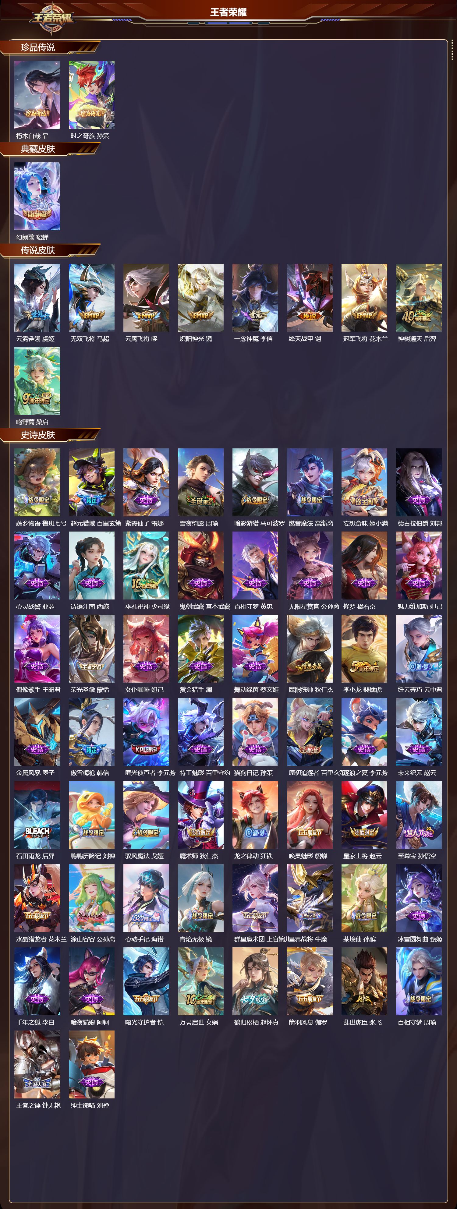 安卓qq/无双王者/183皮肤/127英雄/1典藏/0珍品无双/0无双/2珍品传说/9传说/66史诗/0稀有英雄【2 珍品传说】朽木白哉 暃时之奇旅 孙策【1 典藏皮肤】幻阙歌 貂蝉【9 传说皮肤】云霓雀翎 虞姬无双飞将 马超云鹰飞将 曜炽阳神光 镜一念神魔 李信绛天战甲 铠冠军飞将 花木兰神树通天 后羿鸣野蒿 桑启【66 史诗皮肤】蔬乡物语 鲁班七号