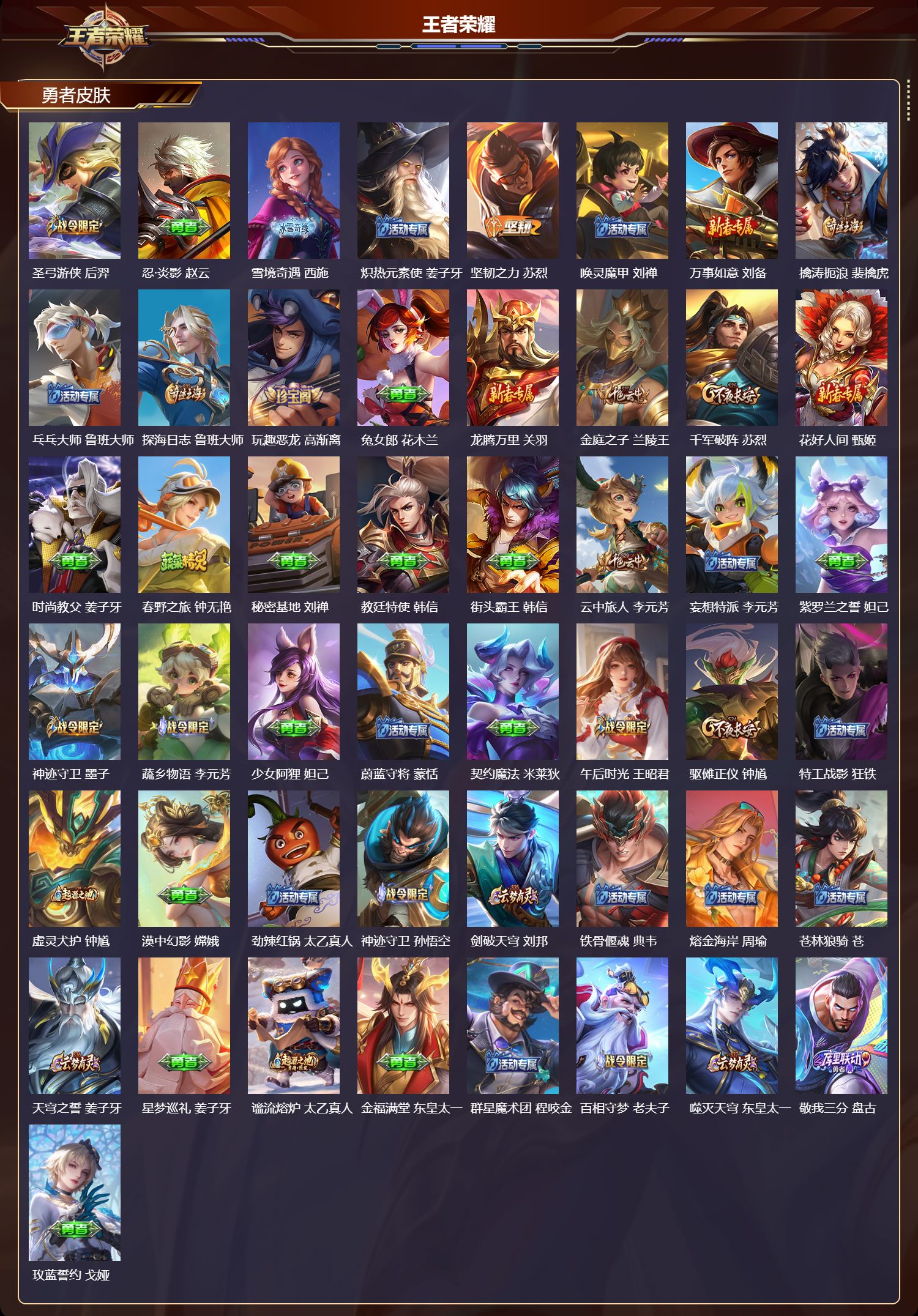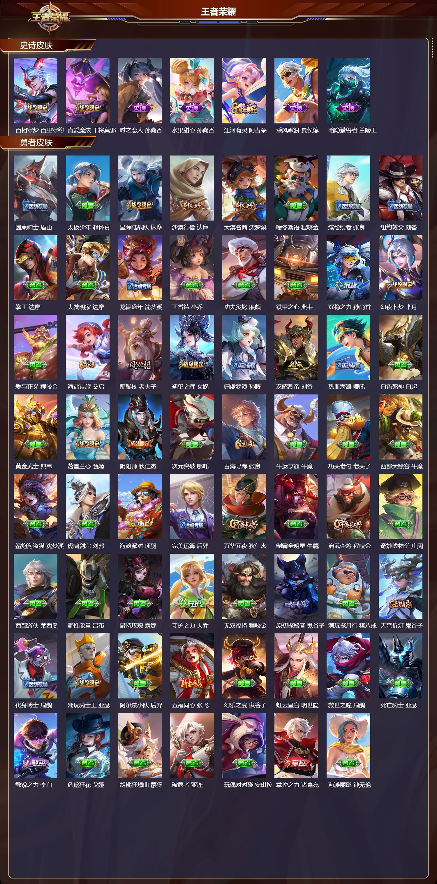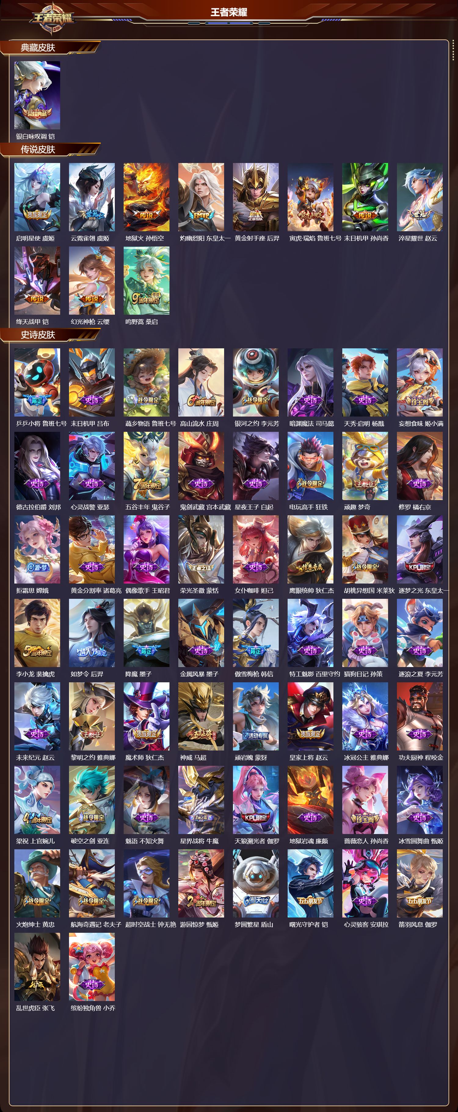 安卓qq/永恒钻石/256皮肤/123英雄/1典藏/0珍品无双/0无双/0珍品传说/11传说/65史诗/0稀有英雄【1 典藏皮肤】银白咏叹调 铠【11 传说皮肤】启明星使 虞姬云霓雀翎 虞姬地狱火 孙悟空灼幽烈阳 东皇太一黄金射手座 后羿寅虎·瑞焰 鲁班七号末日机甲 孙尚香淬星耀世 赵云绛天战甲 铠幻光神呛 云缨鸣野蒿 桑启【65 史诗皮肤】乒乒小将 鲁