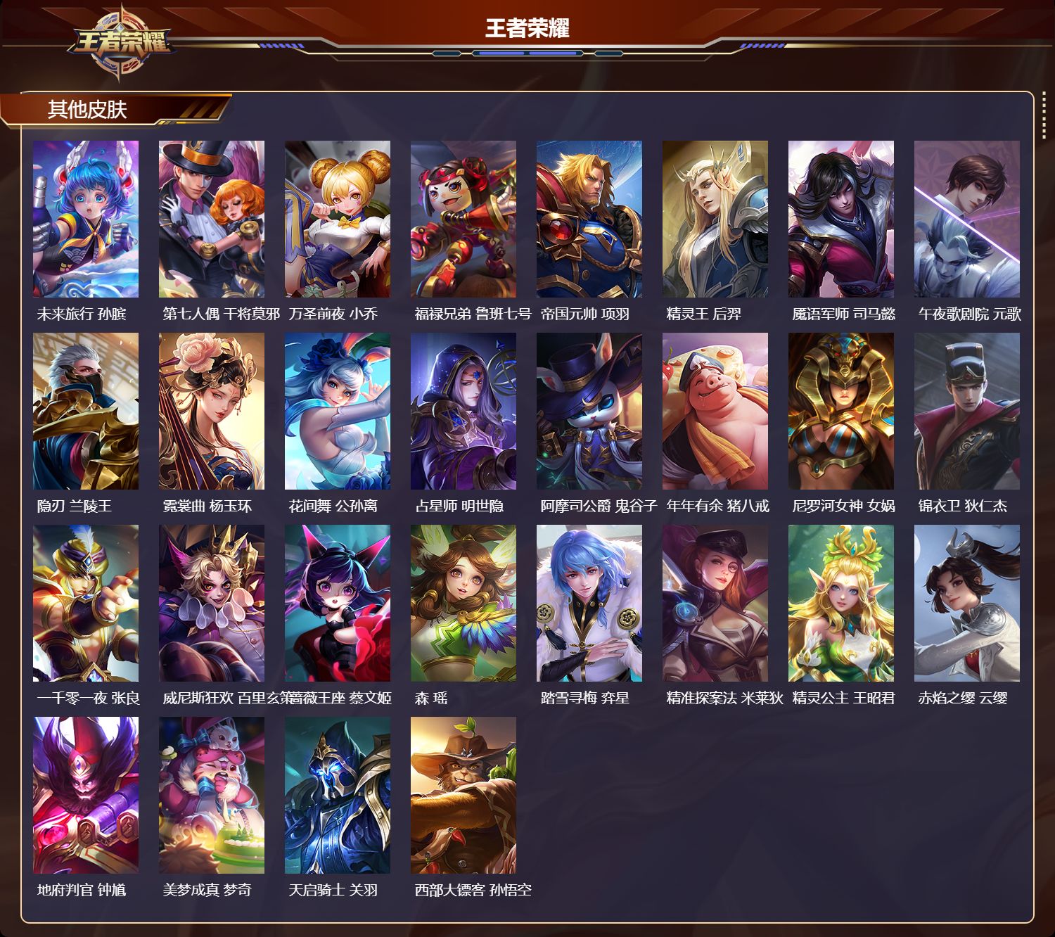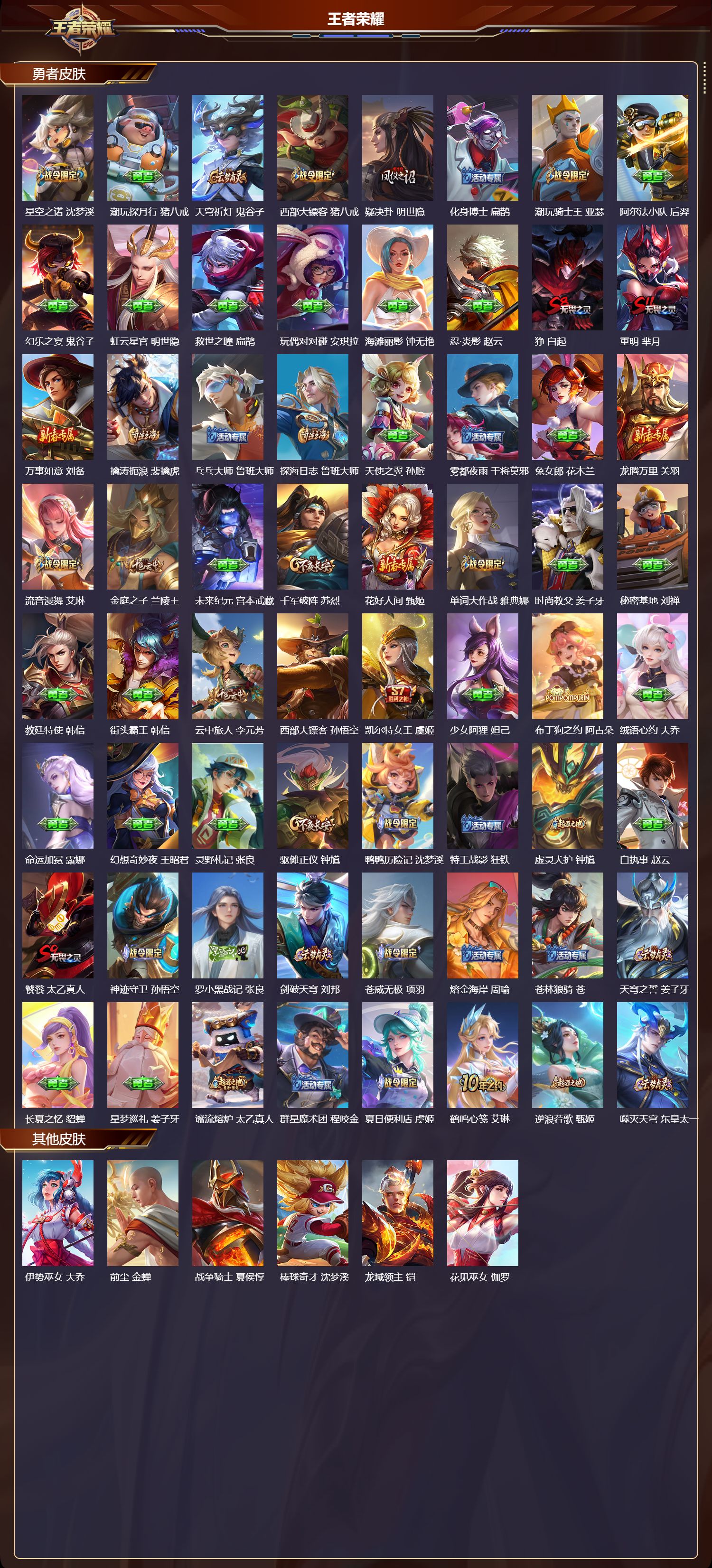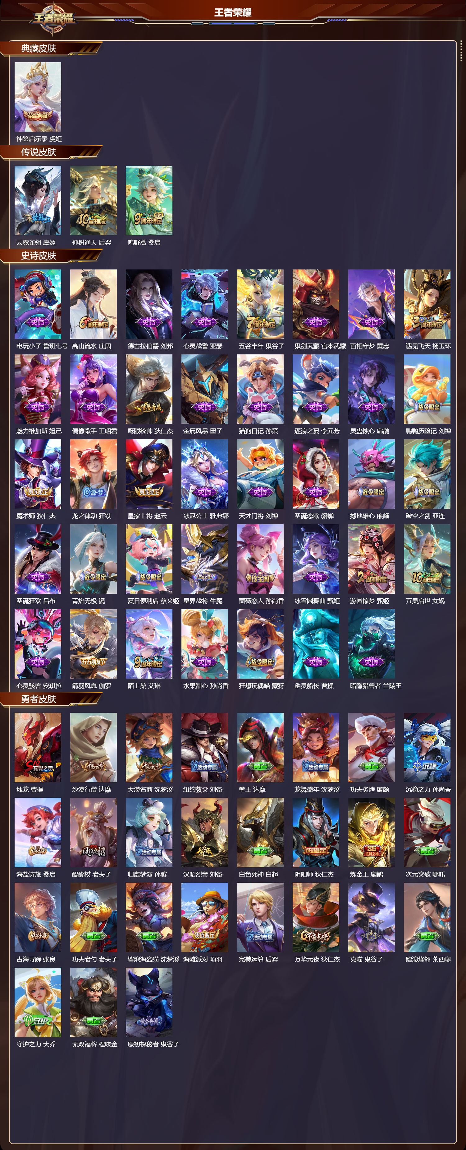 安卓qq/至尊星耀/167皮肤/125英雄/1典藏/0珍品无双/0无双/0珍品传说/3传说/39史诗/7稀有英雄【1 典藏皮肤】神鉴启示录 虞姬【3 传说皮肤】云霓雀翎 虞姬神树通天 后羿鸣野蒿 桑启【39 史诗皮肤】电玩小子 鲁班七号高山流水 庄周德古拉伯爵 刘邦心灵战警 亚瑟五谷丰年 鬼谷子鬼剑武藏 宫本武藏百相守梦 黄忠遇见飞天 杨玉环魅力维加斯