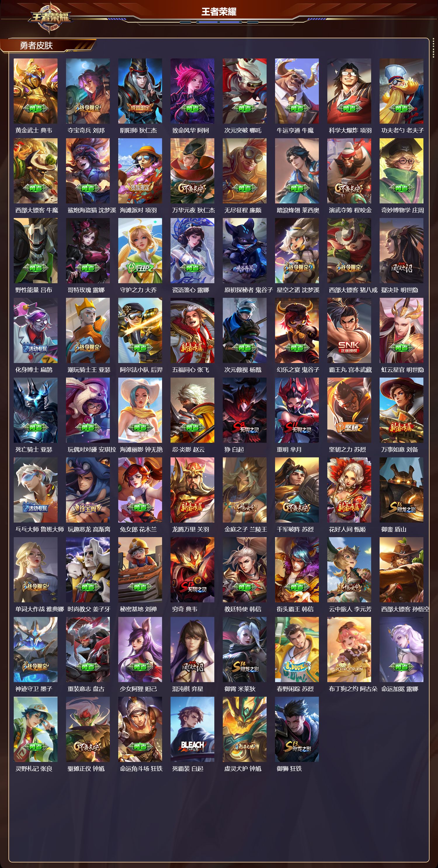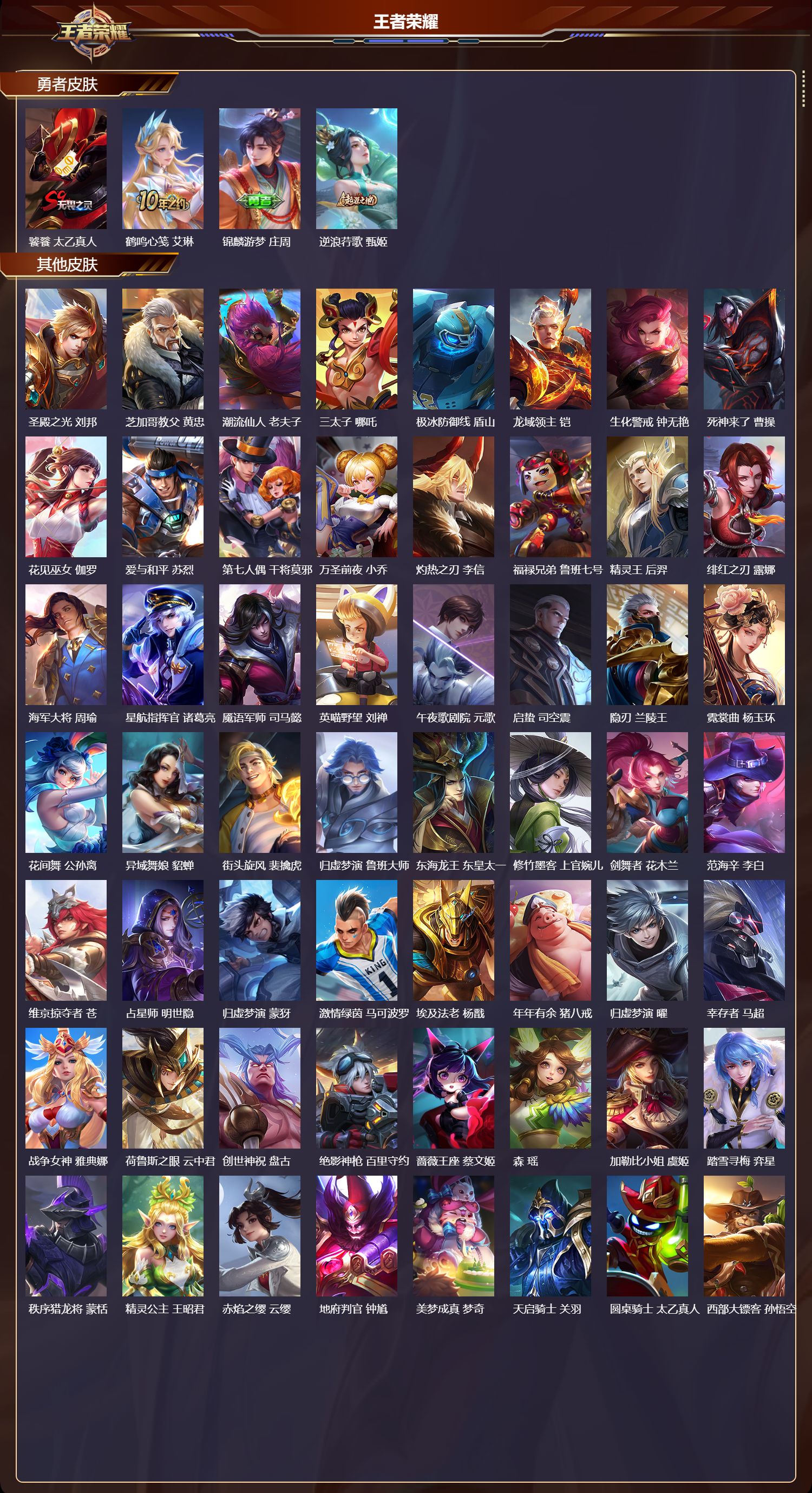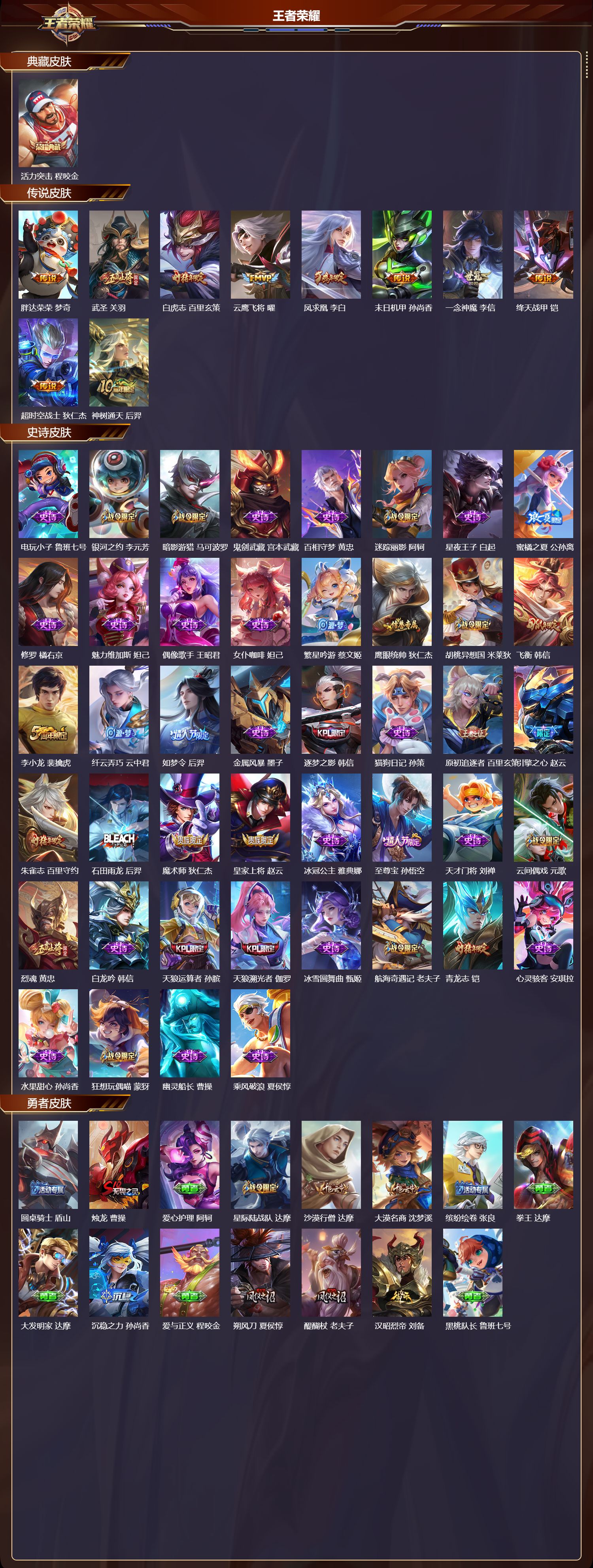 安卓qq/最强王者/199皮肤/123英雄/1典藏/0珍品无双/0无双/0珍品传说/10传说/44史诗/7稀有英雄【1 典藏皮肤】活力突击 程咬金【10 传说皮肤】胖达荣荣 梦奇武圣 关羽白虎志 百里玄策云鹰飞将 曜凤求凰 李白末日机甲 孙尚香一念神魔 李信绛天战甲 铠超时空战士 狄仁杰神树通天 后羿【44 史诗皮肤】电玩小子 鲁班七号银河之约 李元芳
