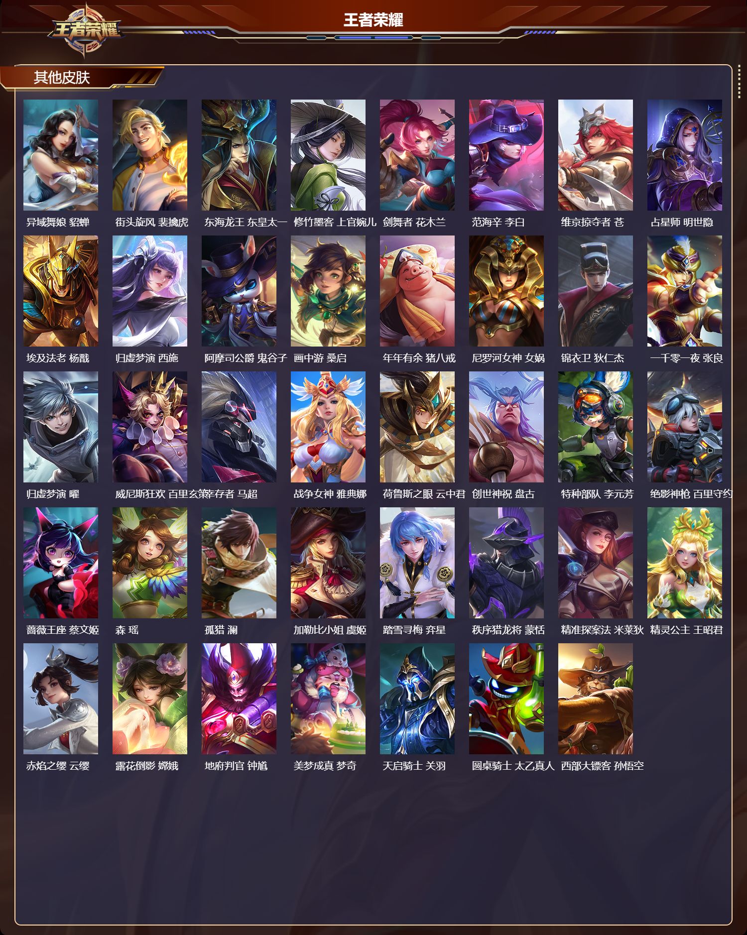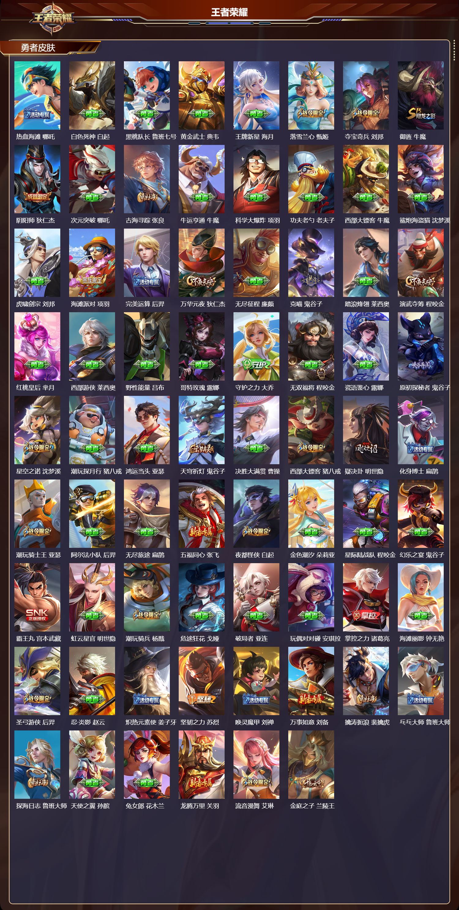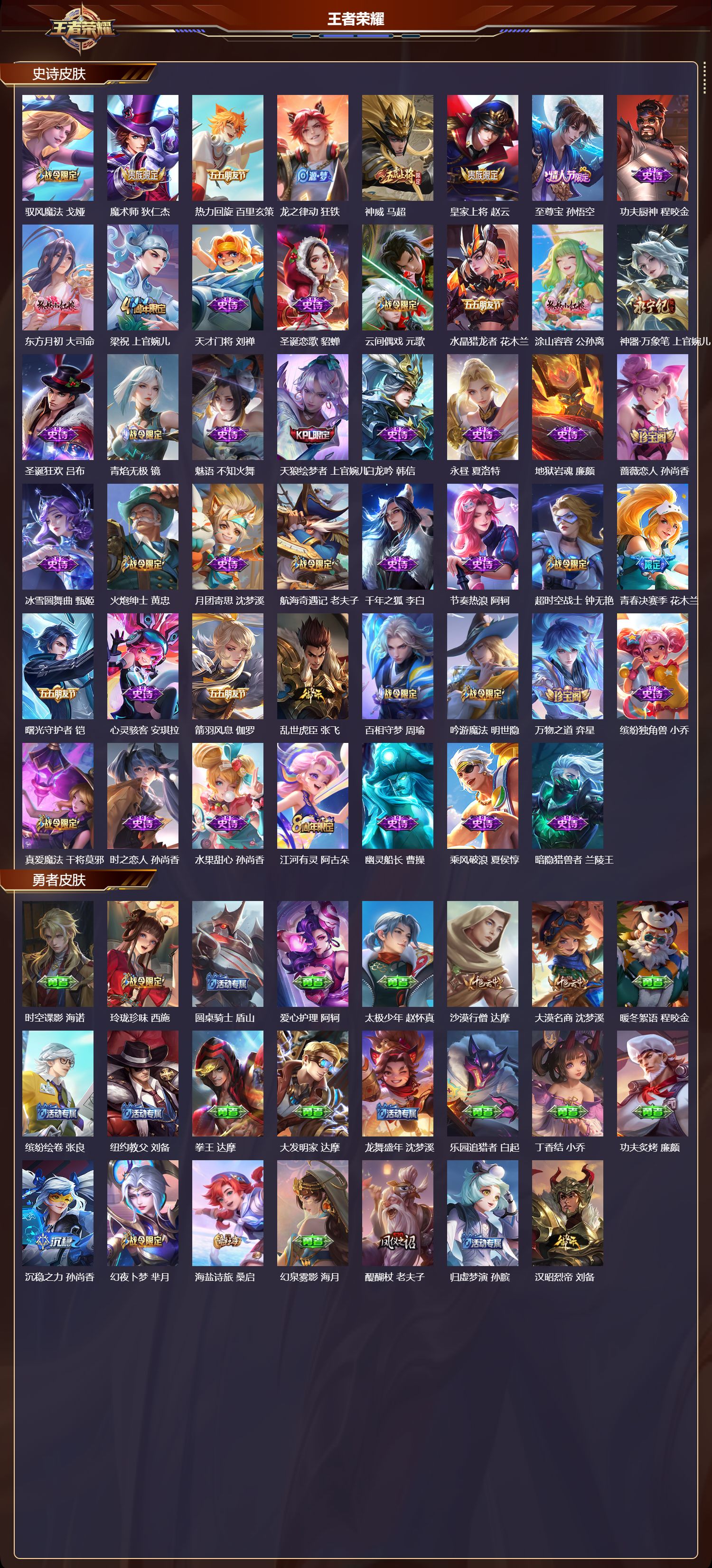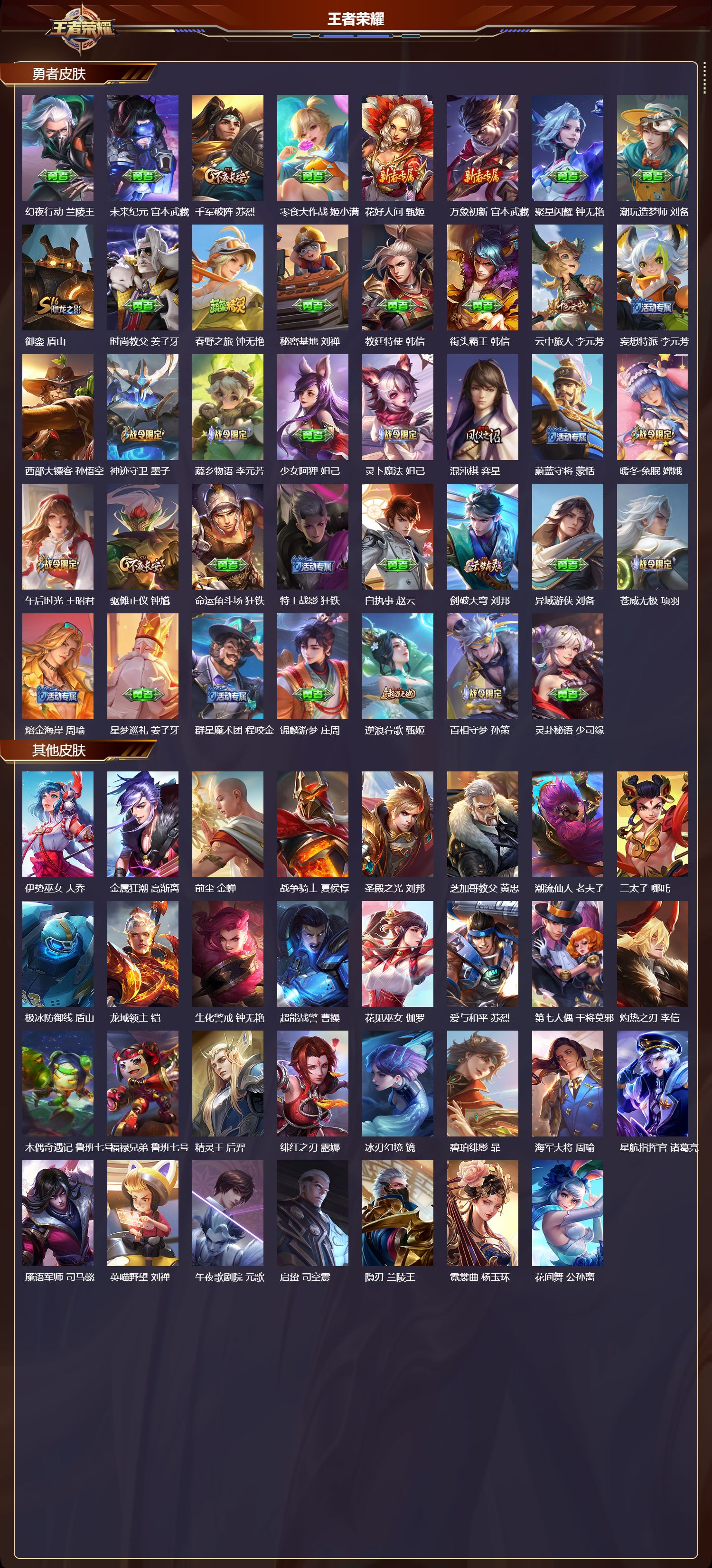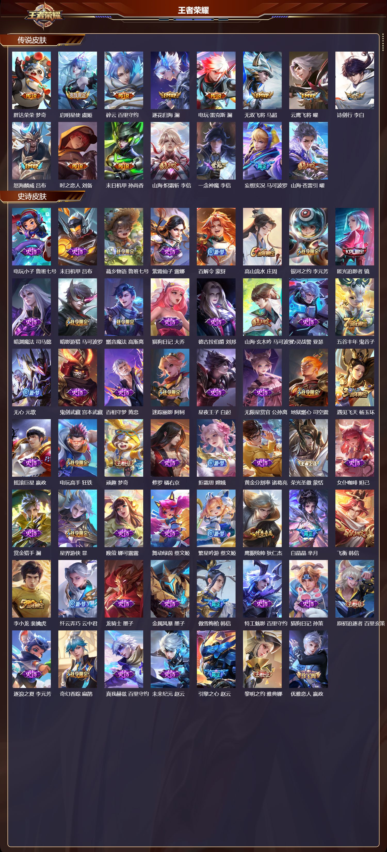 安卓qq/至尊星耀/318皮肤/127英雄/0典藏/0珍品无双/0无双/0珍品传说/15传说/102史诗/9稀有英雄【15 传说皮肤】胖达荣荣 梦奇启明星使 虞姬碎云 百里守约逐花归海 澜电玩·雷克斯 澜无双飞将 马超云鹰飞将 曜诗剑行 李白怒海麟威 吕布时之恋人 刘备末日机甲 孙尚香山海·炽霜斩 李信一念神魔 李信妄想实况 马可波罗山海·苍雷引 曜